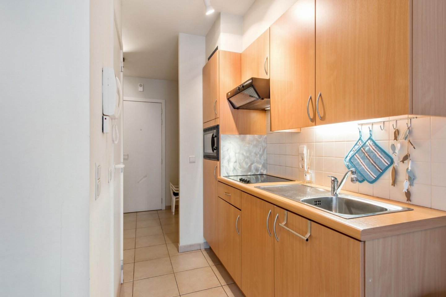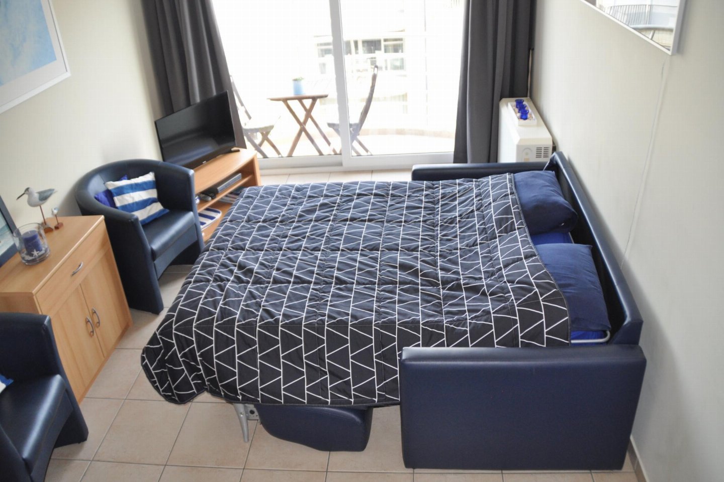 Moderne, zonnige studio op slechts 70 meter van het strand, met een balkon en zijdelings zeezicht. De studio biedt een comfortabele leefruimte, slaaphoek met dubbel opklapbed, moderne kitchenette, badkamer met douche. slaapbank(2 persoons dekbed), TV(flatscreen, digital), eettafel, zithoek), slaapnis(2-pers.