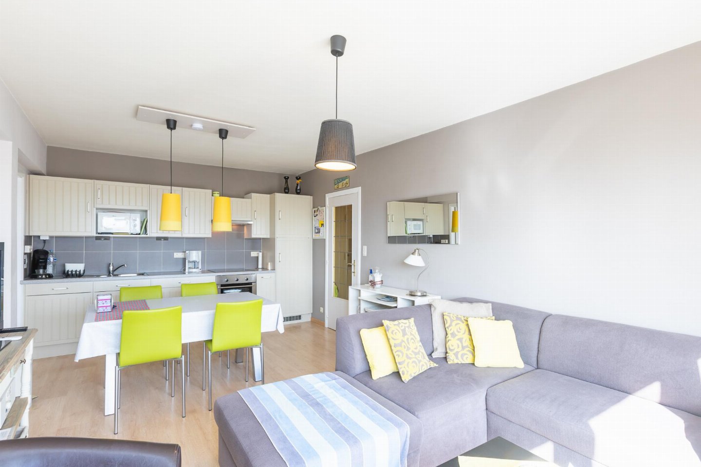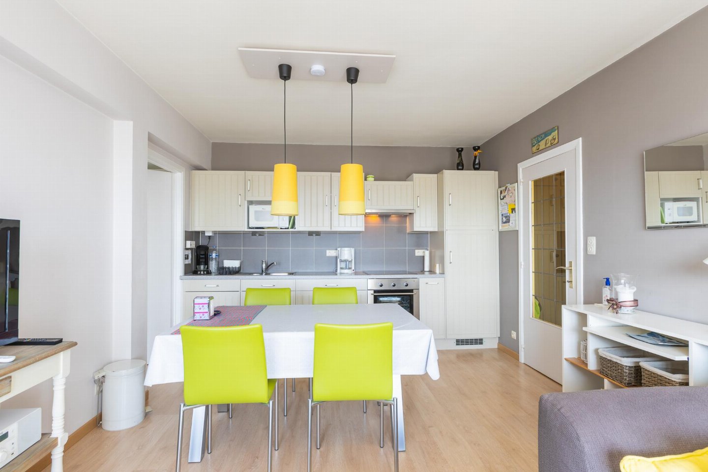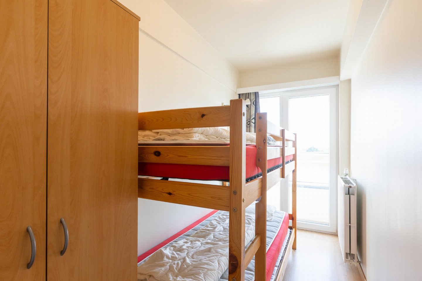 Appartement op de 4e verdieping met 2 slaapkamers: één met dubbel bed en één met stapelbed. Lichte, zonnige woonkamer met open, volledig ingerichte keuken. Recent vernieuwde badkamer met inloopdouche en apart toilet. Vanuit de kleine slaapkamer bereikt u het balkonnetje, ideaal voor een ochtendkoffie.
