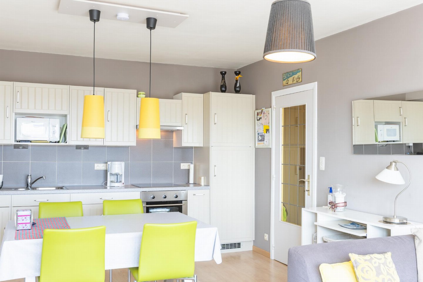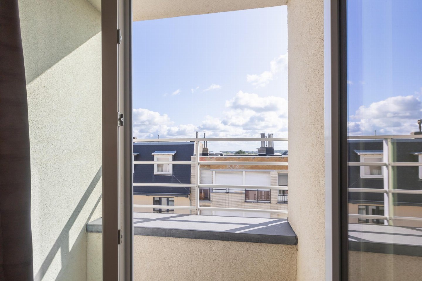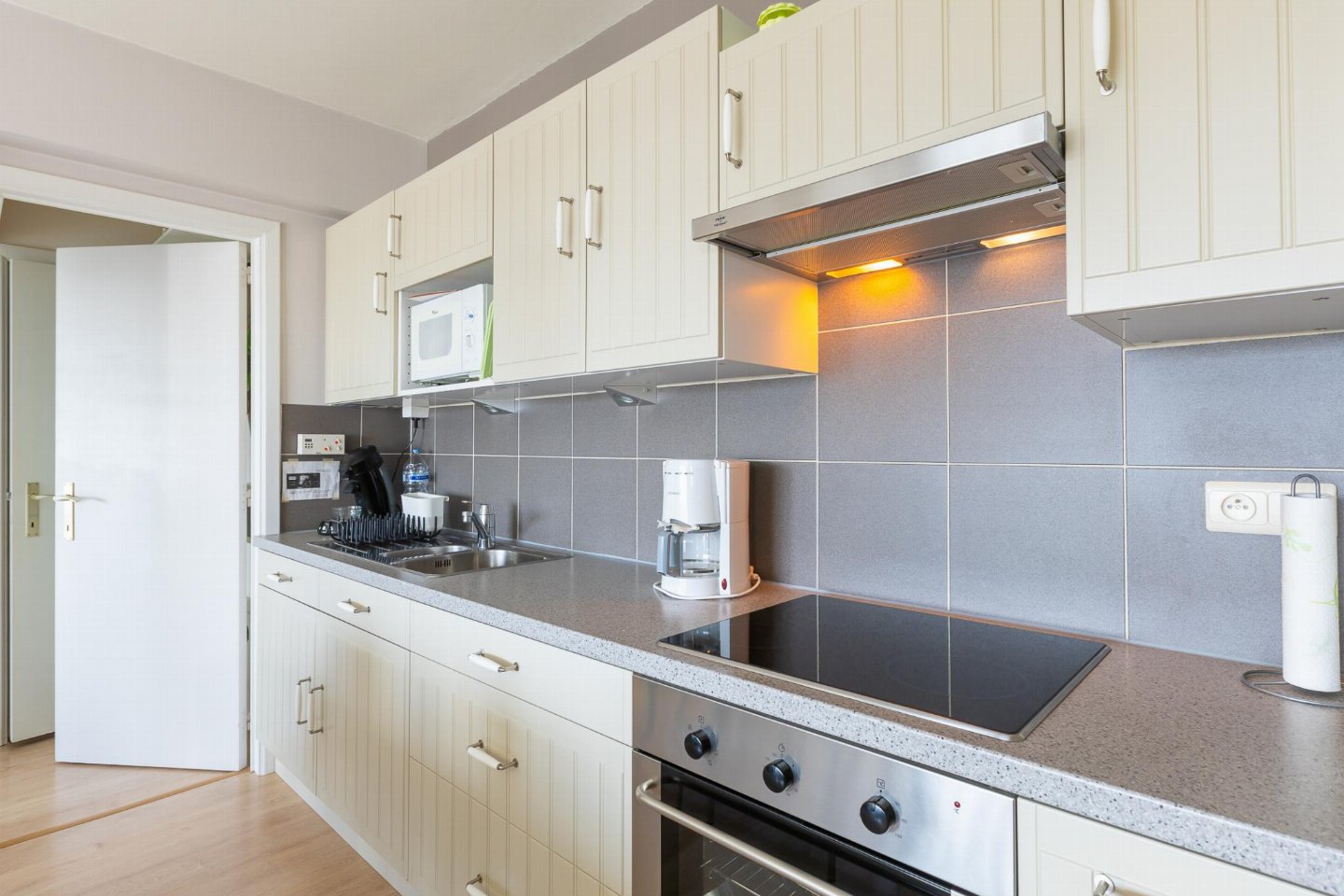 Appartement op de 4e verdieping met 2 slaapkamers: één met dubbel bed en één met stapelbed. Lichte, zonnige woonkamer met open, volledig ingerichte keuken. Recent vernieuwde badkamer met inloopdouche en apart toilet. Vanuit de kleine slaapkamer bereikt u het balkonnetje, ideaal voor een ochtendkoffie.