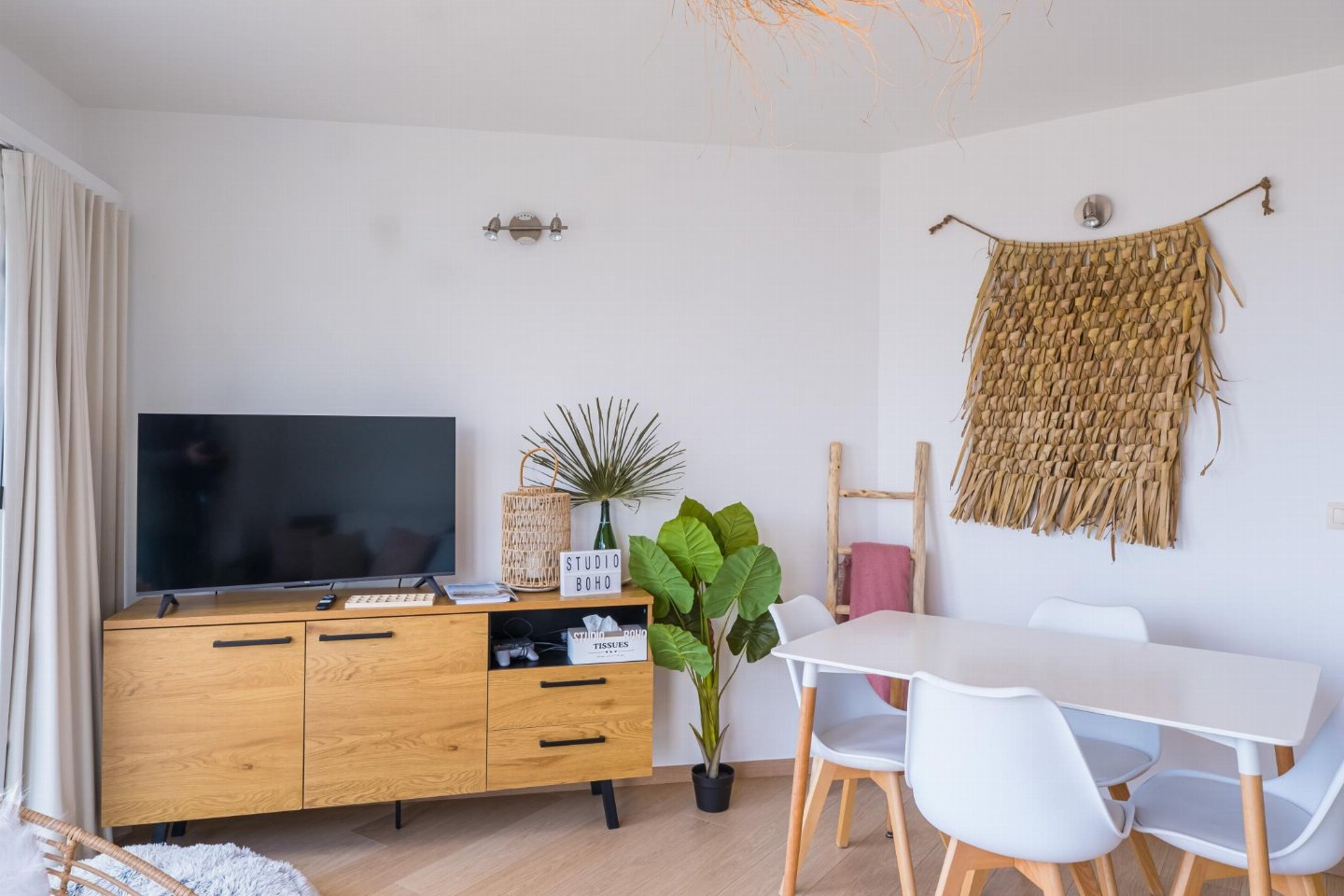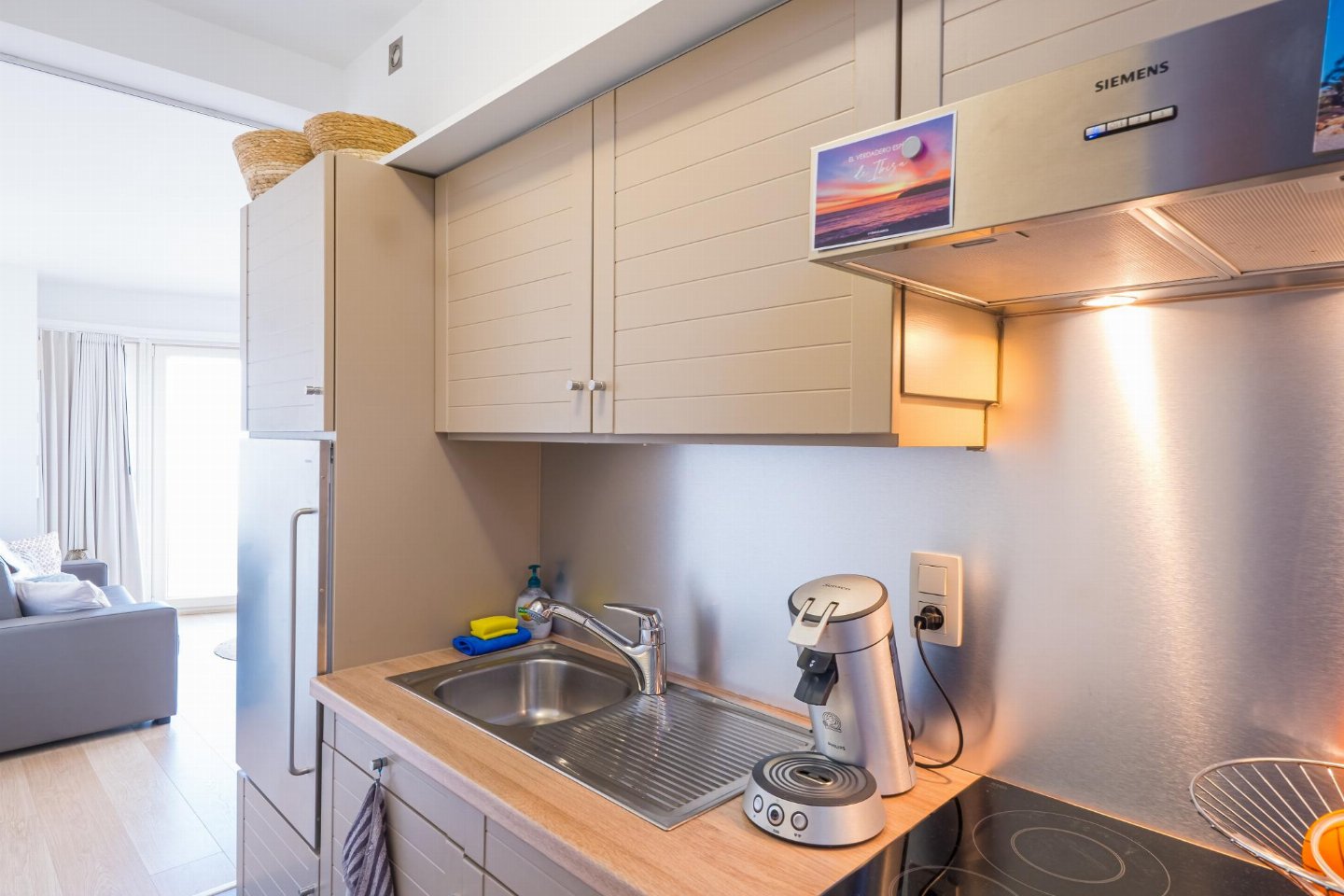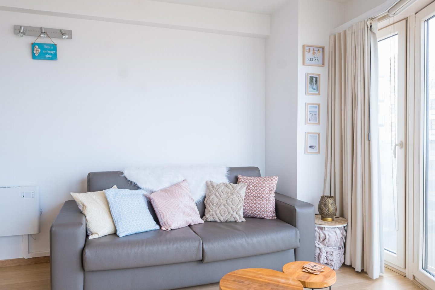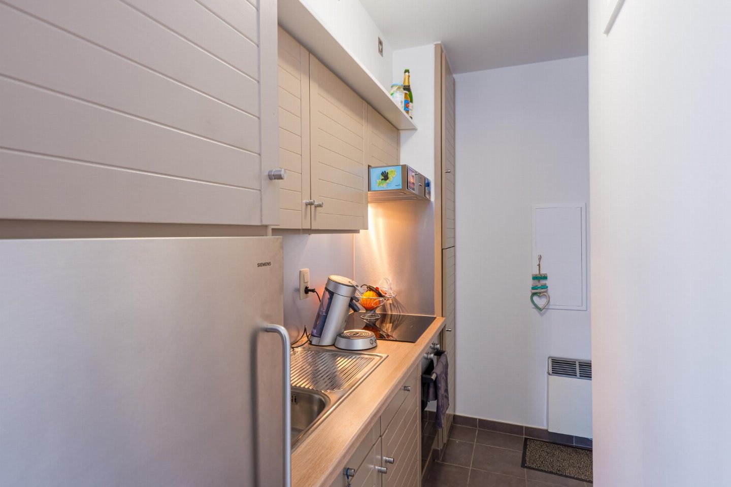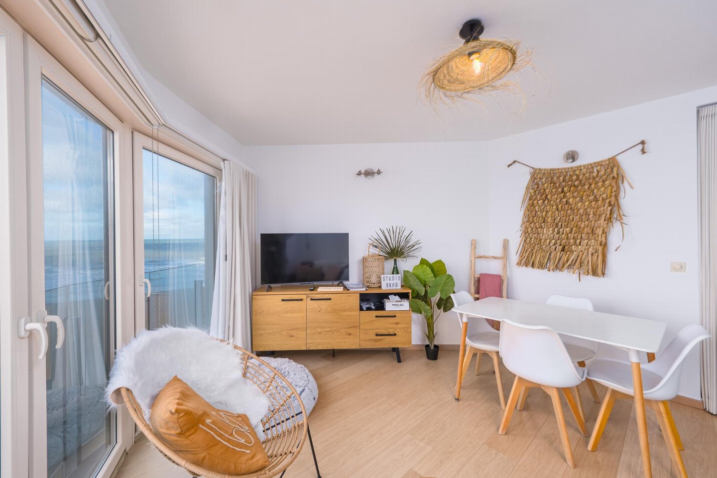 Studio op de 3de verdieping met zeezicht. Woonkamer in Ibiza-stijl met zetelbed voor 2. Afzonderlijke slaaphoek met (opklap)stapelbed en extra tv, ideaal voor 2 kinderen. Vernieuwde badkamer met inloopdouche en toilet. Digitale Telenet-tv met Play Sports en Streamz.