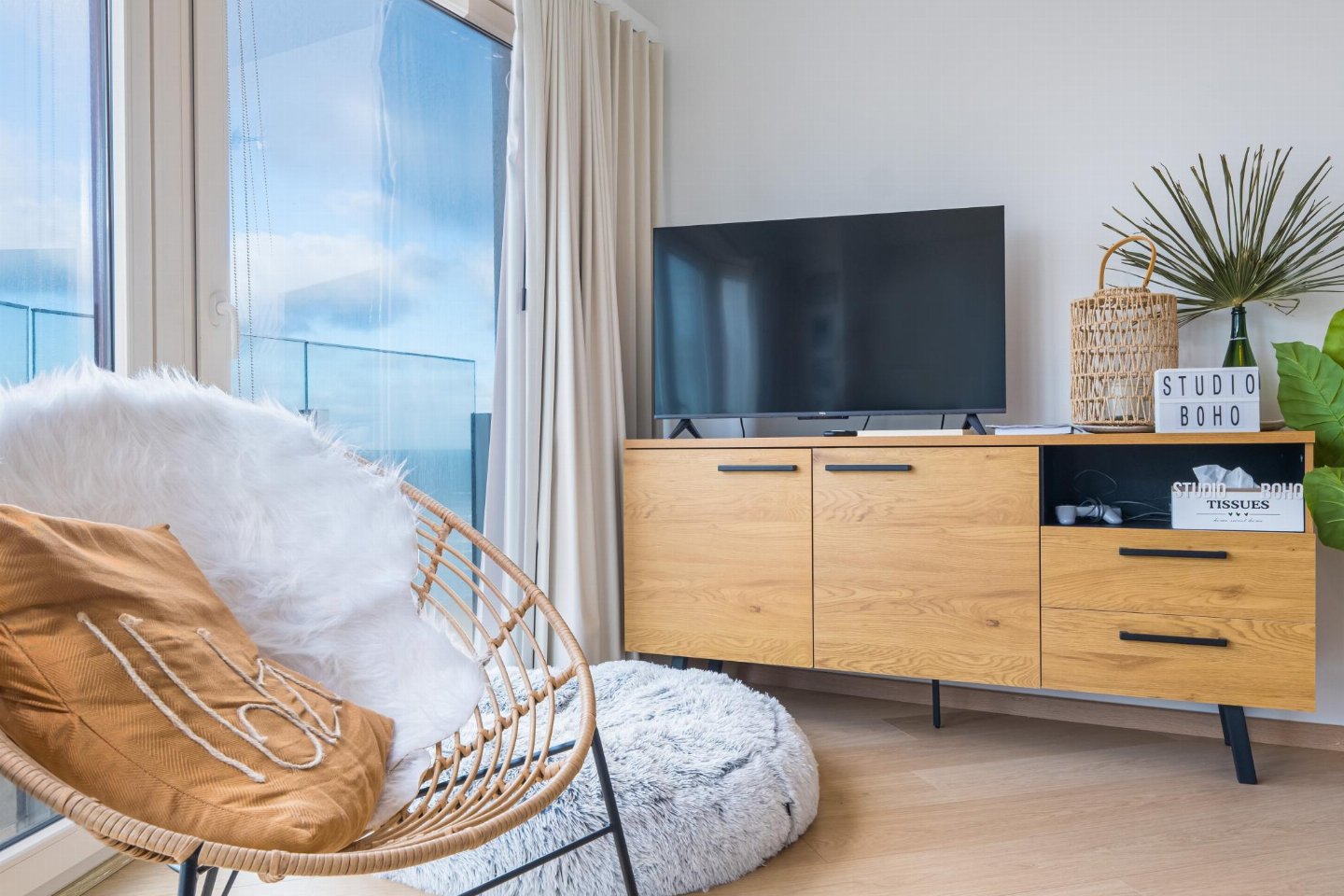 Studio op de 3de verdieping met zeezicht. Woonkamer in Ibiza-stijl met zetelbed voor 2. Afzonderlijke slaaphoek met (opklap)stapelbed en extra tv, ideaal voor 2 kinderen. Open, volledig ingerichte keuken. Vernieuwde badkamer met inloopdouche en toilet. Digitale Telenet-tv met Play Sports en Streamz. Rustig gelegen, op wandelafstand van winkels en OV.
