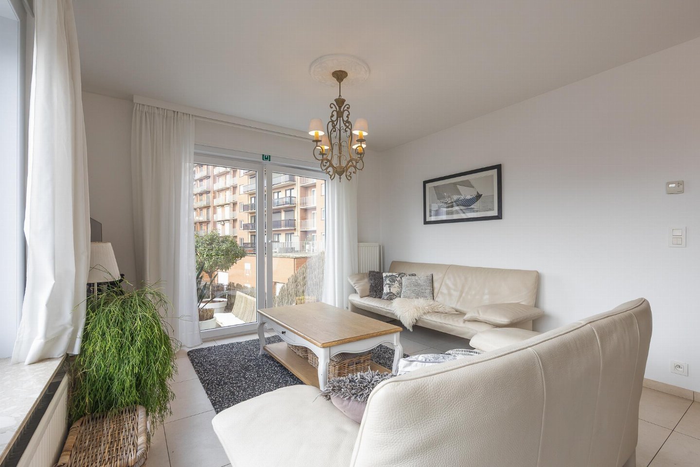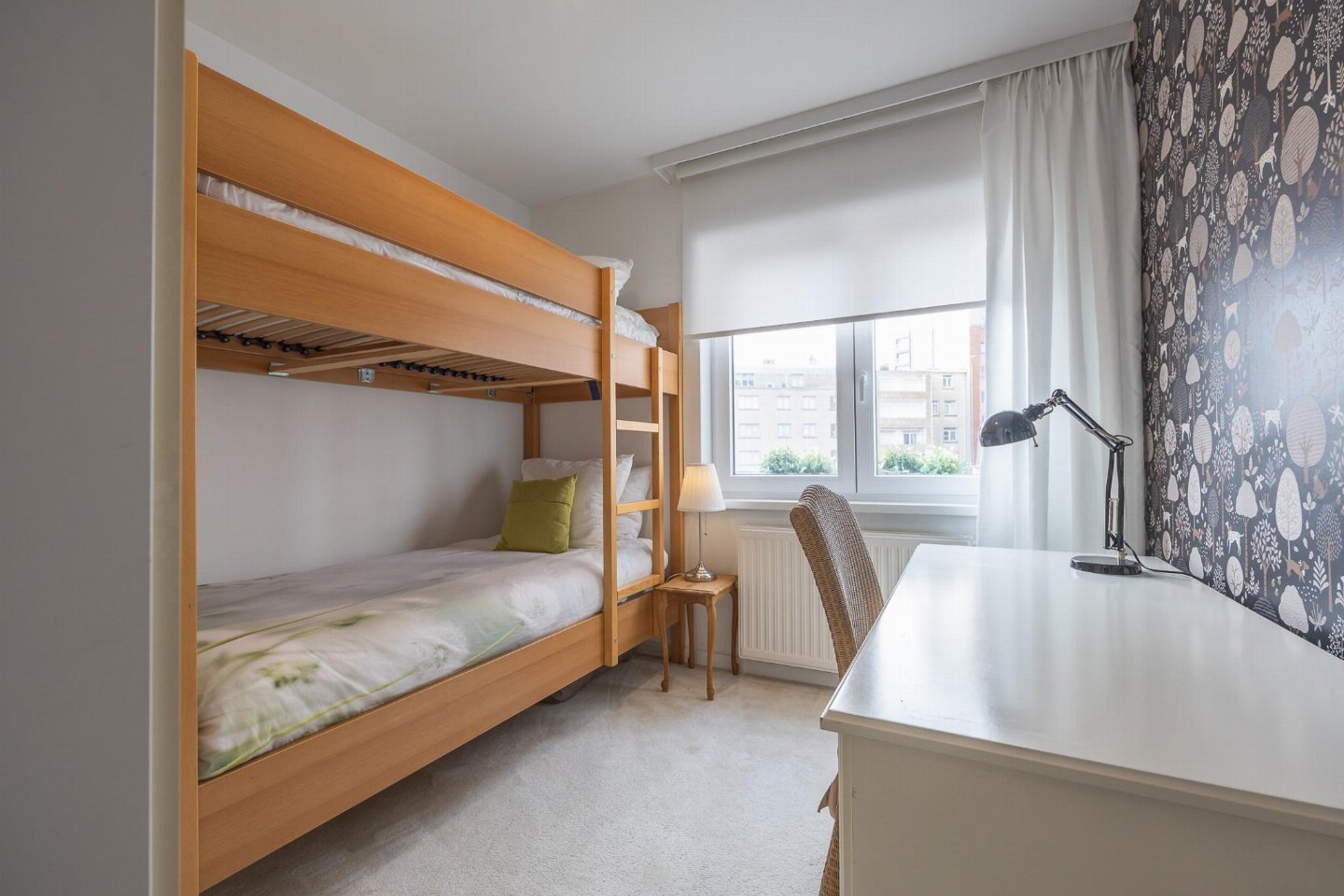 Hoekappartement op de 1e verdieping in residentie Rising Sun in Westende, vlak bij het strand. 2 slaapkamers: één met dubbel bed en één met stapelbed en bureau, ideaal voor max. 4 personen. Lichtrijke woonkamer met toegang tot zonnig terras. Badkamer met ligbad/douche en berging met wasmachine.