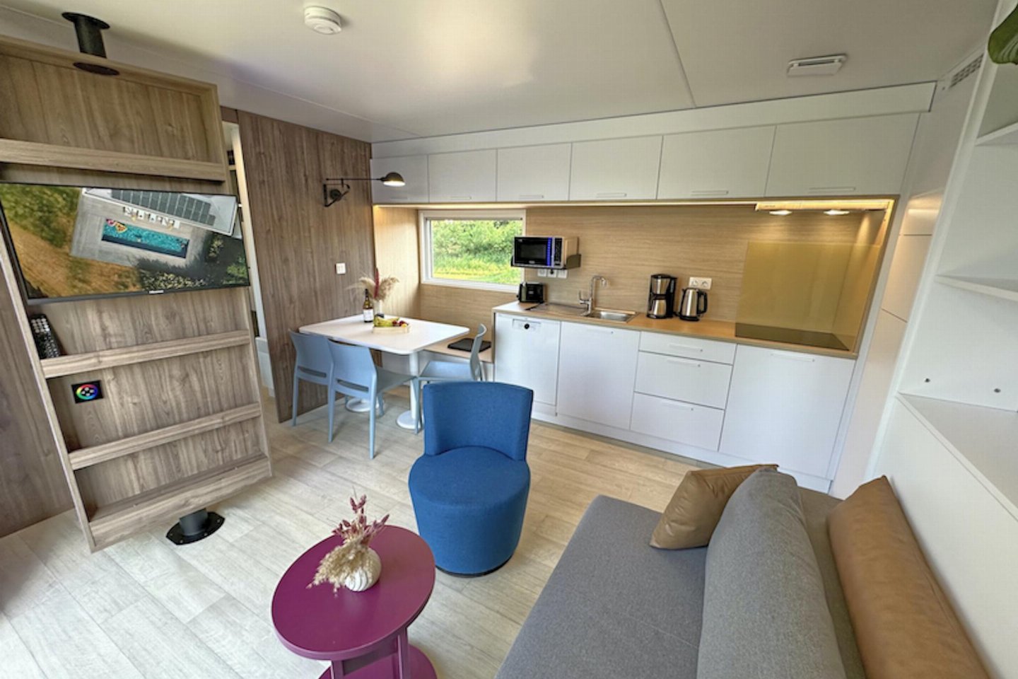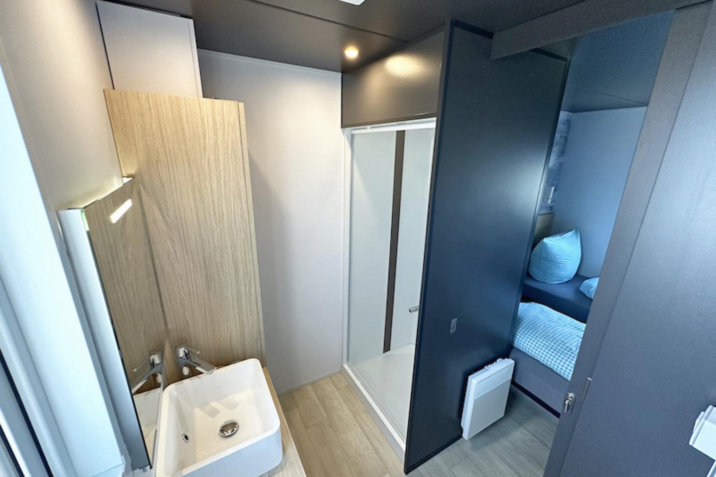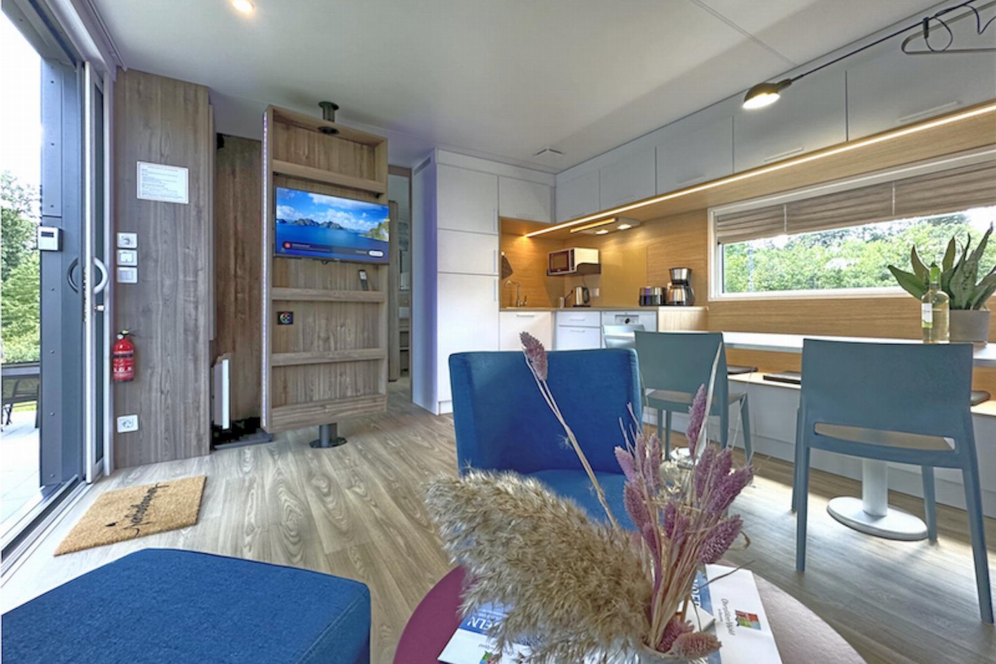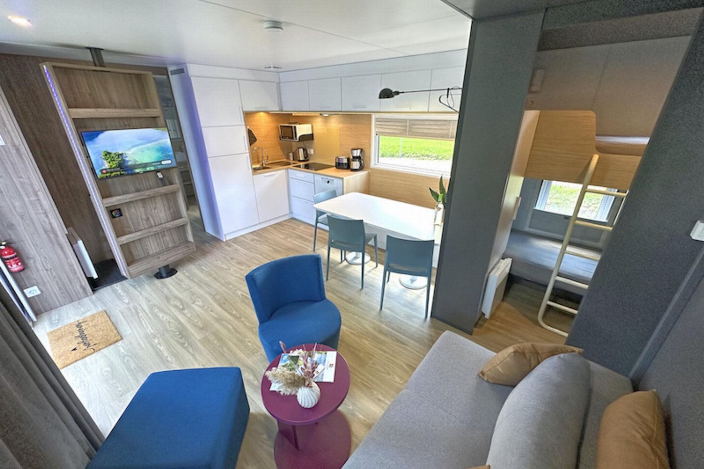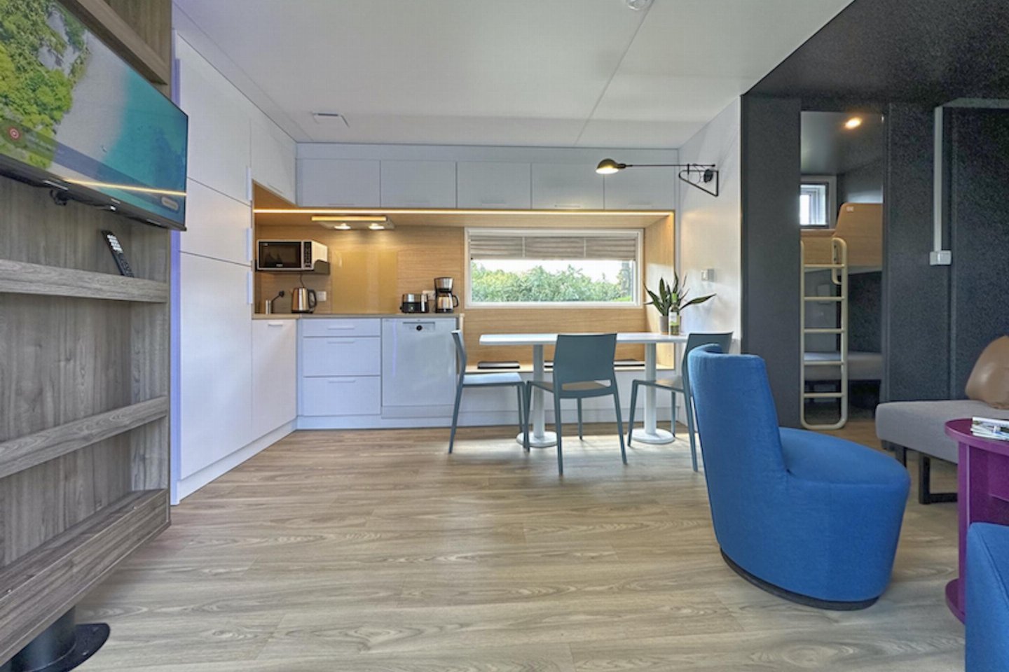 Begane grond: open keuken met waterkoker, broodrooster, fornuis, afzuigkap, koffiezetapparaat(filtermaling), oven(mini), magnetron, afwasmachine, koelkast( vriesvak) , woon/eetkamer met TV(flatscreen, satelliet, smart TV), eettafel(6 personen) , slaapkamer met stapelbed(dekbed) , slaapkamer met badkamer met 2-pers. bed(2 x 1 persoons dekbed, 160 x 200 cm), wasbak, douche(cabine), wc , slaapkamer met badkamer met 1-pers. bed(dekbed, 80 x 190 cm), 1-pers. bed(dekbed, 80 x 190 cm), wasbak, douche(cabine), wc