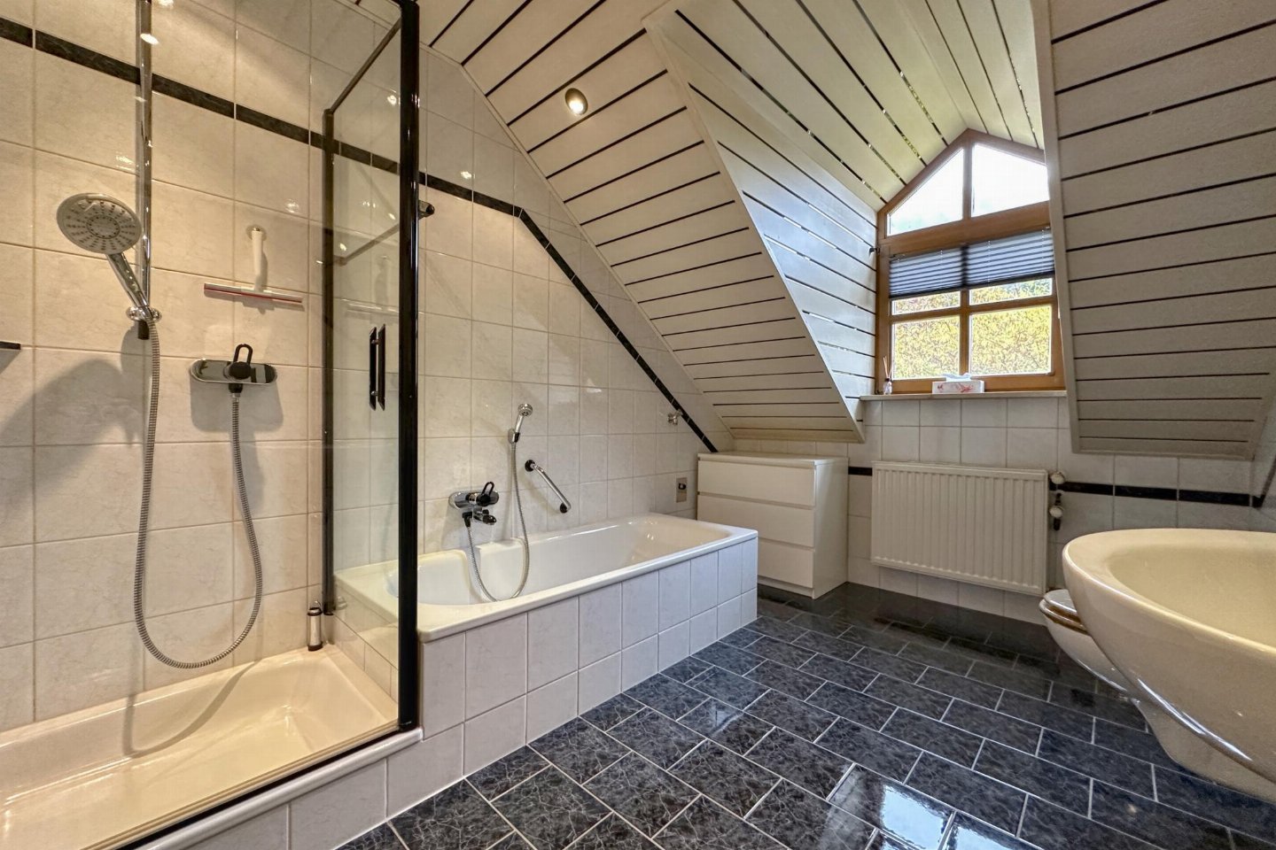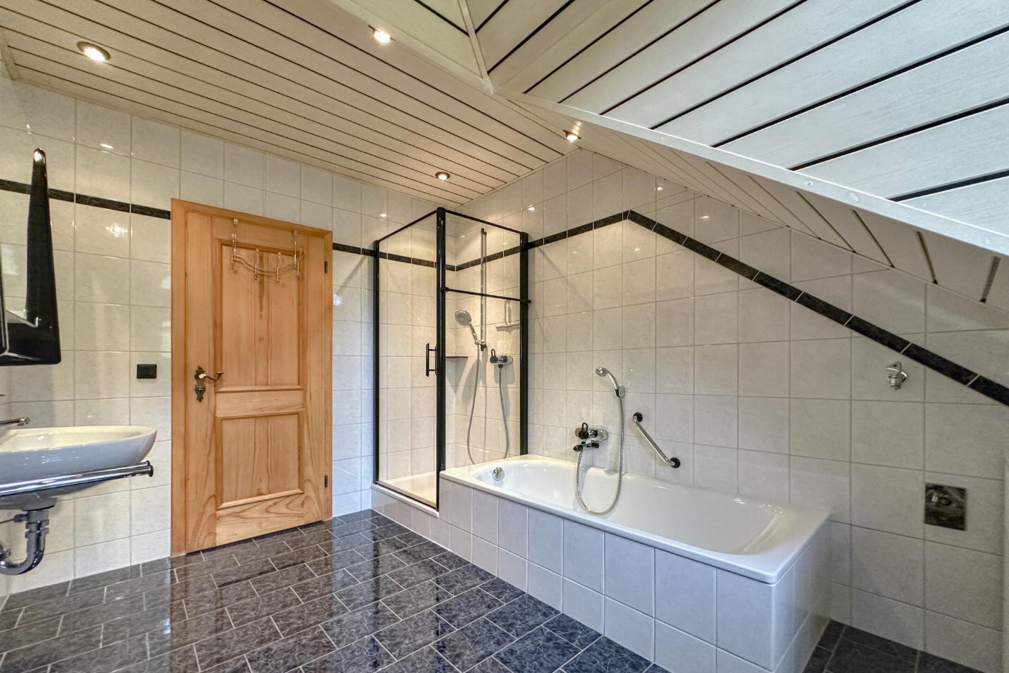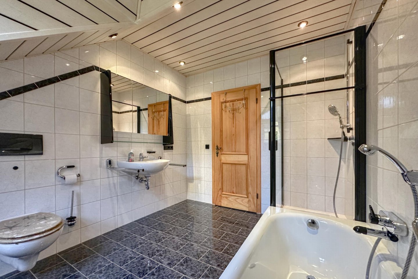 Op de 1e etage: woonkamer met TV(flatscreen, satelliet), zithoek, radio , eetkamer met eettafel, zithoek , open keuken met waterkoker, broodrooster, fornuis(keramisch, elektrisch), afzuigkap, koffiezetapparaat(filtermaling, pads), oven, magnetron, afwasmachine, koelkast( vriesvak), koel-/vriescombinatie , slaapkamer met 2-pers. bed(200 x 200 cm) , badkamer met ligbad, wasbak, douche, wc, haardroger