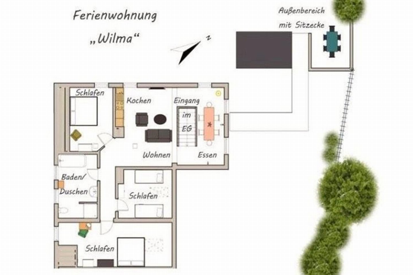 De moderne en volledig gerenoveerde vakantiewoning Wilma op de bovenste verdieping biedt met 3 slaapkamers ruimte voor het hele gezin. Geniet van je vrije tijd op je eigen terras of in de idyllische tuin. Deze accommodatie wordt alleen verhuurd aan familiegroepen. bed), slaapkamer (2x 1-pers. beddengoed), zonnescherm.