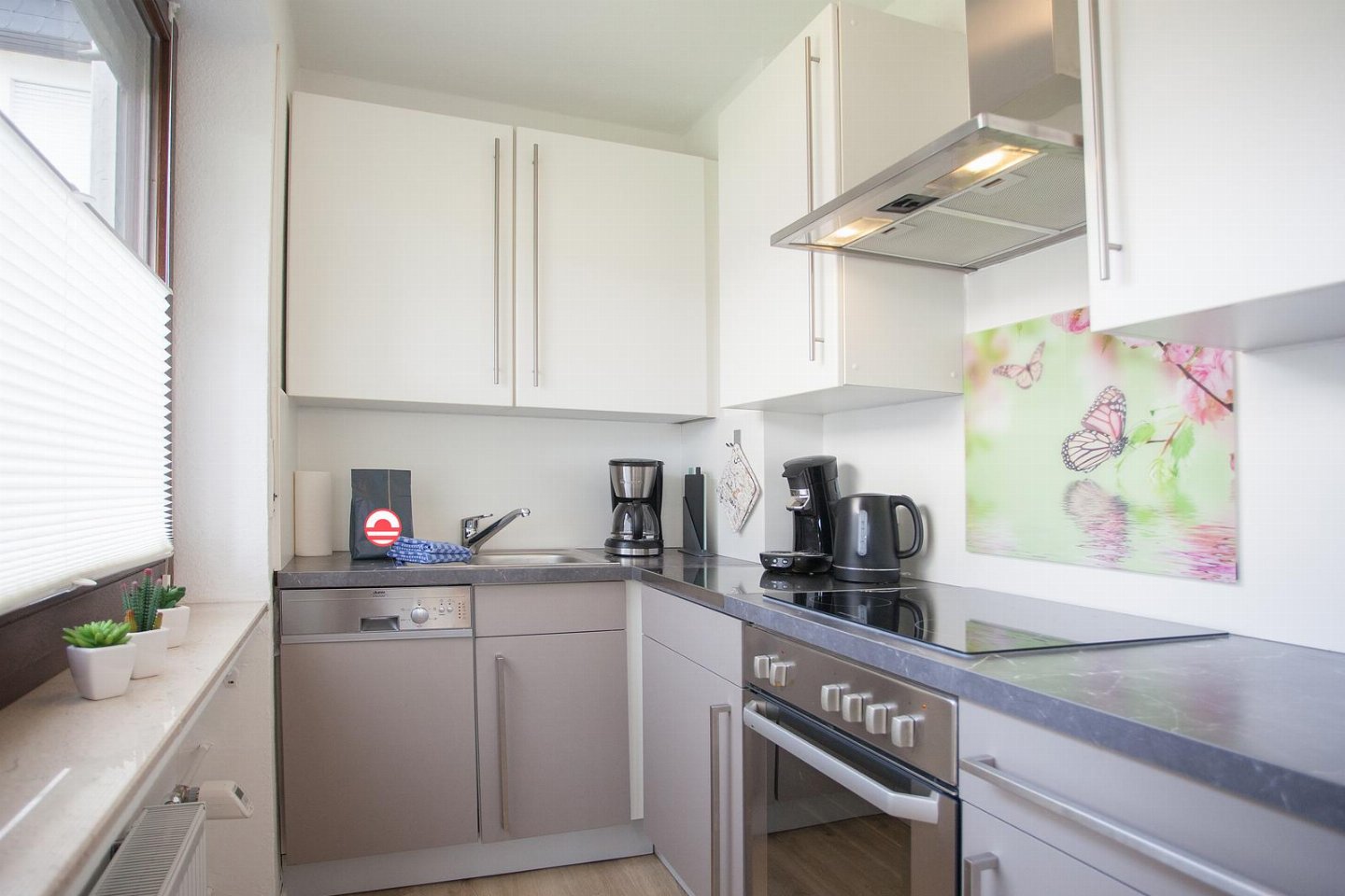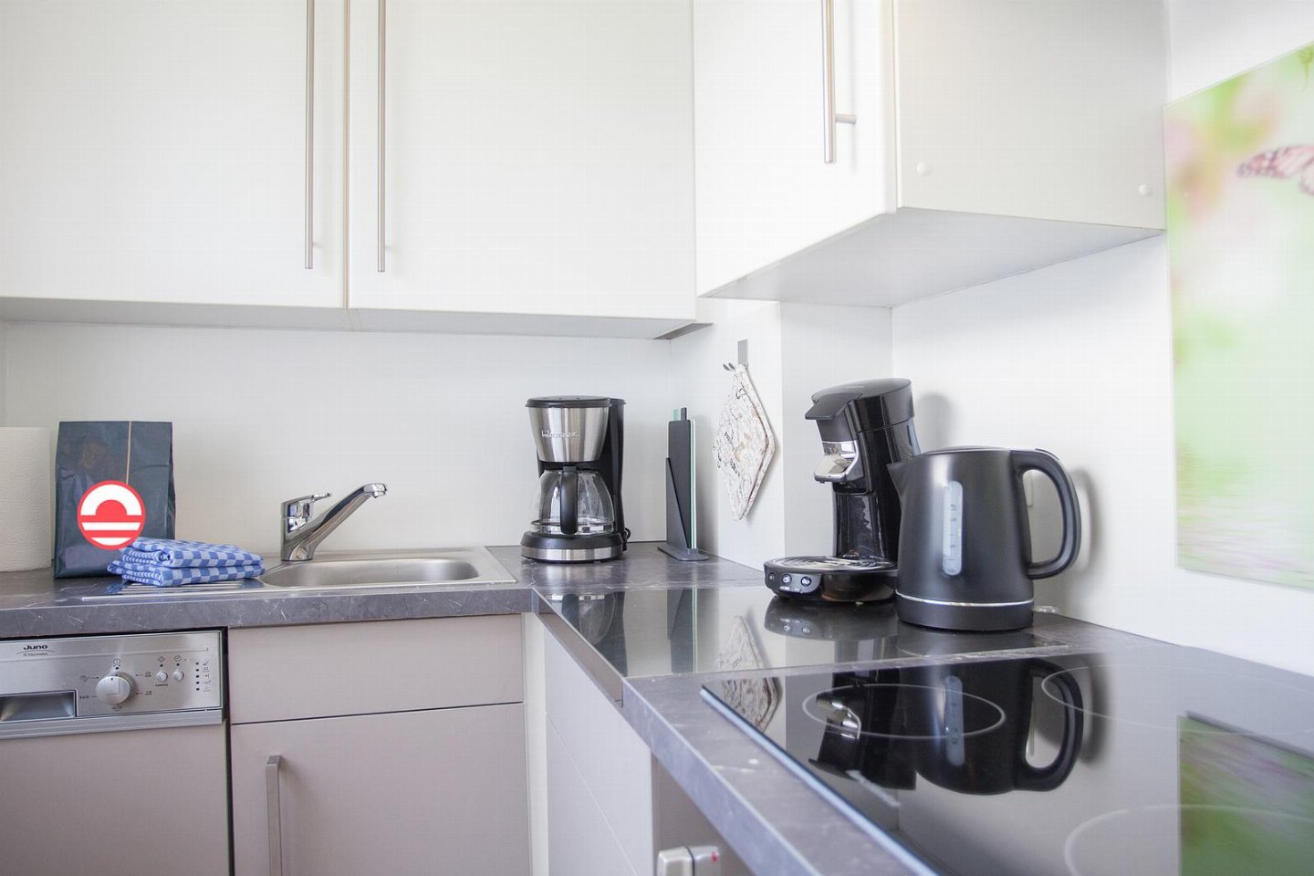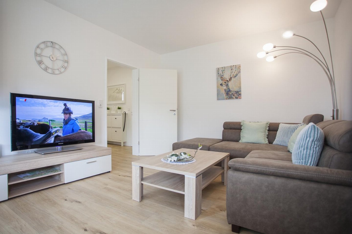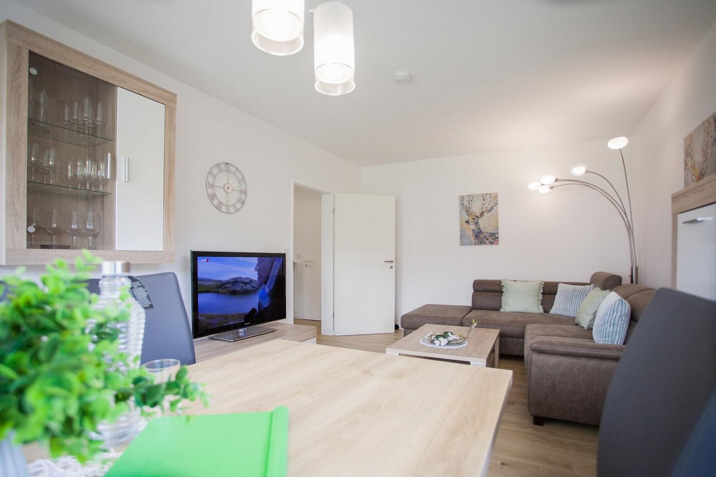 In de woonkamer van dit appartement vind je een eethoek, een slaapbank (voor 2 personen met gel-topper) en een