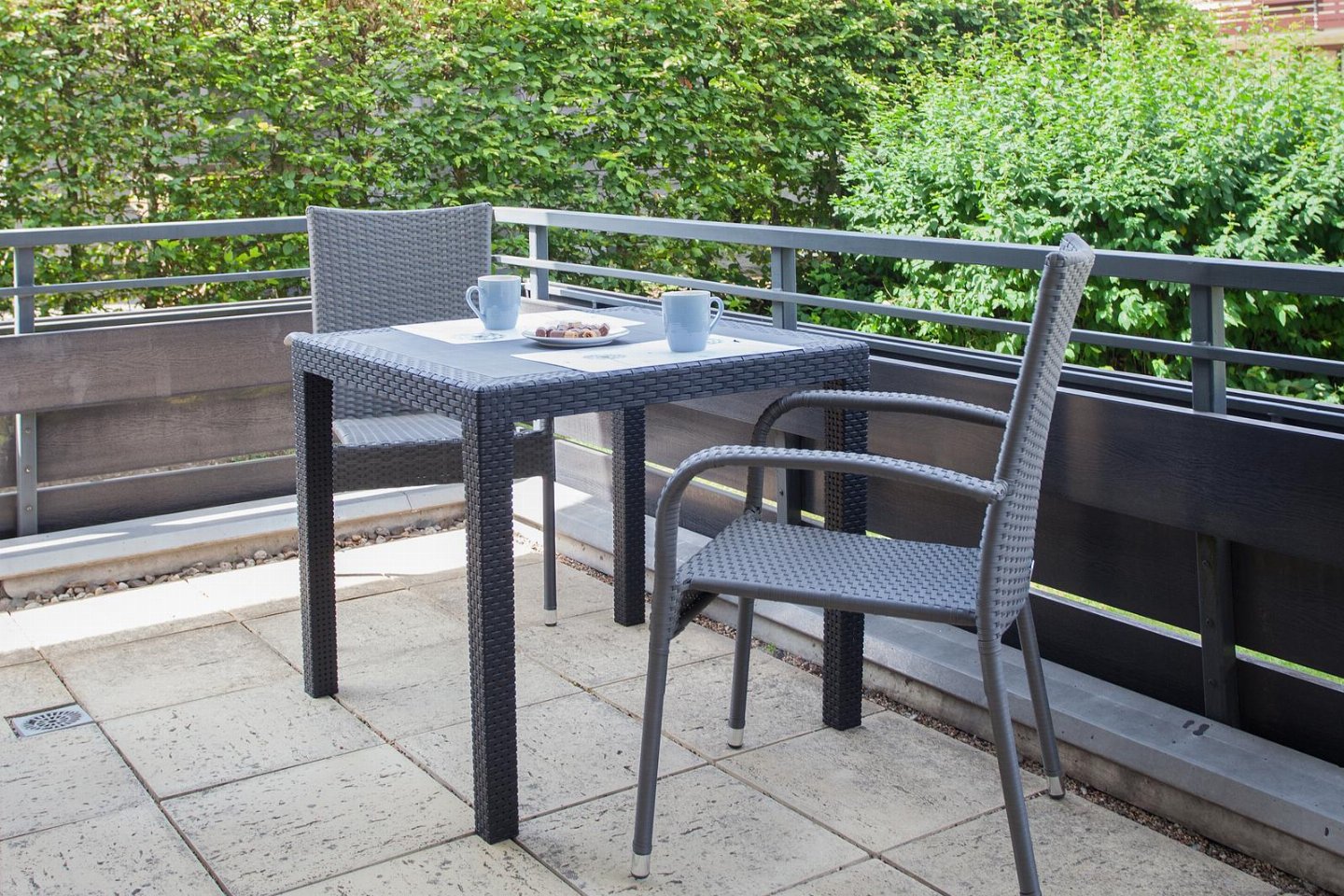 balkon met tuinmeubelen zoals een stoel en een tafel. Het appartement bevindt zich in een verzorgd complex met een gezamenlijk
