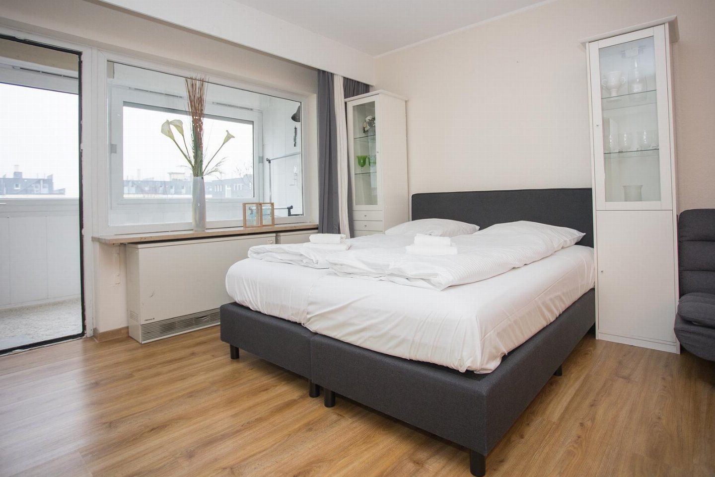 boxspring (180 breed) bevinden zich in één ruimte. In de zithoek staan een