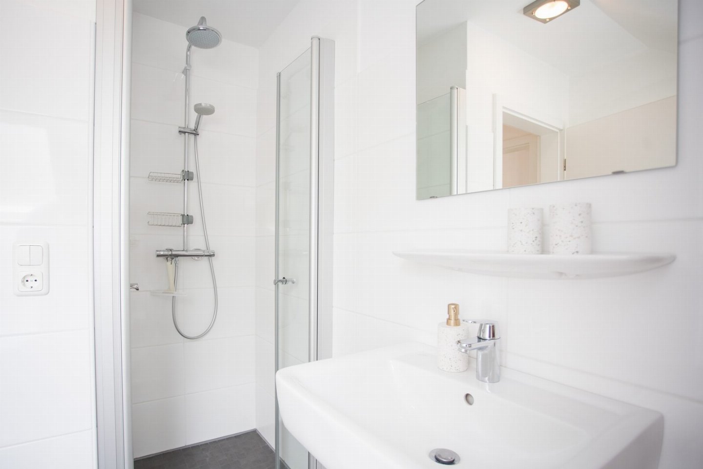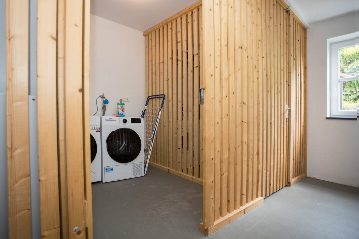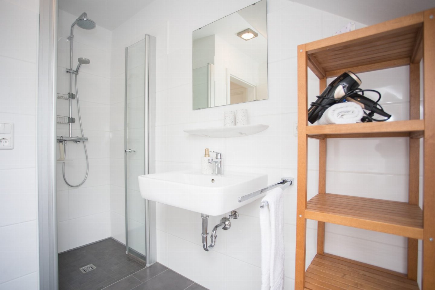 De moderne badkamer is voorzien van een inloopdouche, toilet en een open badkamermeubel met opbergruimte voor je handdoeken en enkele toiletspullen. Voor langere verblijven is er in de kelder een wasmachine en droger aanwezig. Hier is het ook mogelijk om je ski spullen te stallen.
