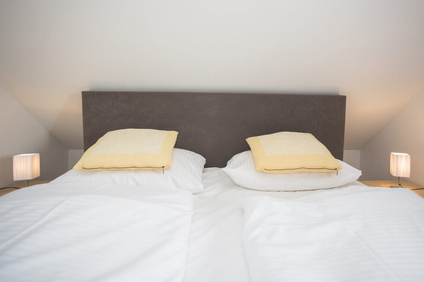 In totaal zijn er drie slaapmogelijkheden. Een slaapkamer heeft een comfortabel boxspringbed van 180x200 cm, met nachtkastjes, verlichting en een kledingkast. De tweede heeft twee losse boxspringbedden van 90x200cm met daartussen een nachtkastje. De derde slaapruimte bevindt zich op een charmante vide met een stahoogte van net 1,90m in het midden van de ruimte, deze is bereikbaar via een vaste trap in de woonkamer. Deze trap is ontworpen als ruimtebesparende trap en heeft dus een bijzondere constructie, zoals te zien op de foto's. Ook hier vind je twee boxspringbedden van 90x200 cm.Â