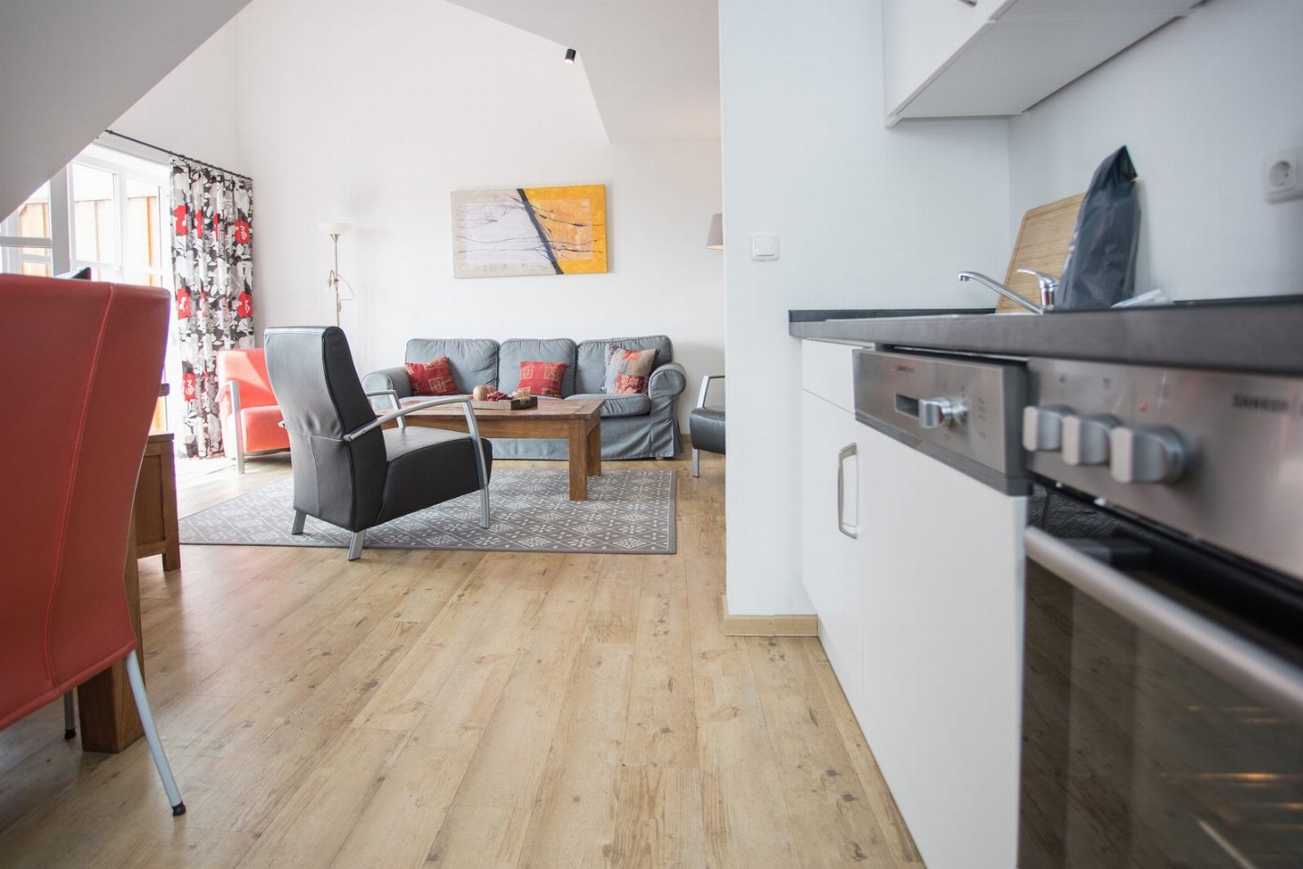 De woonkamer voelt licht en luchtig door het hoge plafond tot in de nok. Grote ramen openen naar het balkon op het zuiden, waar je aan de tuintafel met stoelen kunt genieten van het uitzicht. In de woonkamer vind je een comfortabele 3-zitsbank, losse fauteuils, een voetenbank en een salontafel. De gezellige eethoek biedt plaats aan zes personen.