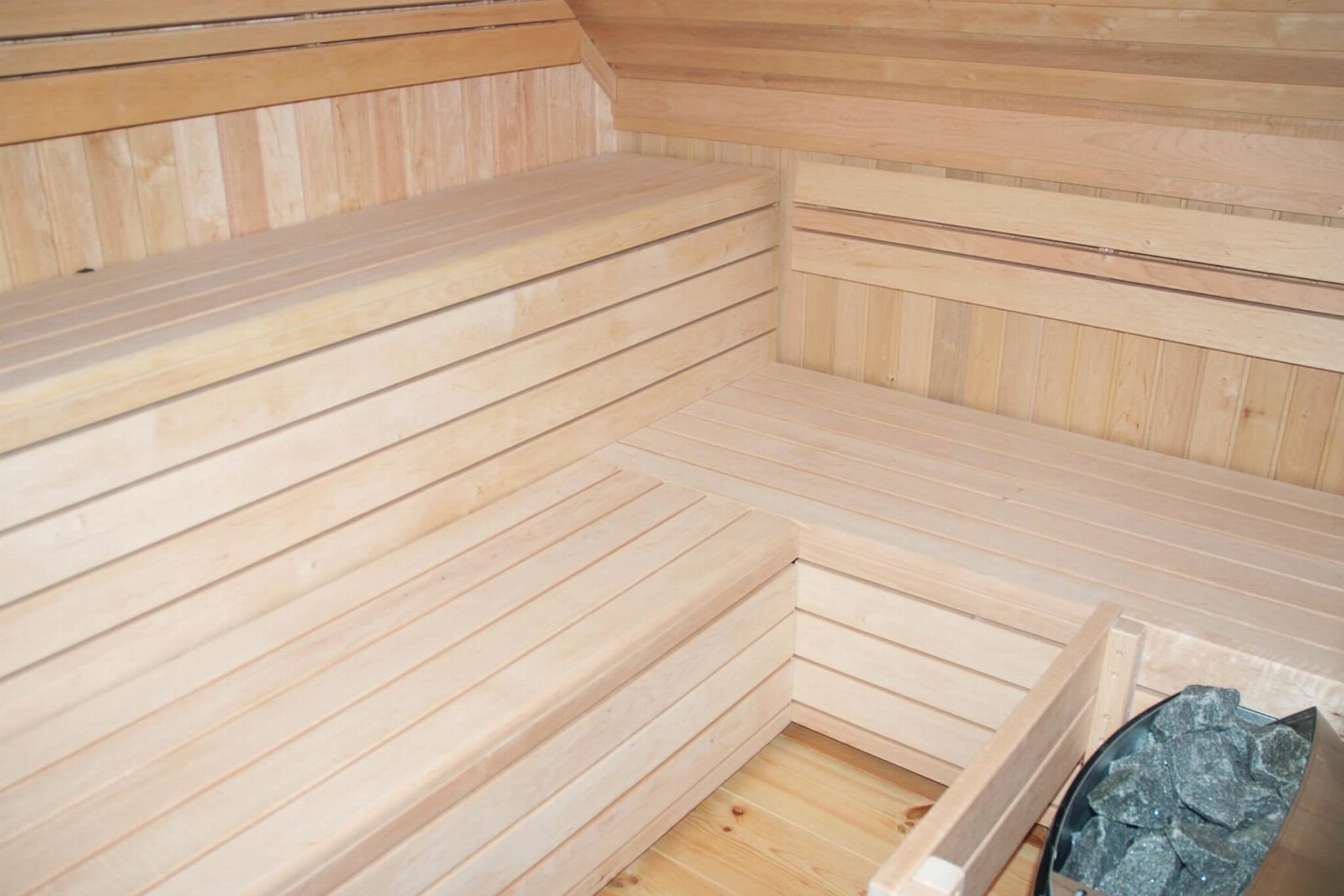 Op de 1e etage: (2x slaapkamer(2-pers. bed(boxspring)), badkamer(ligbad, douche, wastafel, wc), saunaruimte(sauna(privé)))