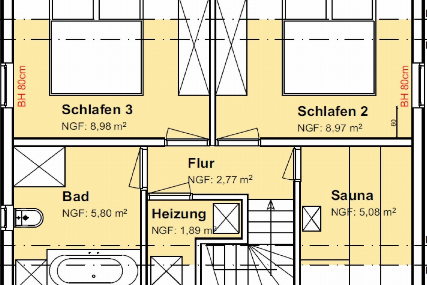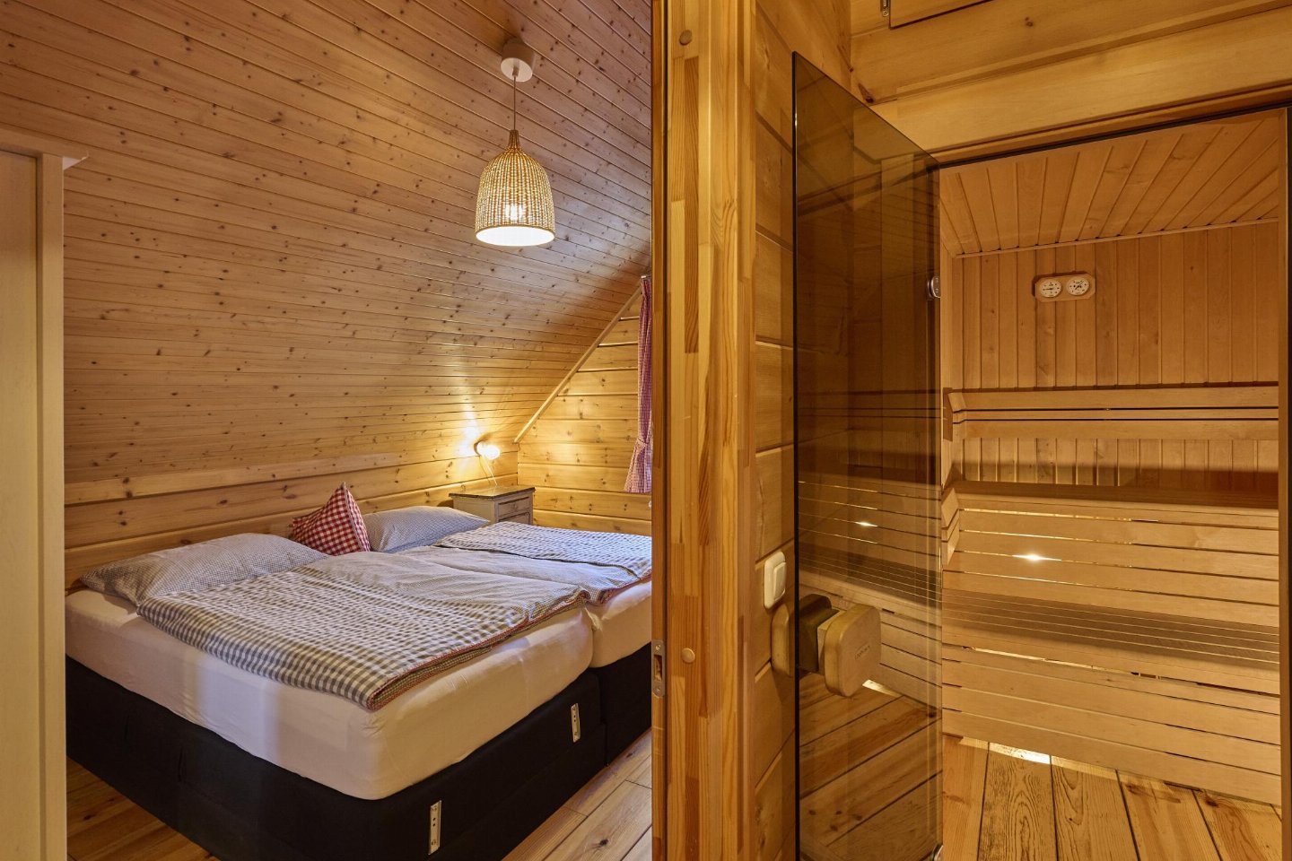 Op de 1e etage: (2x slaapkamer(2-pers. bed), badkamer(ligbad, douche, wastafel, wc), saunaruimte(sauna(privé)))