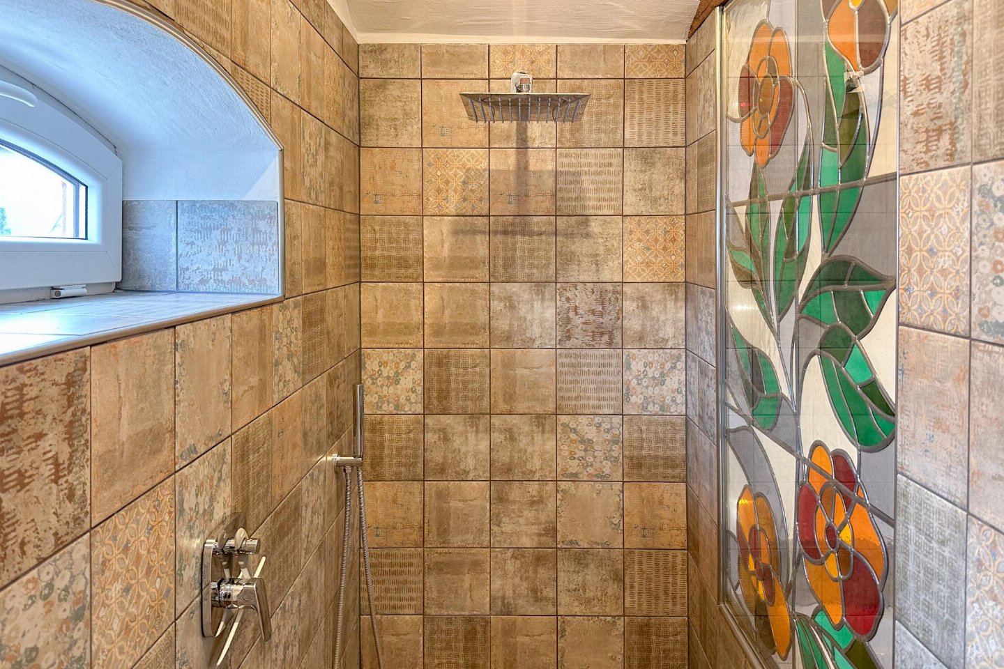 Op de 1e etage(via steile trap): woonkamer met TV, sfeerhaard, zithoek , keuken met eettafel, waterkoker, broodrooster, fornuis(4 kookplaten), afzuigkap, koffiezetapparaat(filtermaling), oven, afwasmachine, koelkast( vriesvak) , slaapkamer met 2-pers. bed , badkamer met ligbad, douche, wastafel, wc , vide met 2-pers. bed