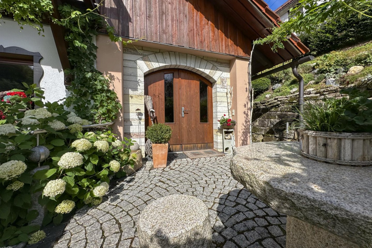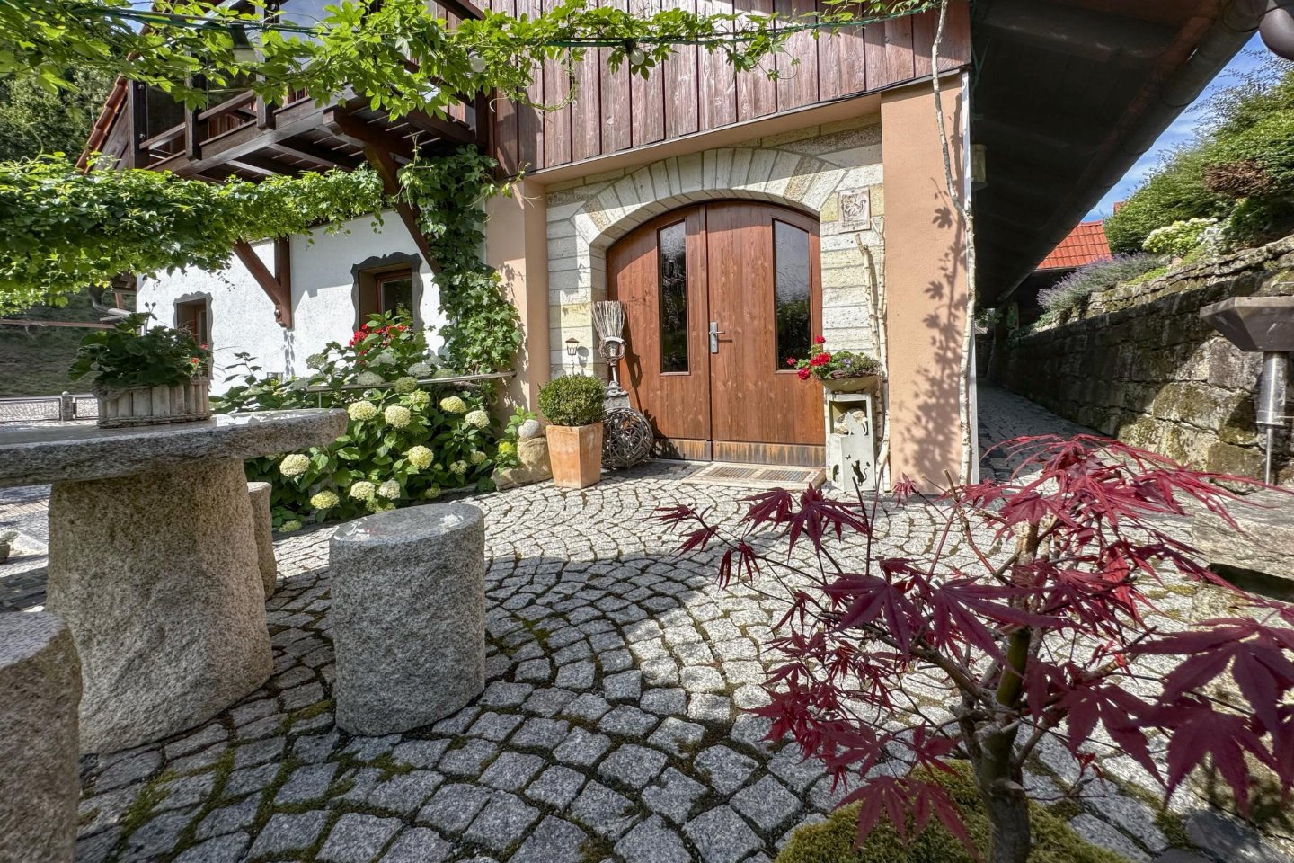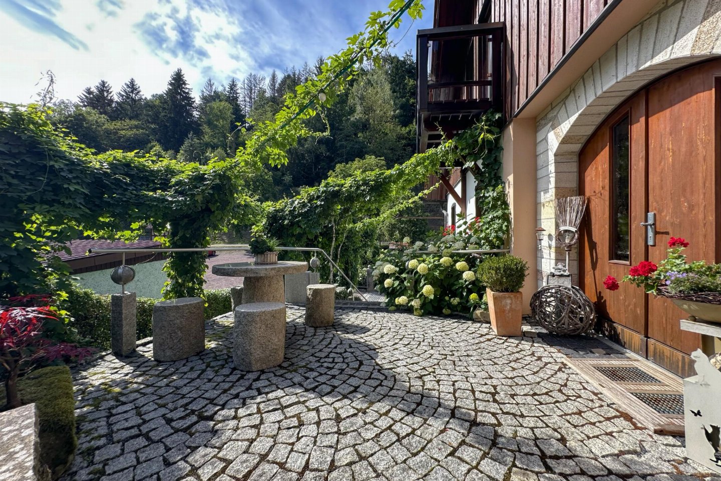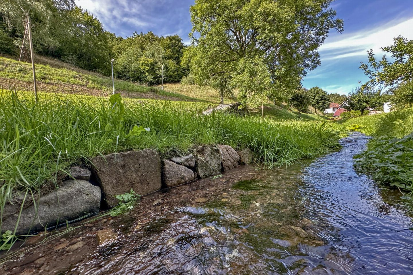 Duitsland, Thüringen, Schleusegrund OT LangenbachDit vakantiehuis maakt deel uit van een traditionele boerderij in Langenbach, rustig gelegen op de zonnige zuidhellingen van het Thüringer Woud. Het interieur met veel hout straalt warmte en gezelligheid uit. Er is een eigen terras, een balkon en een speel- en ligweide. bed(160 x 200 cm) , slaapkamer met 2-pers.