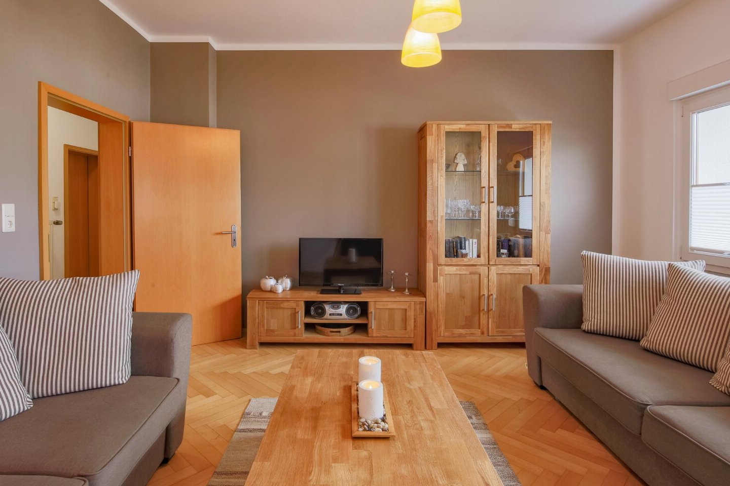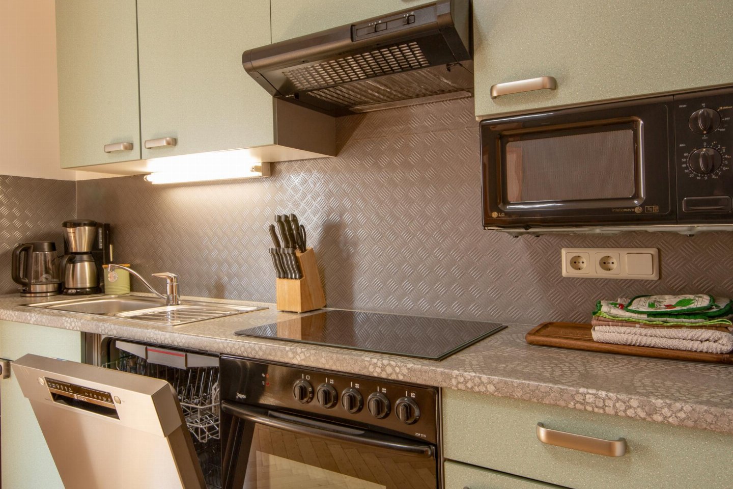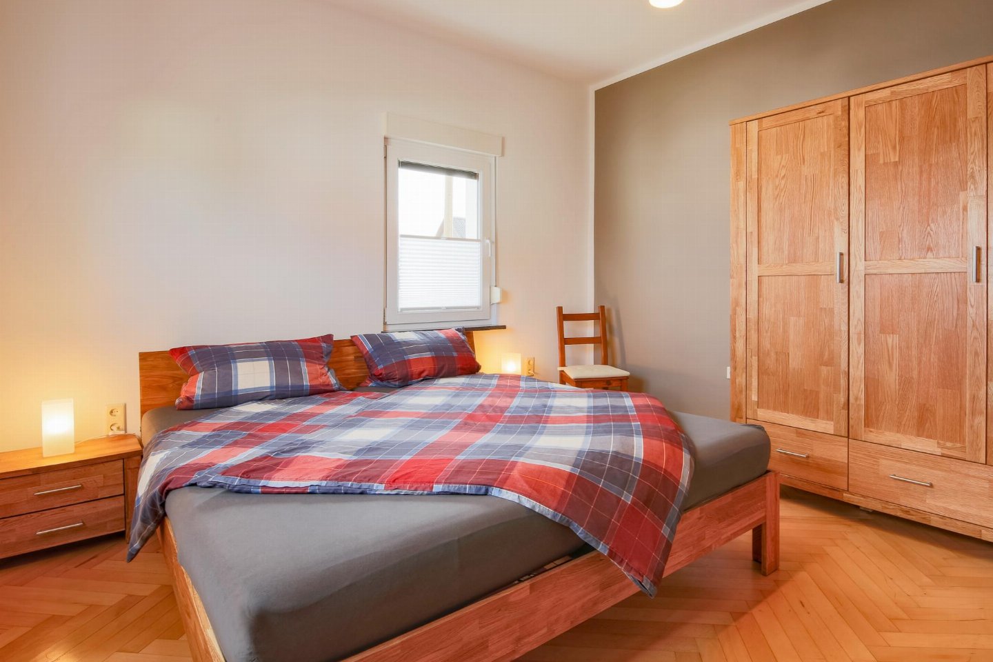 Begane grond: (hal(buitenom bereikbaar), woonkamer(TV(flatscreen, satelliet), zithoek, radio), keuken(eettafel, waterkoker, broodrooster, fornuis(4 kookplaten, keramisch), afzuigkap, koffiezetapparaat(filtermaling), oven, magnetron, afwasmachine, koel-/vriescombinatie, citruspers), 2x slaapkamer(2-pers. bed(180 x 200 cm), horren), badkamer(douche, wastafel, haardroger), toilet(wastafel, wc))