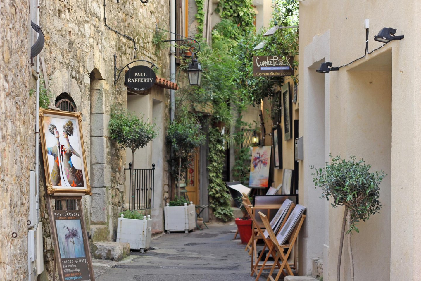 Hoog boven de glinsterende baai van Cannes, verscholen tussen zilverkleurige olijfgaarden en geurige dennenbossen, ligt het charmante dorp Mougins, een juweel dat al eeuwen kunstenaars en fijnproevers betovert. Zodra je over de kronkelende weg omhoog rijdt, lijkt het alsof de tijd vertraagt. Smalle geplaveide straatjes leiden langs galeries, ateliers en kleine boetiekjes. Hier schilderde Pablo Picasso zijn laatste meesterwerken en vond hij rust in de zonovergoten stilte van het Zuid-Franse leven. Vandaag de dag ademt Mougins nog steeds kunst, elke hoek lijkt een levend schilderij.
