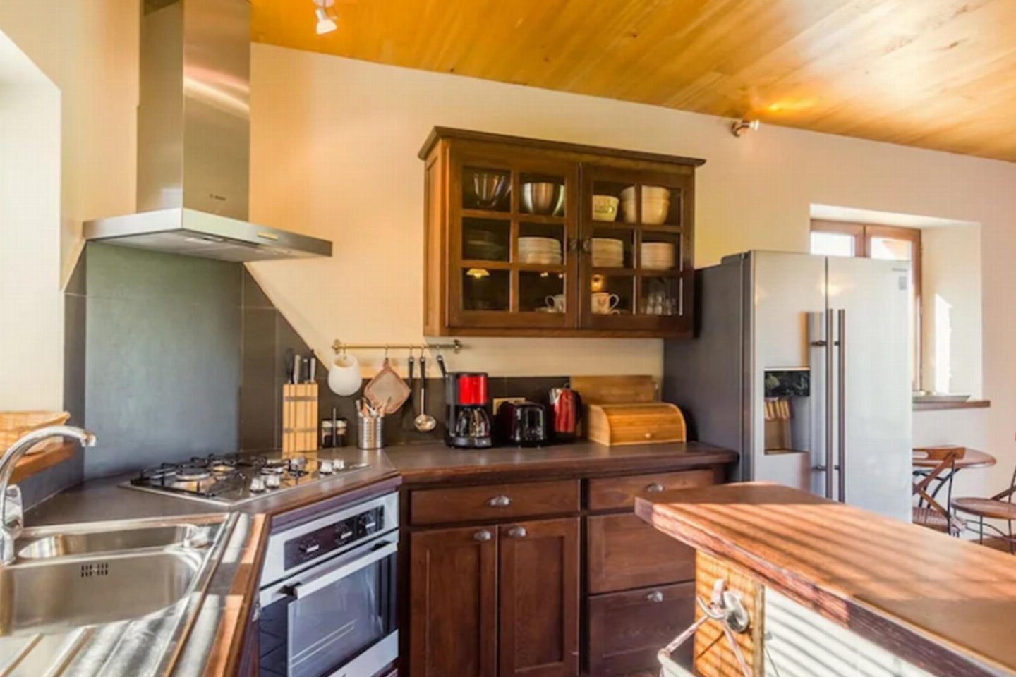 Begane grond: (woonkamer(TV, kachel(hout), zithoek), eetkamer(eettafel), open keuken(fornuis(4 kookplaten, gas), afzuigkap, koffiezetapparaat(filtermaling, nespresso cups), oven, magnetron, afwasmachine, koel-/vriescombinatie), slaapkamer(2-pers. bed(160 x 200 cm)), badkamer(douche, wastafel), toilet, balkon of terras)