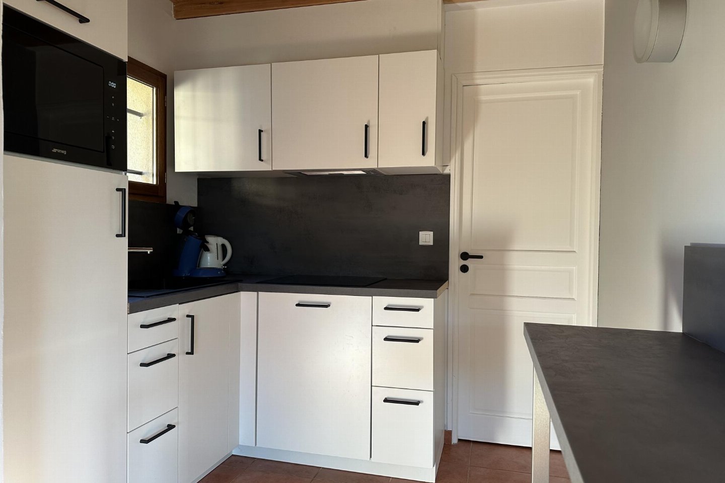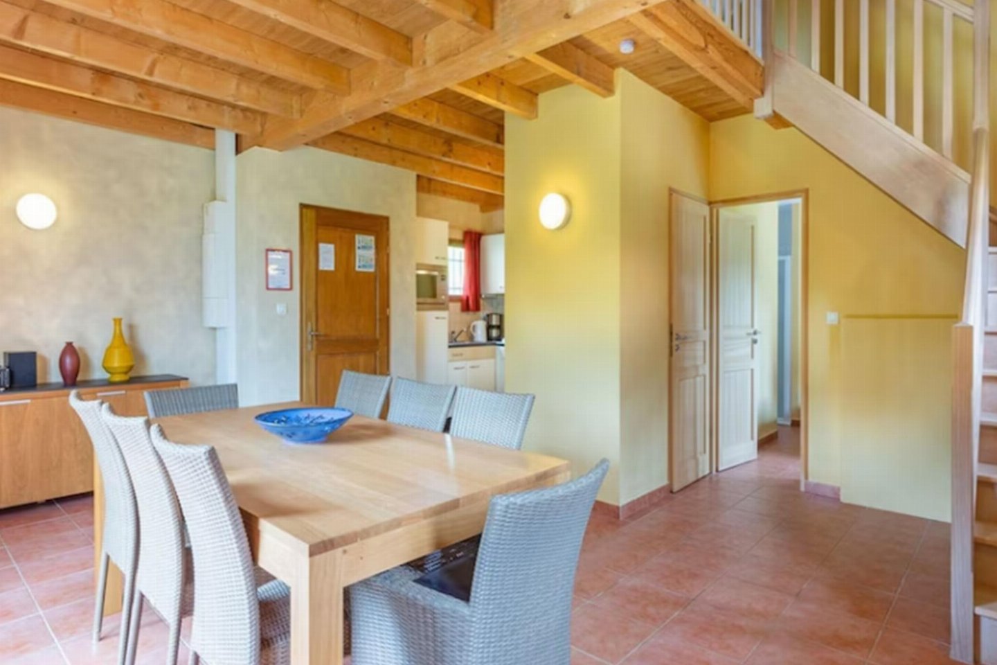 Begane grond: open keuken met waterkoker, fornuis(inductie), afzuigkap, koffiezetapparaat(pads), oven(elektrisch), magnetron, afwasmachine, koel-/vriescombinatie , woon/eetkamer met TV(satelliet), eettafel, zithoek , slaapkamer met badkamer met 2-pers. bed(180 x 200 cm), douche, wastafel , slaapkamer met badkamer met stapelbed, douche, wastafel , berging, wc, airconditioning