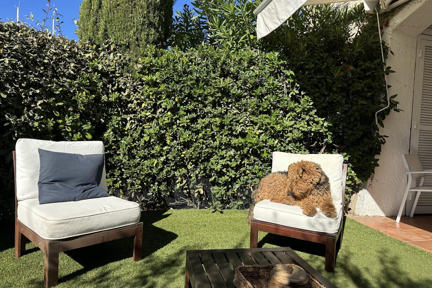 berging(stofzuiger, strijkplank, strijkijzer), 1x garage(1 parkeerplaats), verwarming(CV), terras(privé, overdekt, verlicht), tuin(privé, verlicht, omheind, 50 m2), zonneluifel