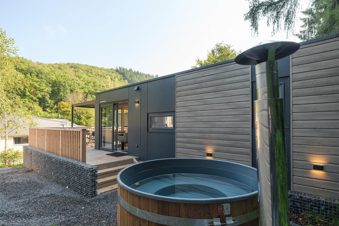 Een extra vleugje luxe biedt de privéhottub, die centraal staat op het terras en een uitnodigende plek is om helemaal tot rust te komen. Stel je voor: ontspannen in het warme, dampende water terwijl je uitkijkt over de prachtige natuurlijke omgeving. Of je nu de dag begint met een verkwikkend moment in de ochtendzon of de avond afsluit onder een hemel vol sterren, de hottub maakt elk moment onvergetelijk.
