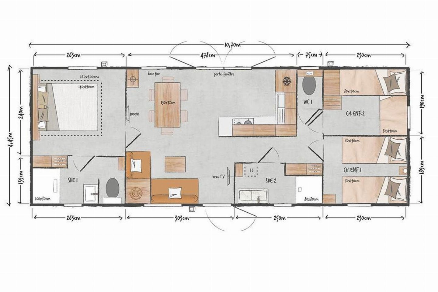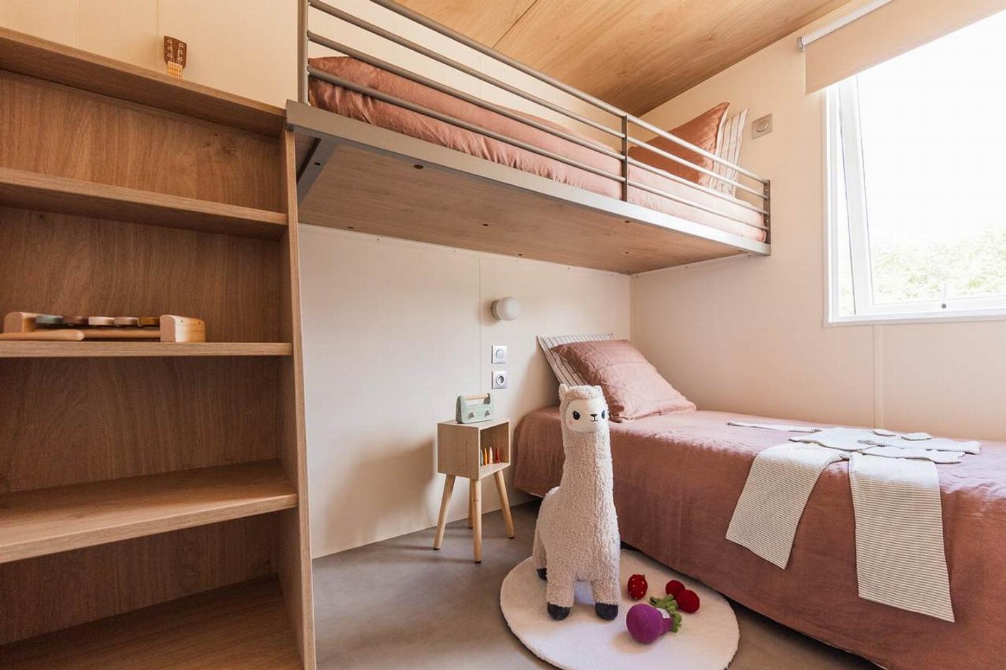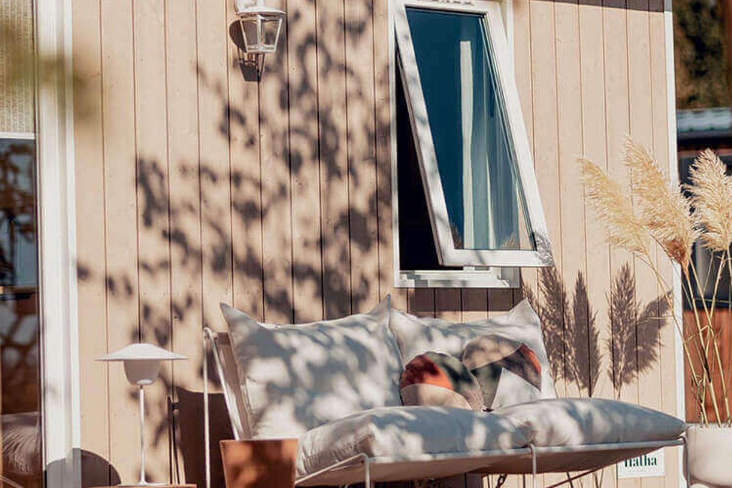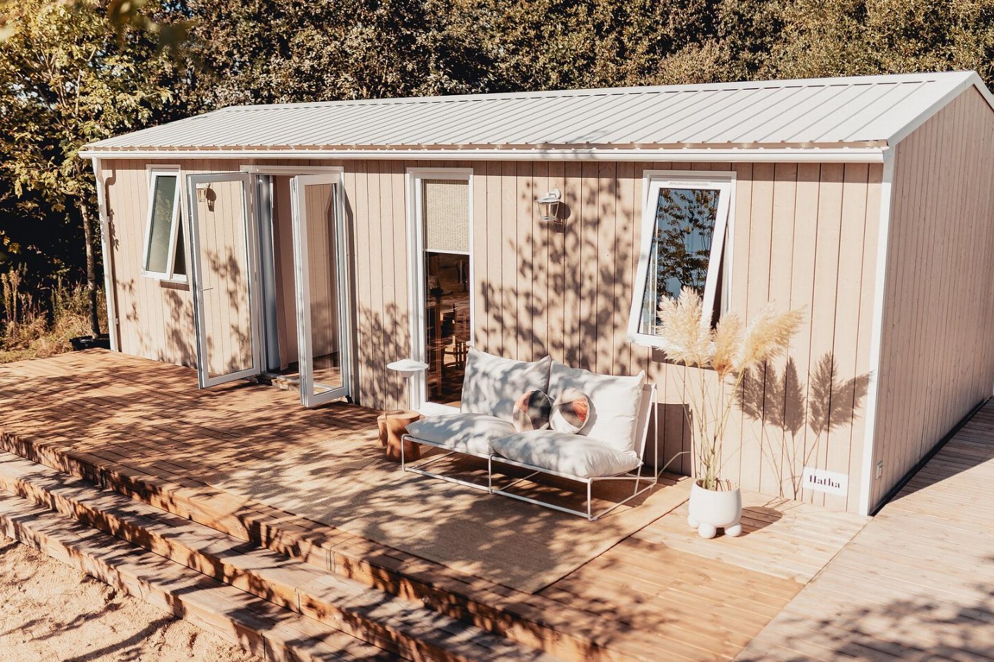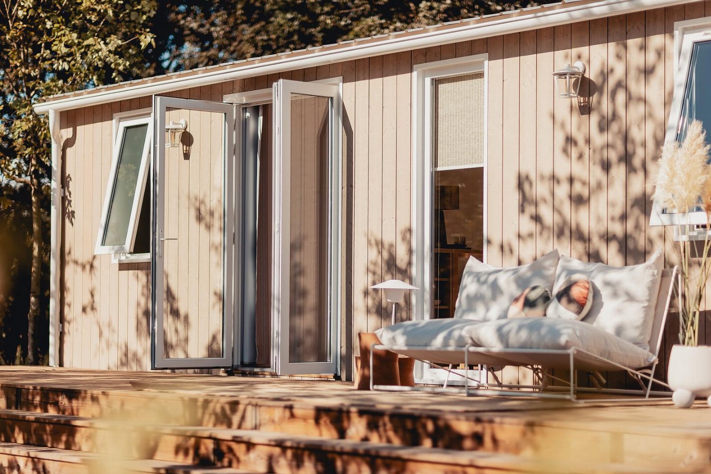 Nederland, Limburg, WellDe gloednieuwe Sunset Lodge voor 6 personen is een luxe accommodatie. De zithoek is een heerlijke plek om samen jullie favoriete tv-programmas te kijken. Of je nu in een warme zomer of iets frissere herfst komt logeren. Met alle weertypes is het heerlijk vertoeven op de veranda van de lodge.
