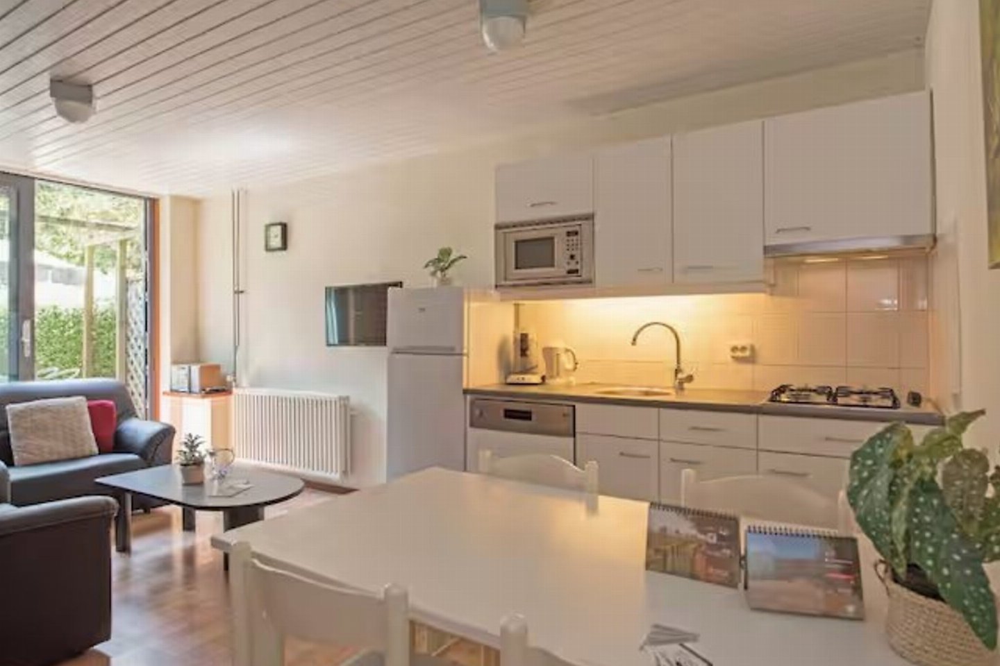 Begane grond: woonkamer met TV, zithoek , eetkamer met eettafel , open keuken met waterkoker, fornuis, koffiezetapparaat(senseo pads), combimagnetron, afwasmachine, koelkast, vriezer , slaapkamer met 2-pers. bed , slaapkamer met stapelbed , badkamer met douche, wastafel, wc