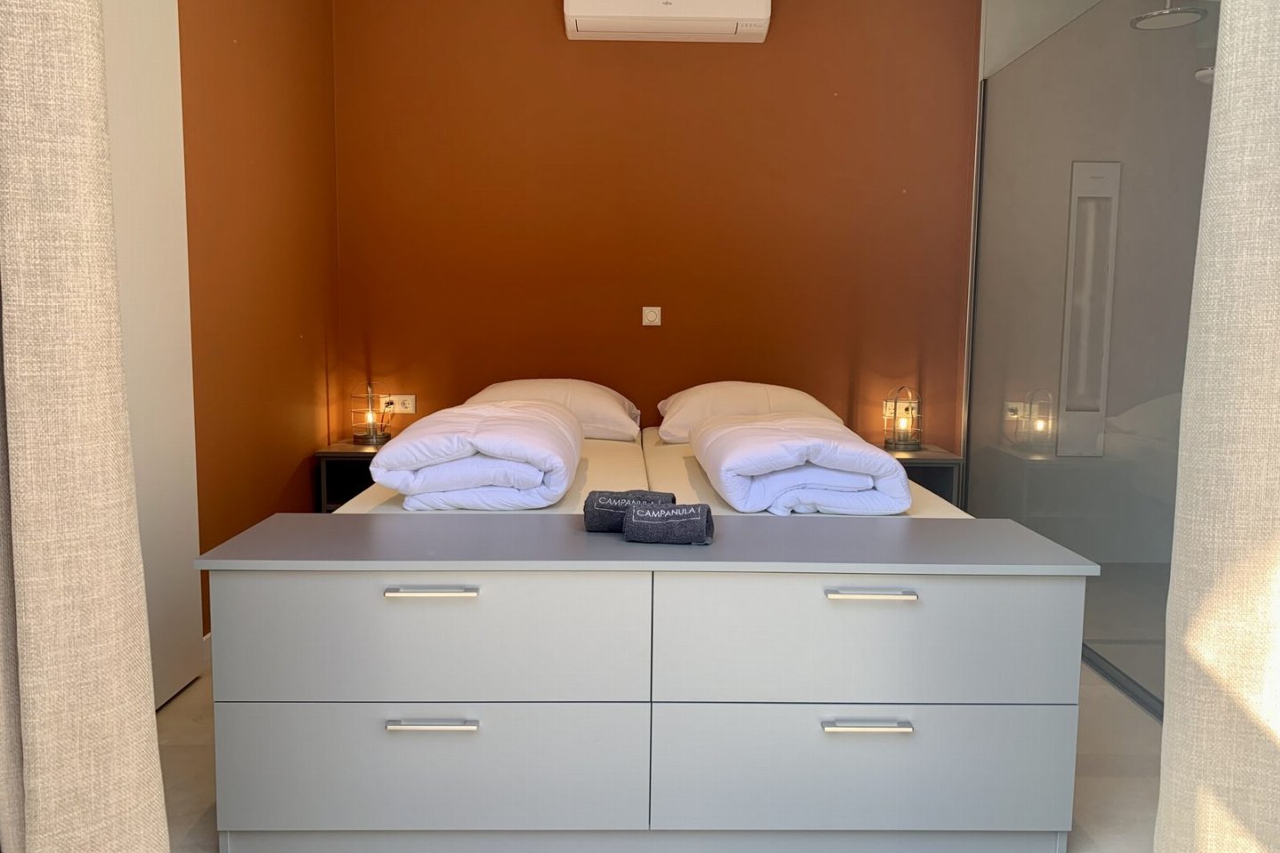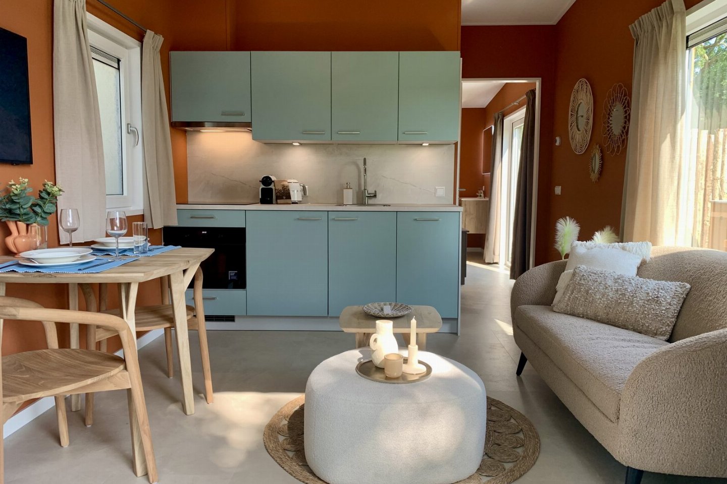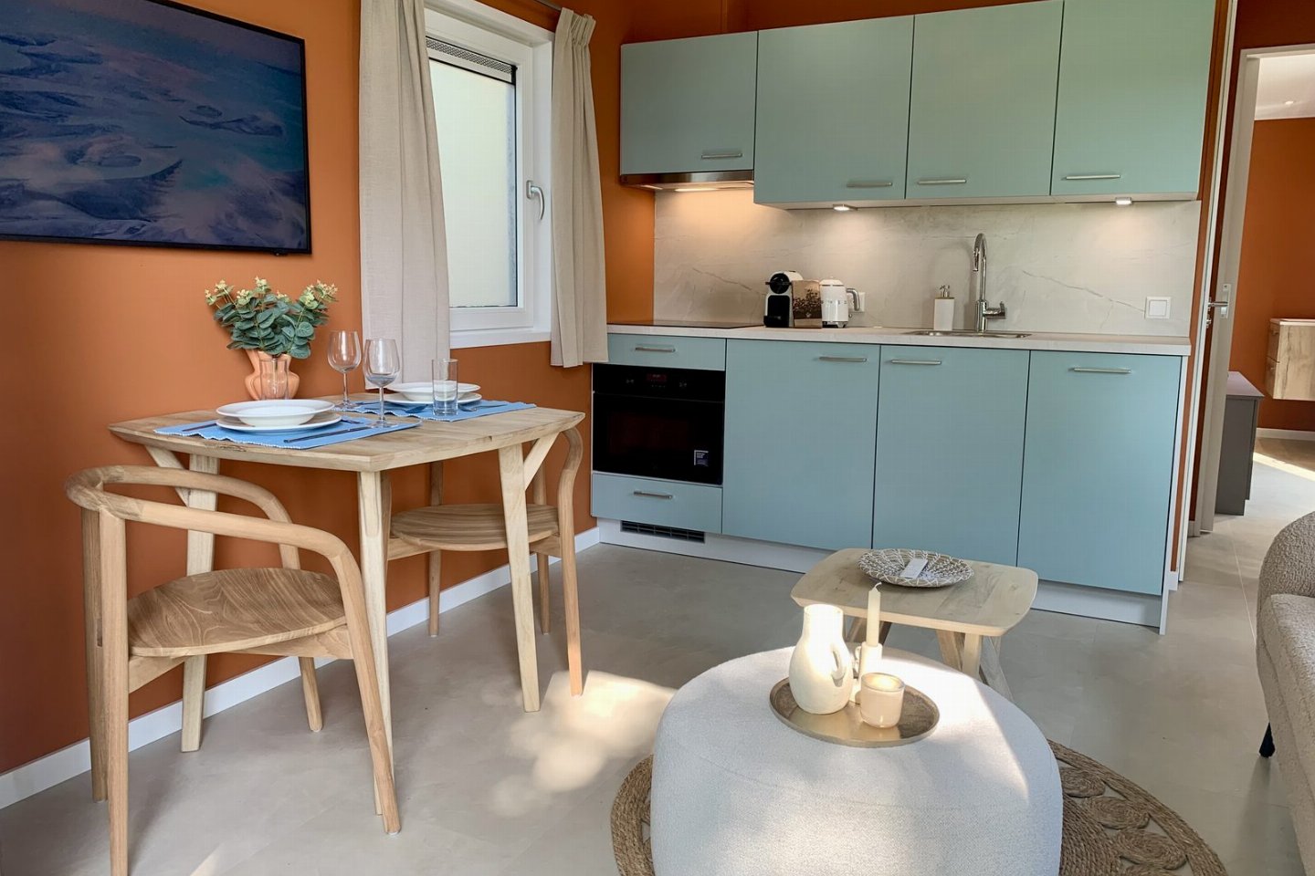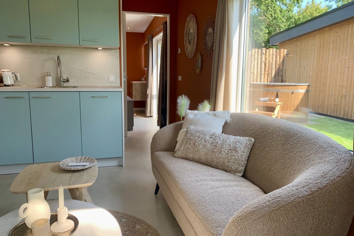De terracotta wanden, zandkleurige vloer, beige gordijnen en lichtblauwe keuken zorgen samen met de kustaccessoires voor een warme en eigentijdse uitstraling. Slaap- en badkamerDe slaapkamer heeft een eigen badkamer met dubbele regendouche en een luxe Sunshower voor weldadige infraroodwarmte.