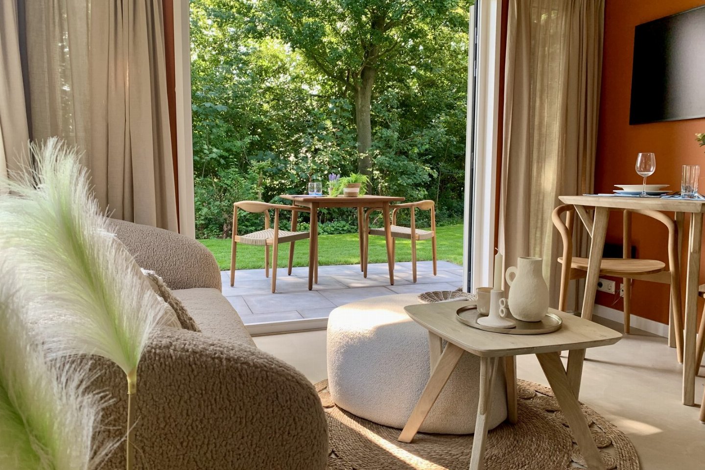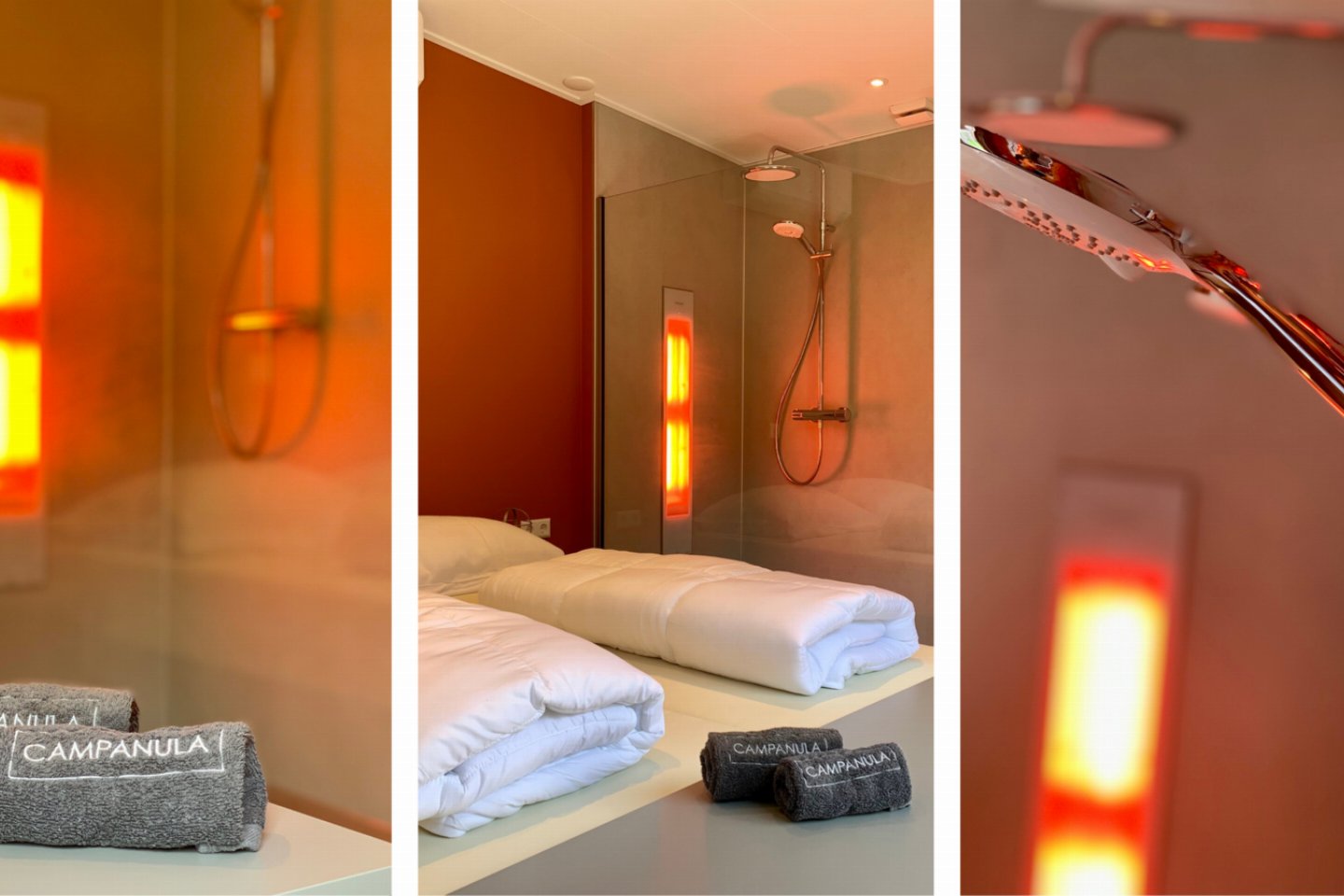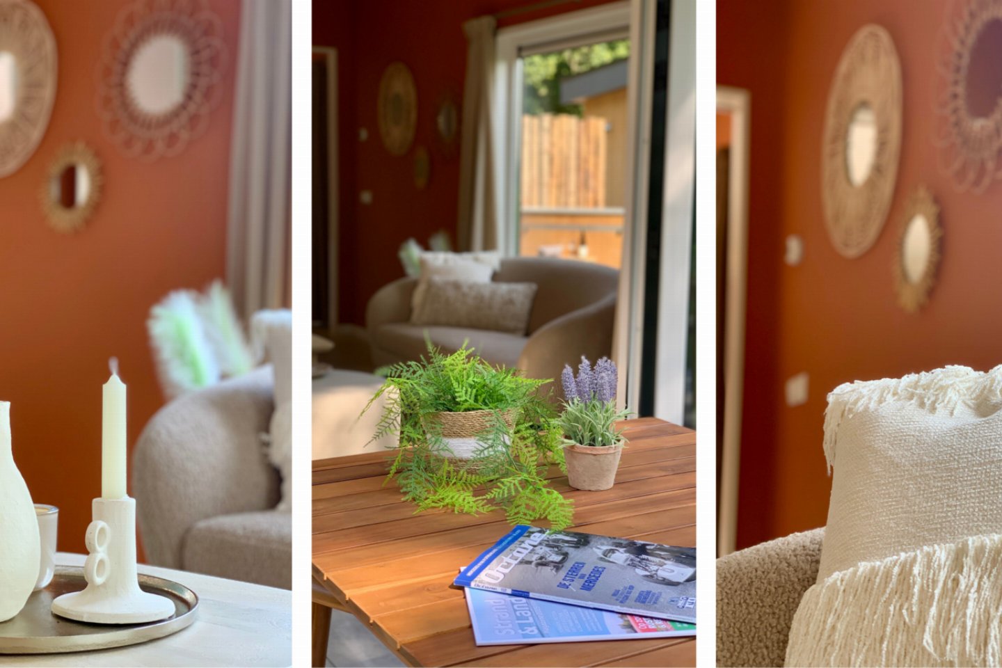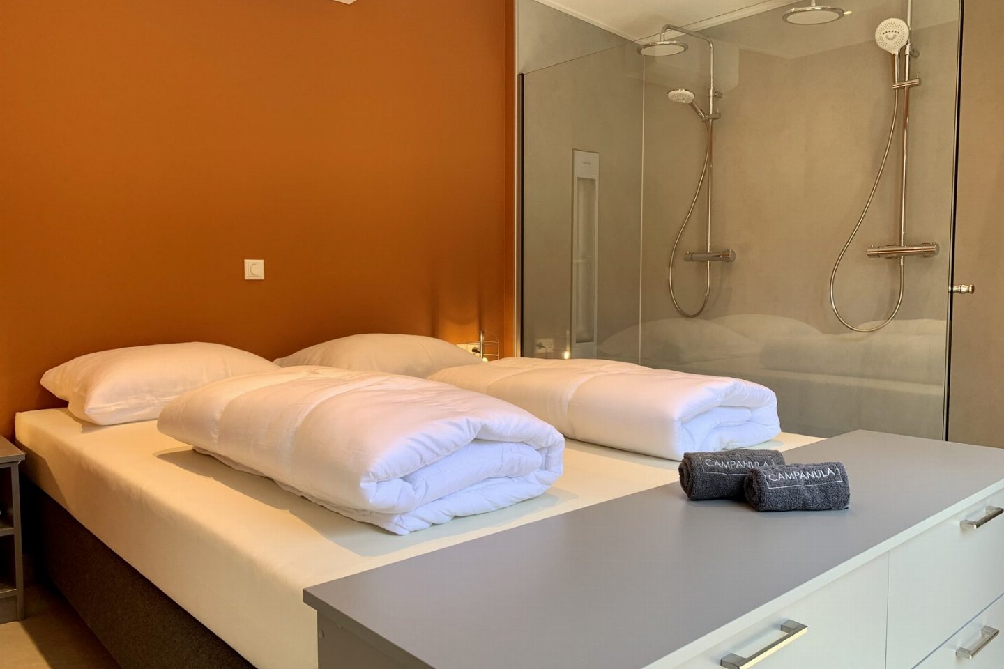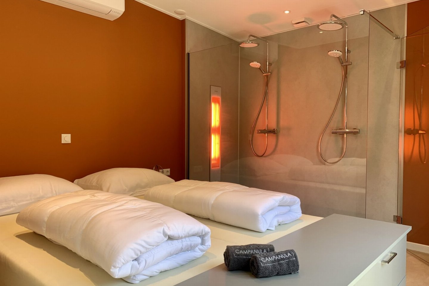 De terracotta wanden, zandkleurige vloer, beige gordijnen en lichtblauwe keuken zorgen samen met de kustaccessoires voor een warme en eigentijdse uitstraling. Slaap- en badkamerDe slaapkamer heeft een eigen badkamer met dubbele regendouche en een luxe Sunshower voor weldadige infraroodwarmte.