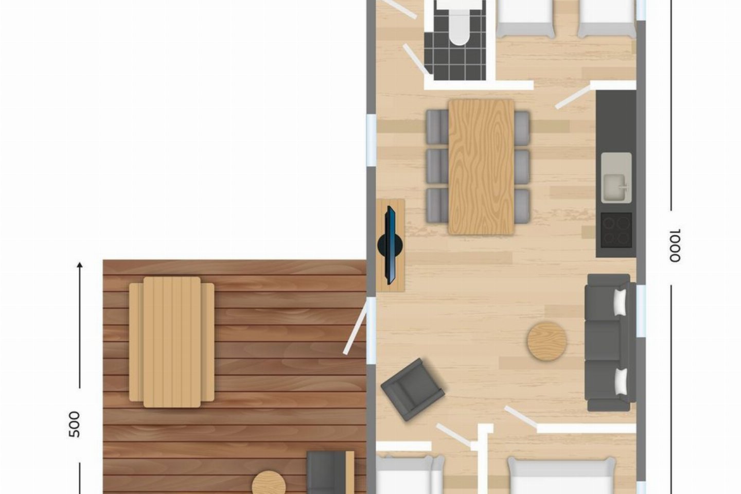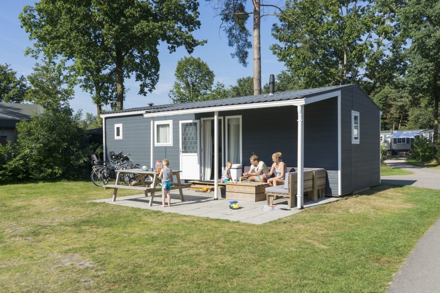 Je vindt in deze accommodatie een mooie zithoek om samen jullie favoriete tv-programma's te kijken. De keuken is voorzien van alle gemakken en er is een ruime eettafel om gezellig samen te eten. In het chalet vind je drie slaapkamers voor zes personen. De masterbedroom heeft een comfortabel 2-persoons boxspringbed. In de tweede slaapkamer staan twee 1-persoonsbedden en in de derde slaapkamer vind je een stapelbed. Voor het aantal gereserveerde personen vanaf 2 jaar is standaard bedlinnen aanwezig. In de badkamer vind je een douche met losse douchekop en een wastafel, het toilet bevindt zich in een aparte ruimte. Genieten van een warme zomerdag of een heerlijk herfstzonnetje terwijl de kinderen spelen in de speeltuin? De veranda biedt plaats aan een loungebank en picknicktafel waar je gezellig kan ontspannen met het hele gezin.