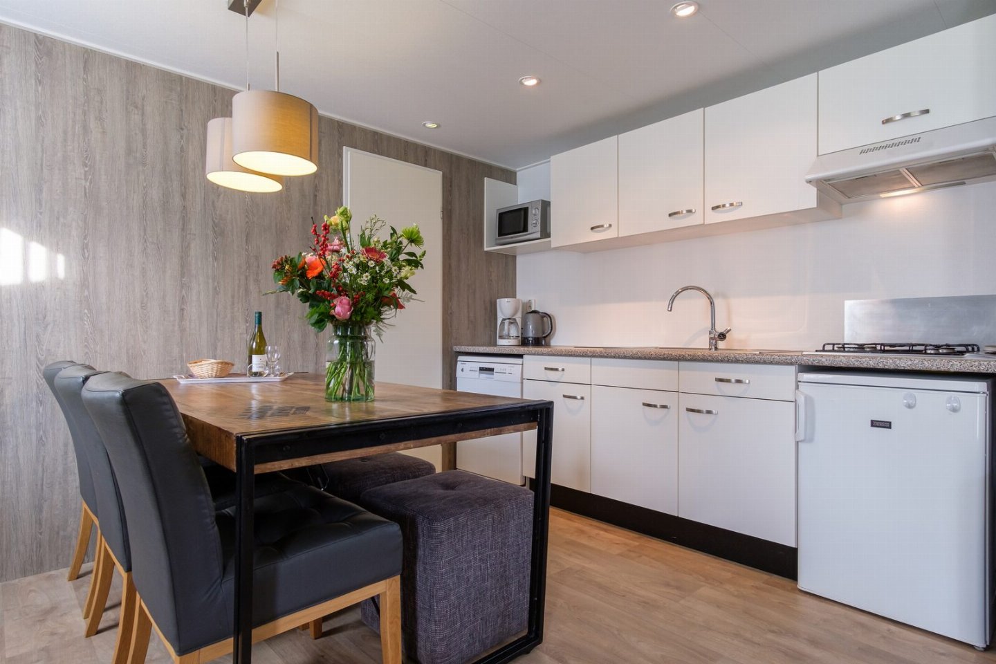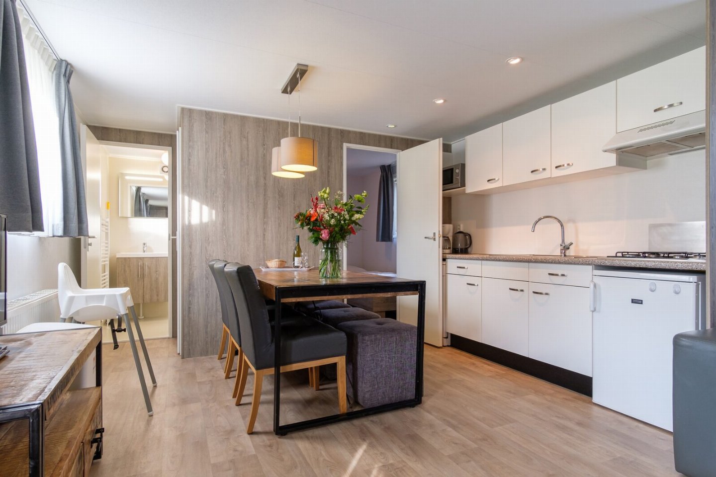 Verblijf in onze Chalet Stiefje om lekker te genieten met je familie tijdens een weekendje weg of vakantie. De keuken is voorzien van alle gemakken en er is een ruime eettafel om gezellig samen te eten. In het chalet vind je drie slaapkamers voor zes personen.