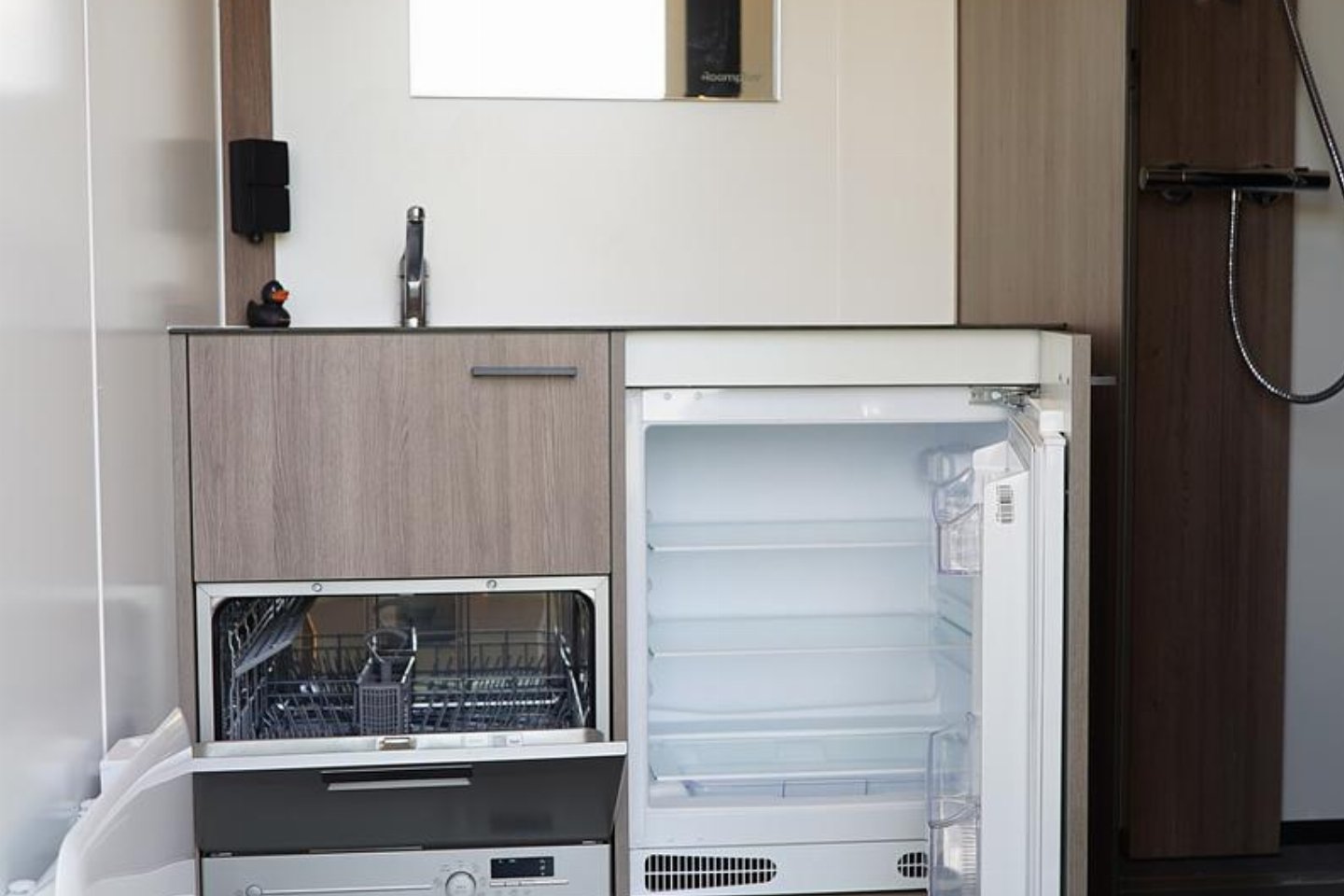 Nederland, Overijssel, RheezeLuxe privé sanitair met naast een wastafel, douche en toilet ook een vaatwasser en koelkast in uw privé sanitair. Deze luxe units staan op royale autovrije plekken van circa 150 m2. Zodra de units op ons terrein geplaatst zijn zullen we actuele fotos plaatsen.