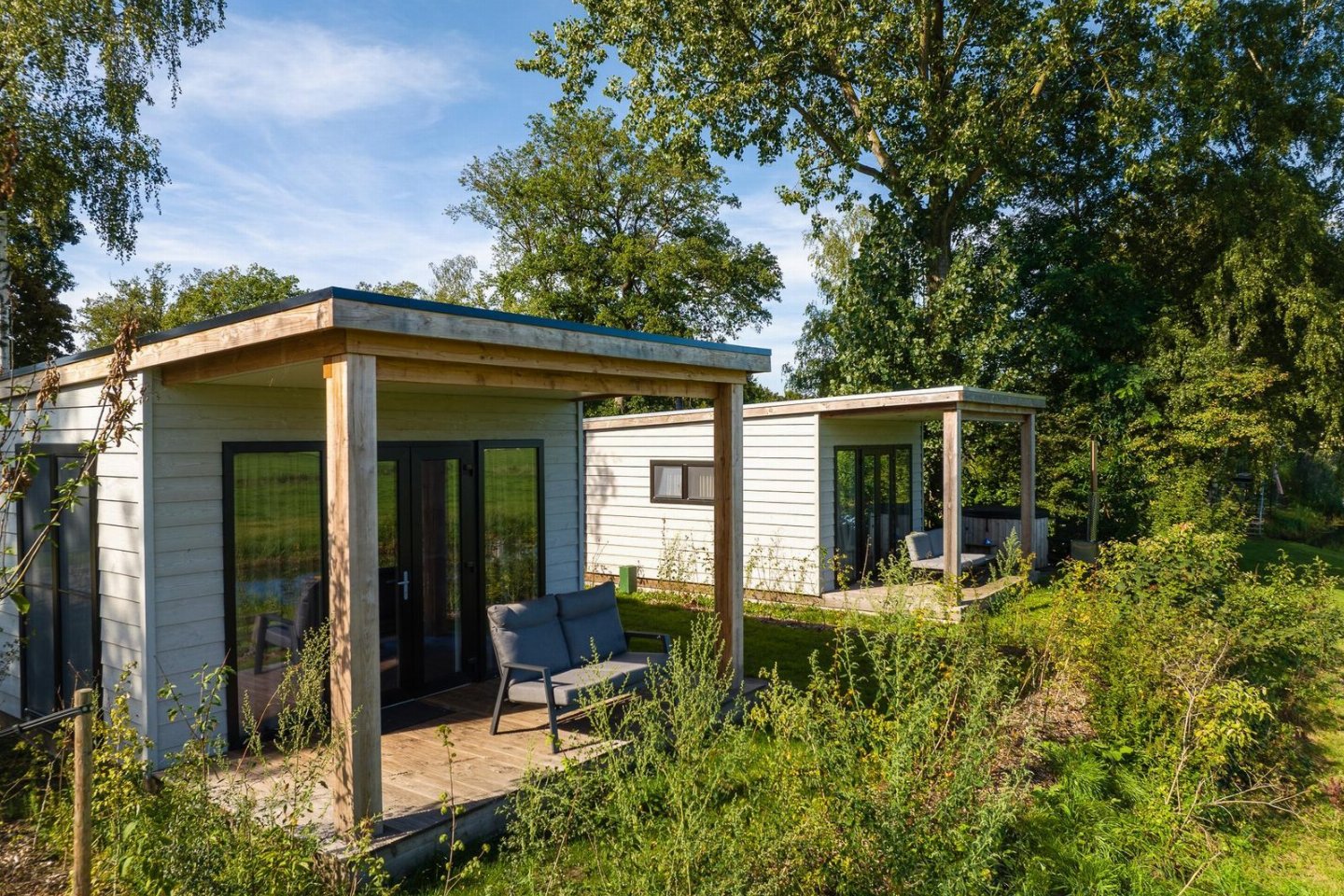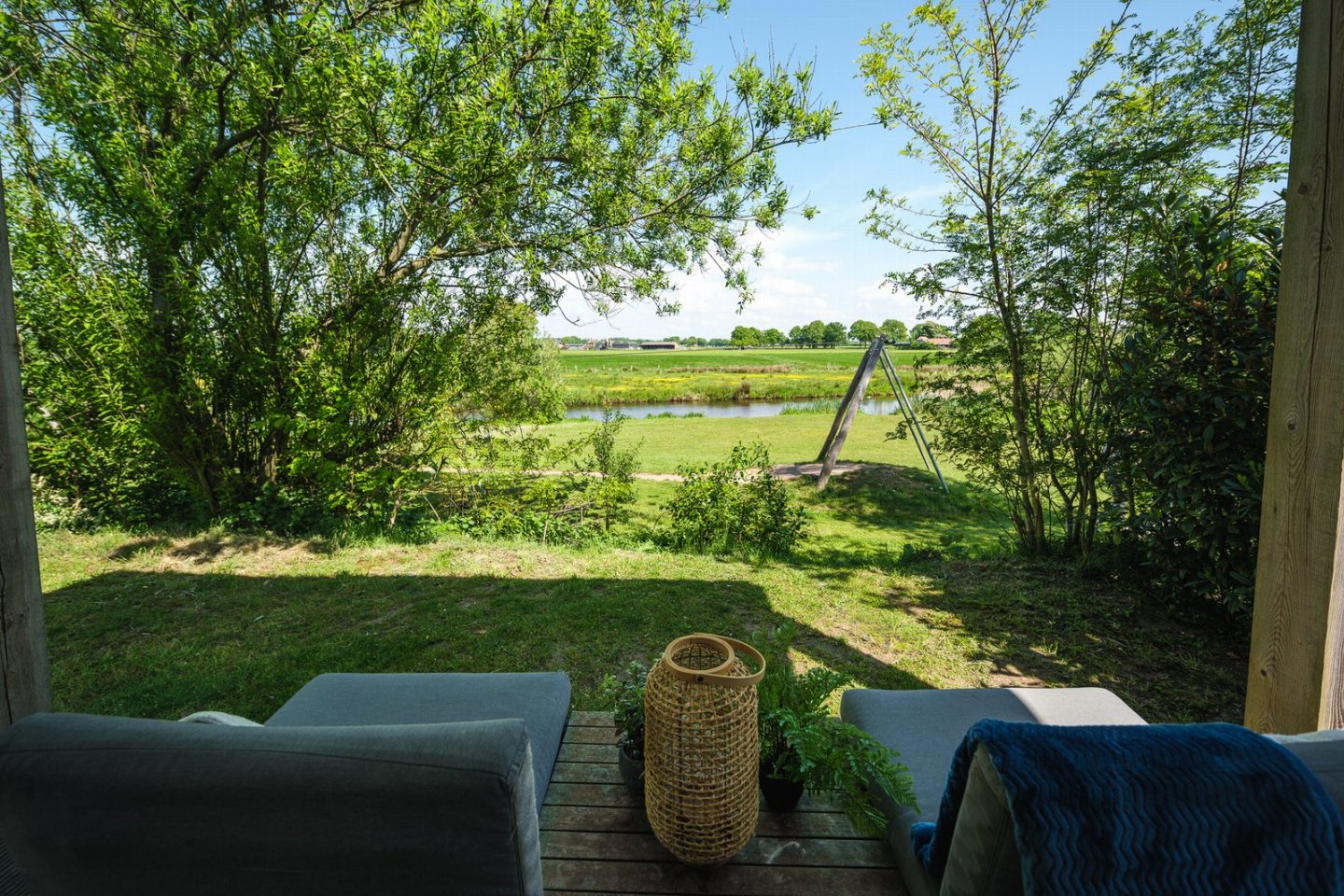 Nederland, Overijssel, ZunaDe River Lodge is een heerlijke vakantiewoning direct aan het water. Deze accommodatie is luxe ingericht en geeft een prachtig uitzicht over het Twentse landschap en het riviertje de Regge. Vanaf het overkapte terras kun je de koeien zien grazen en heb je s avonds een prachtige zonsondergang.