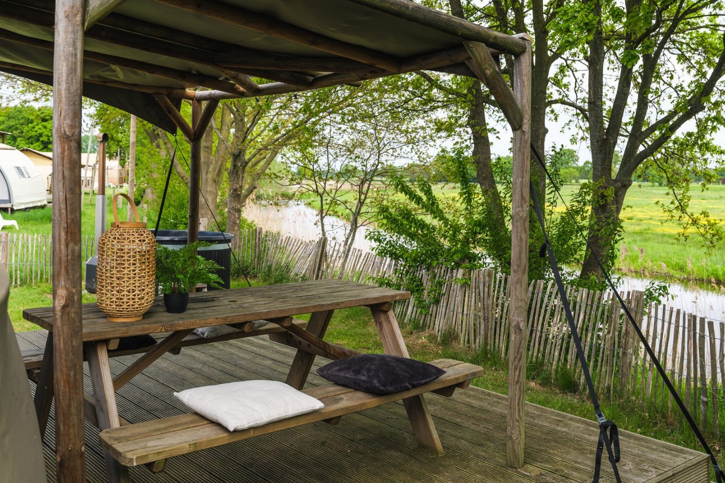 De Riverdome is een luxe tent met het comfort van een huisje. Je beschikt over je eigen keukentje met koelkast, badkamer en terras. Als je verblijf in de Riverdome leef je lekker buiten, maar kan je je terugtrekken in het gezellige Dome wanneer het gaat regenen of wanneer het kouder wordt. De gezellige zithoek beschikt over comfortabele stoelen, er is een gezellige tafel om samen aan te eten en er staan heerlijke bedden klaar. Aan de binnenkant zitten gordijnen, die je volledige privacy geven. Deze dome is zelfs uitgerust met een houtgestookte hottub. Heerlijk! Er is een 2-persoonsbed en 2-1 persoonsbedden. De 1-persoonsbedden zijn geschikt voor kinderen tot een leeftijd van ca. 12 jaar. Er is ruimte om een kinderbedje te plaatsen.Â