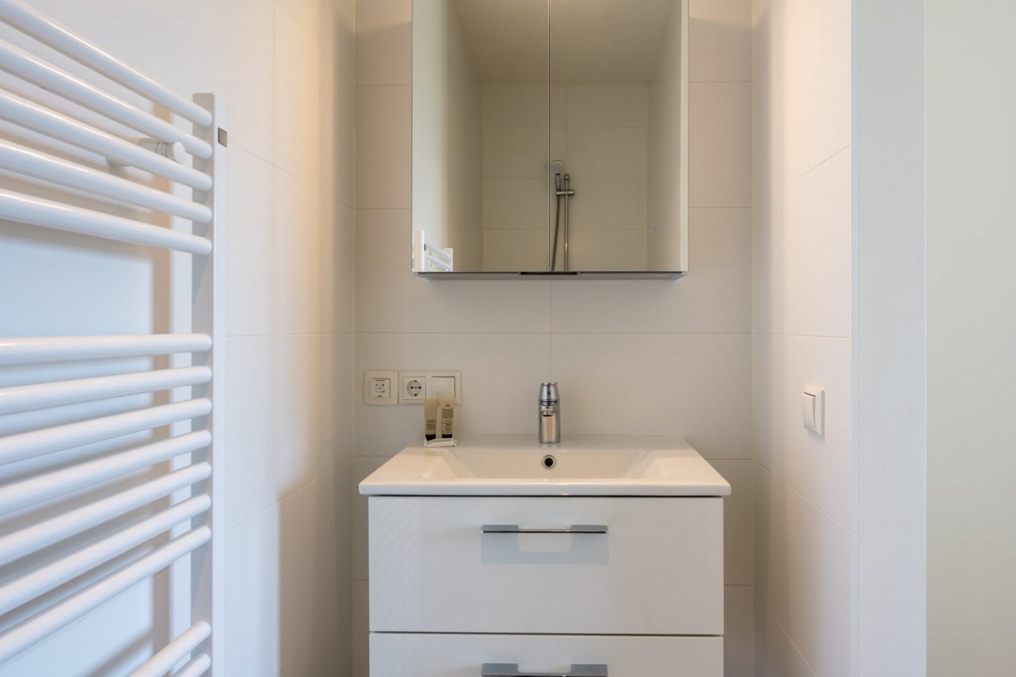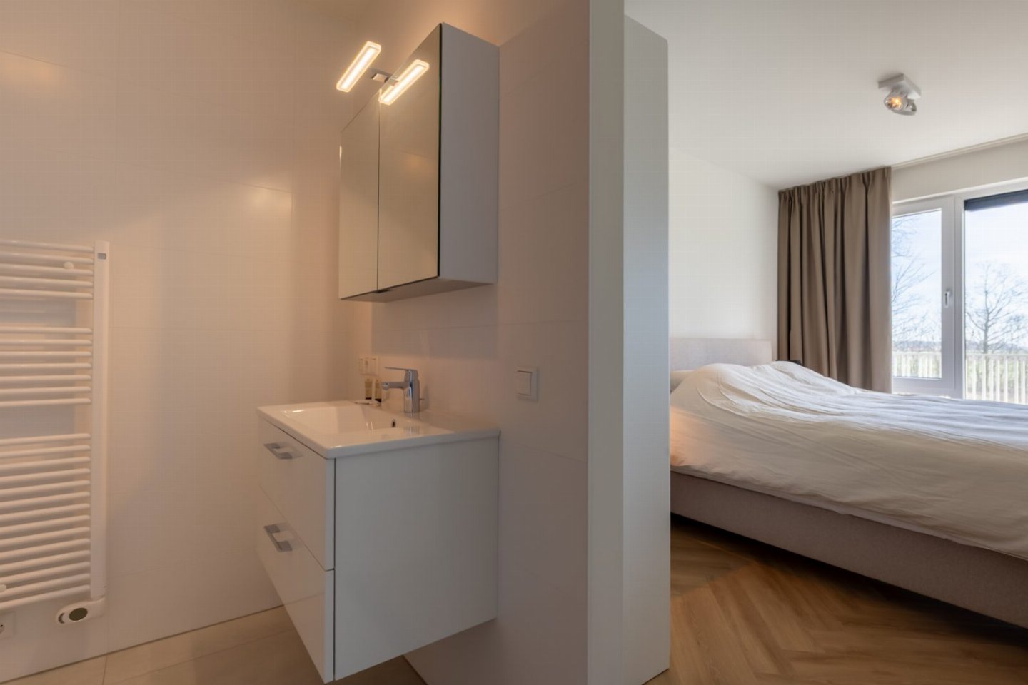 Dit appartement is ingericht voor 4 personen en gelegen op de eerste etage van het complex. De entree geeft toegang tot twee ruime slaapkamers en een luxe badkamer. De slaapkamers zijn uitgerust met tweepersoonsbedden. Bij aankomst zorgen wij dat de bedden fris voor u zijn opgemaakt en dat er handdoeken aanwezig zijn. De badkamer is voorzien van inloop- regendouche en wastafel. In de hal is een apart toilet.Â