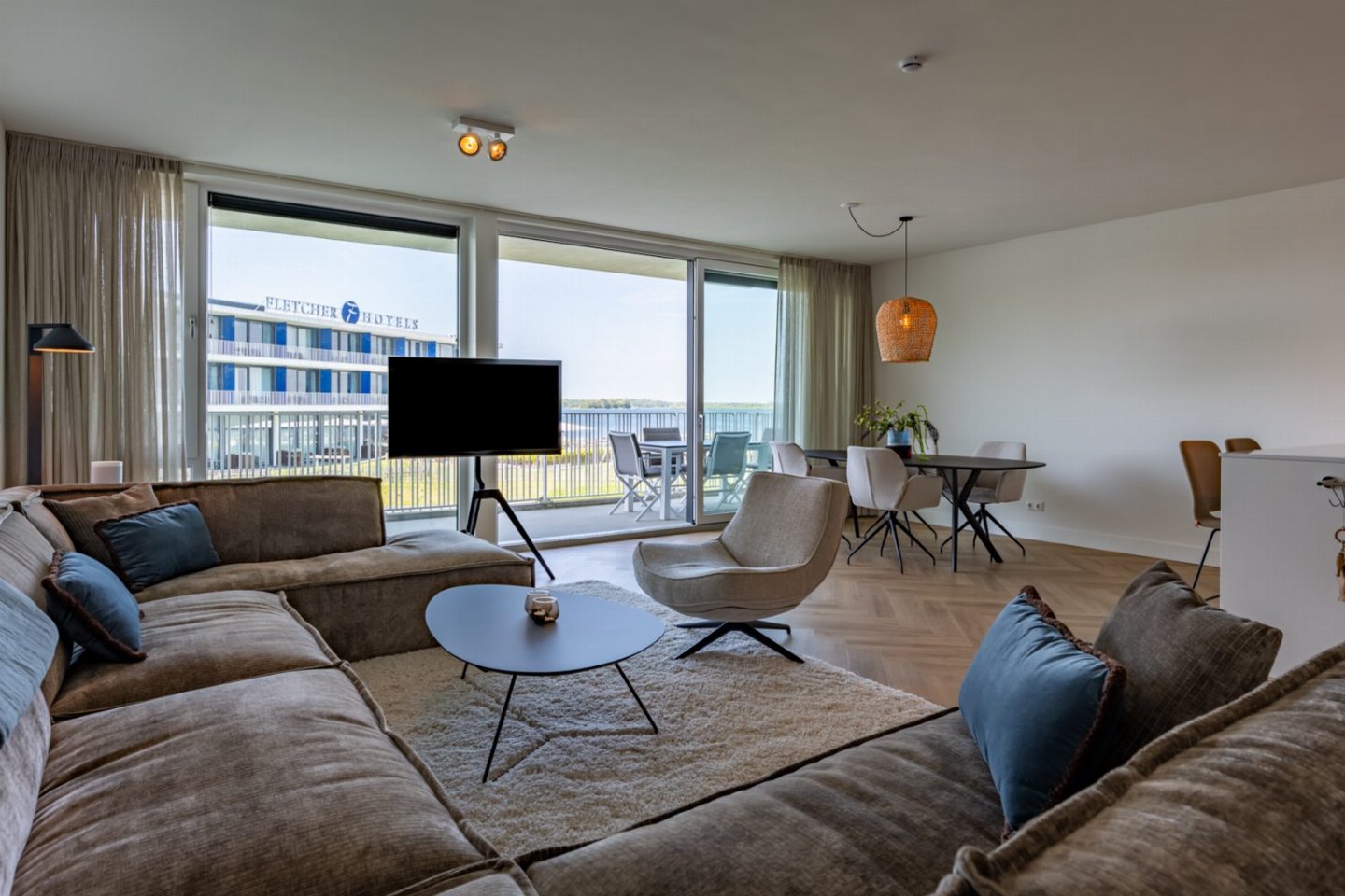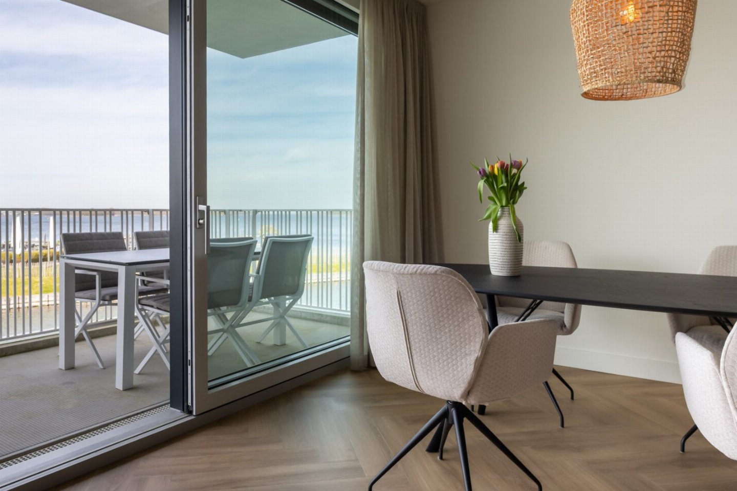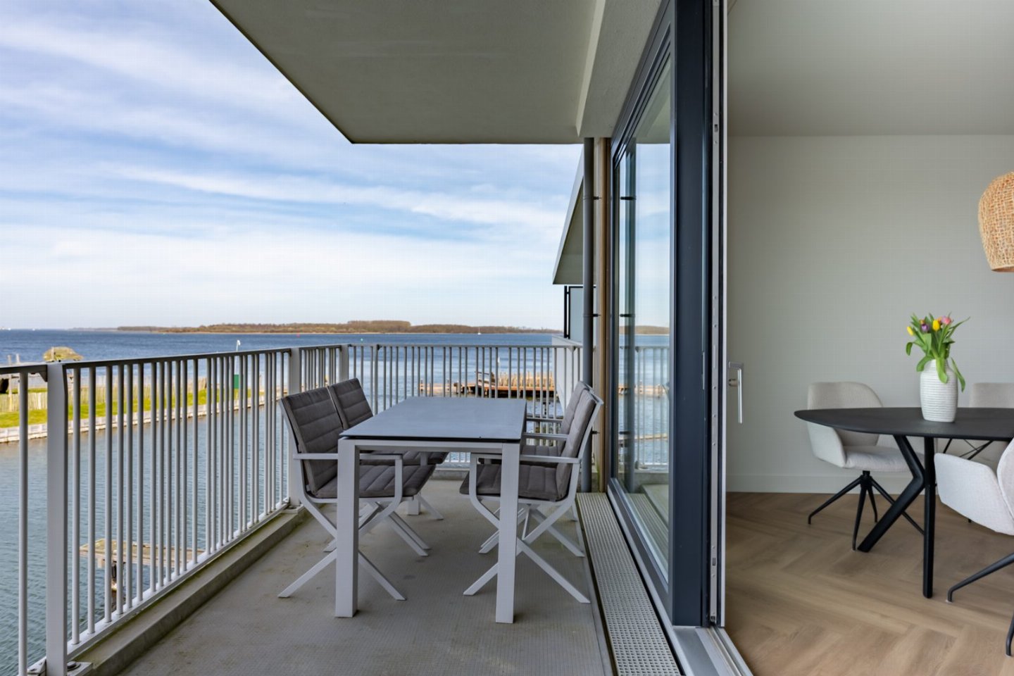 De lichte en sfeervol ingerichte woonkamer heeft een comfortabele zithoek en een Smart TV met buitenlandpakket. Vanuit de woonkamer heeft u toegang tot het ruime balkon met eettafel voor 6 personen. Hier kunt u de hele dag genieten van een adembenemend uitzicht over het uitgestrekte Veerse Meer. Tot in de late uurtjes varen de bootjes hier voorbij, terwijl u geniet van een glas wijn.Â