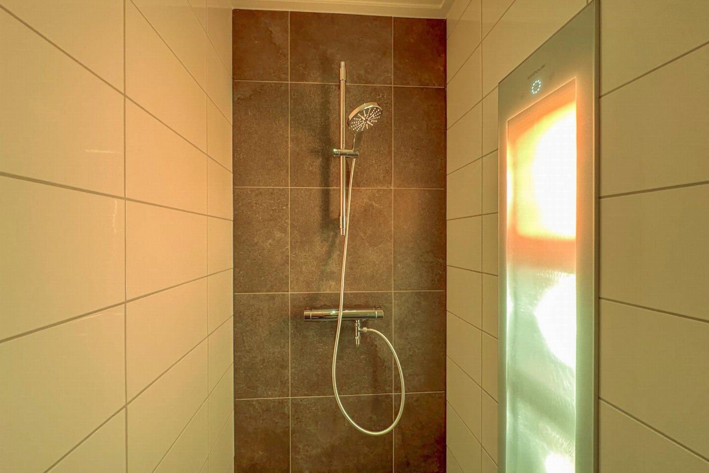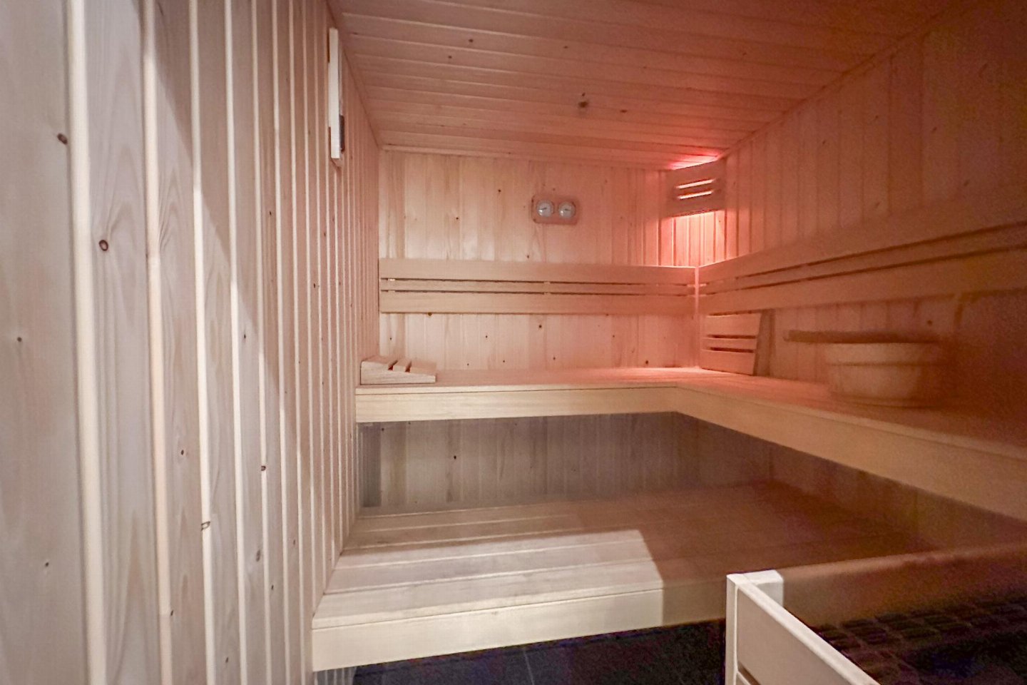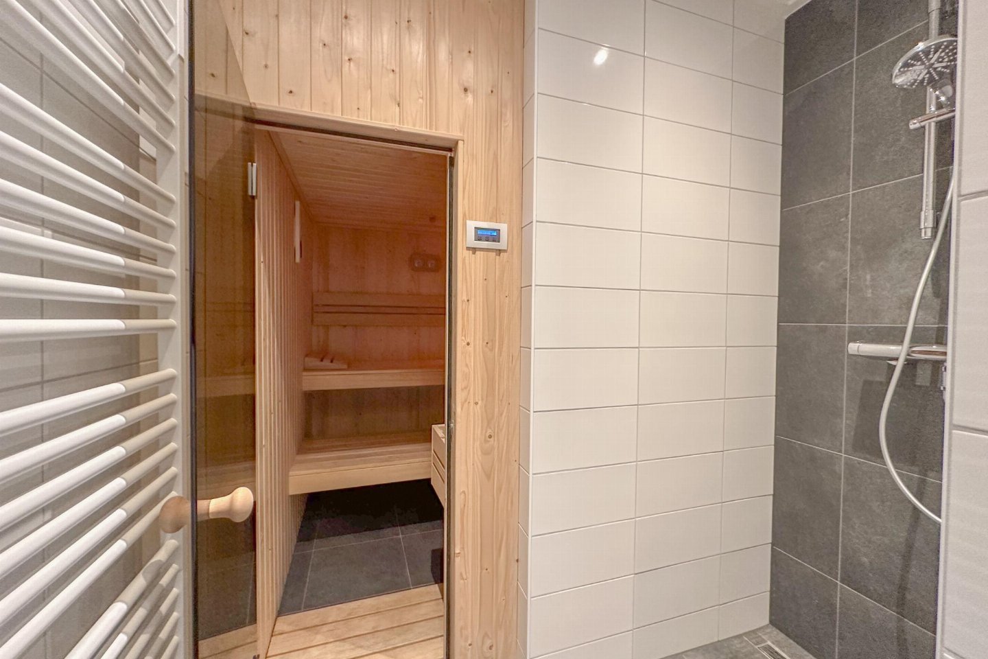 Begane grond: open keuken met waterkoker, fornuis, afzuigkap, koffiezetapparaat(nespresso cups), oven, magnetron, afwasmachine, koelkast( vriesvak) , woon/eetkamer met TV(flatscreen, smart TV), eettafel, sfeerhaard, zithoek , slaapkamer met badkamer met 2x 1-pers. bed(90 x 210 cm), douche, wastafel, wc, airconditioning, haardroger , badkamer met douche, sunshower, sauna, wc, wasmachine , toilet met wc , berging met stofzuiger
