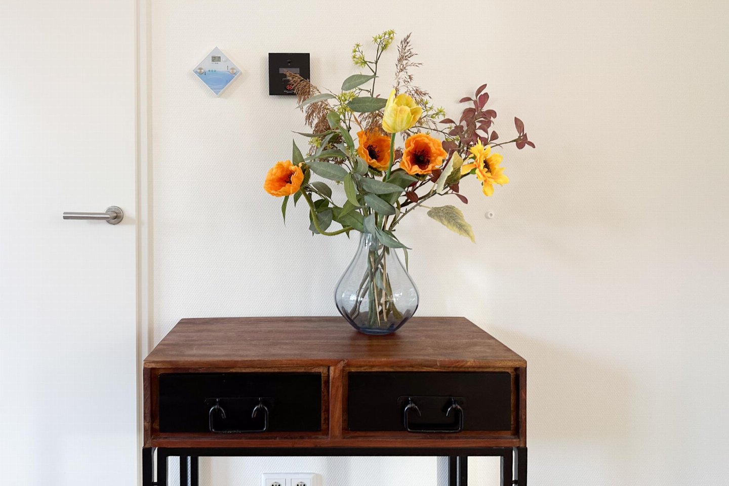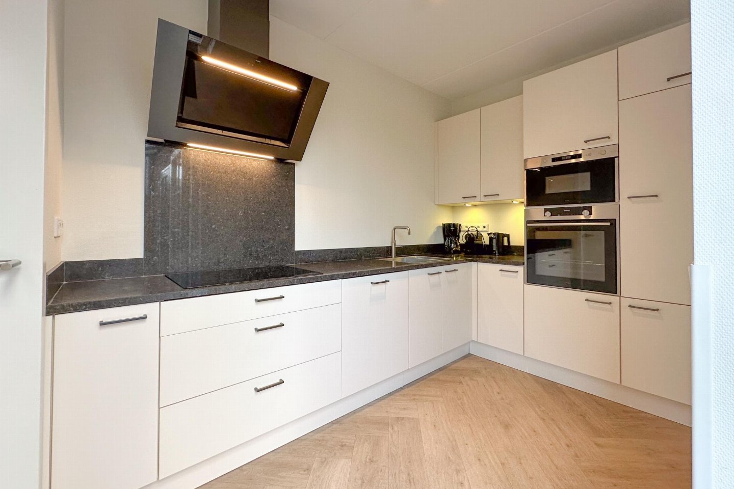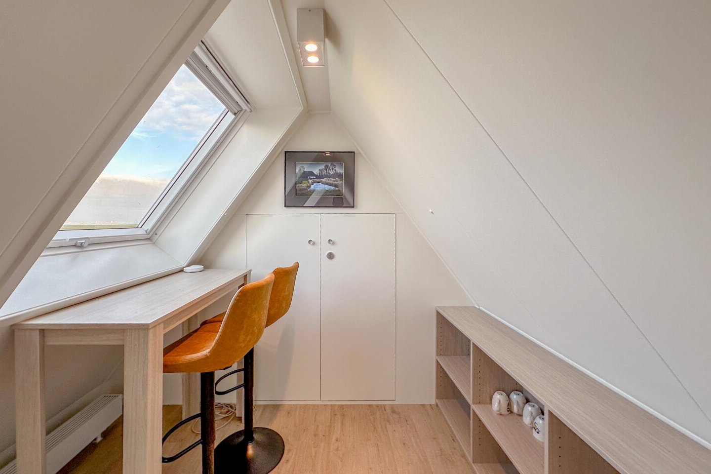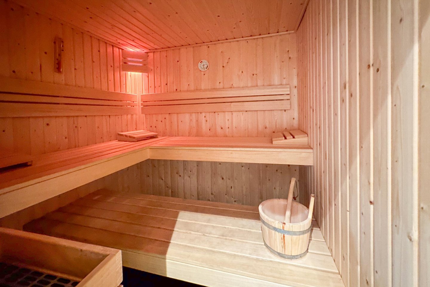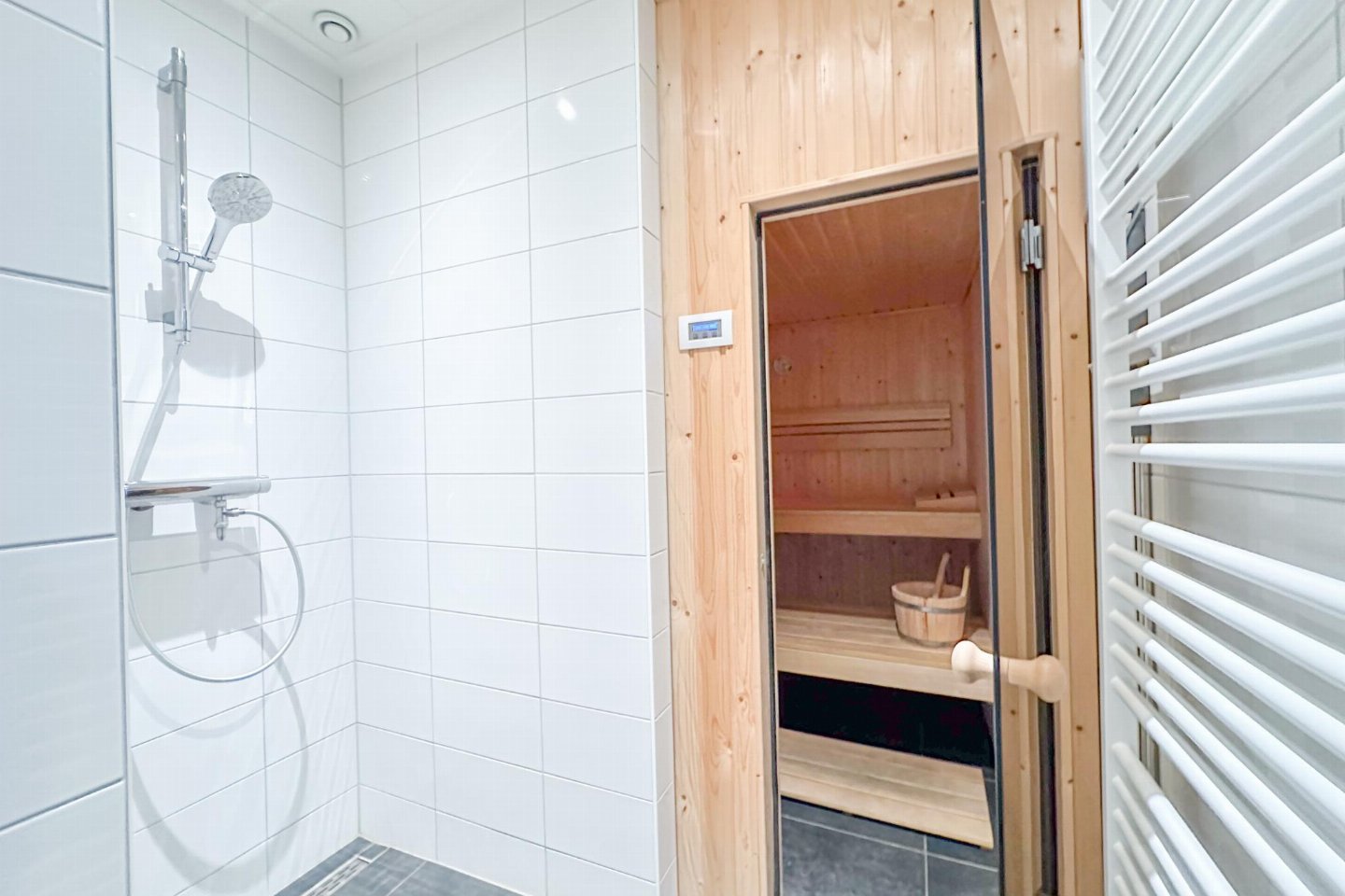 Begane grond: open keuken met waterkoker, fornuis(4 kookplaten), koffiezetapparaat(nespresso cups), oven, magnetron, afwasmachine, koelkast( vriesvak) , woon/eetkamer met TV(flatscreen, smart TV), eettafel, eettafel(4 personen), sfeerhaard , slaapkamer met badkamer met 2x 1-pers. bed(90 x 210 cm), TV(flatscreen, smart TV), douche, wastafel, wc, haardroger , badkamer met sunshower, sauna, wasmachine , toilet met wc , veranda met eettafel , verwarming(CV, vloerverwarming)
