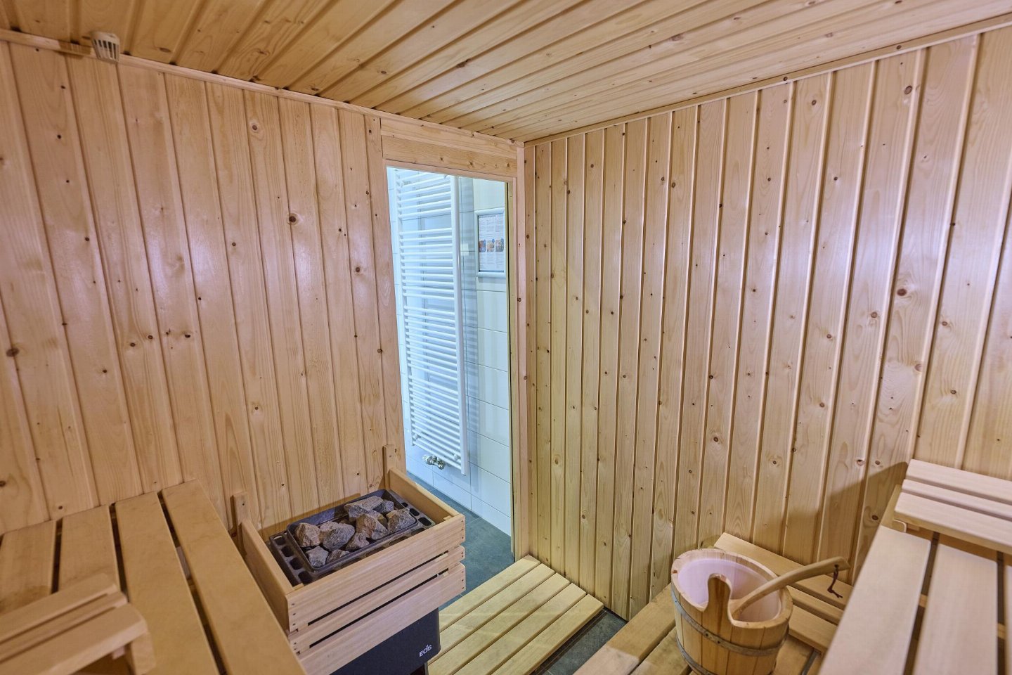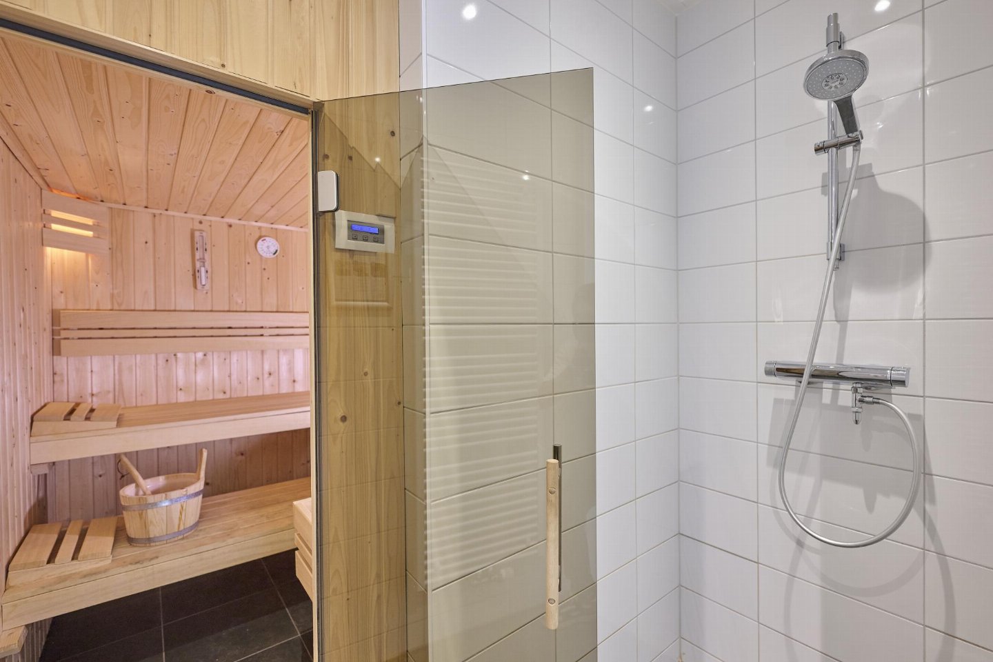 Begane grond: open keuken met waterkoker, fornuis, afzuigkap, koffiezetapparaat(nespresso cups), oven, magnetron, afwasmachine, koelkast( vriesvak) , woon/eetkamer met TV(flatscreen, smart TV), eettafel, sfeerhaard, zithoek , slaapkamer met badkamer met 2x 1-pers. bed(90 x 210 cm), TV(flatscreen), douche, wastafel, wc, haardroger , toilet met wc , saunaruimte met douche, sunshower, sauna , berging met wasdroger, wasmachine, stofzuiger
