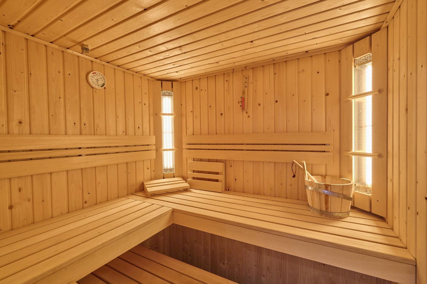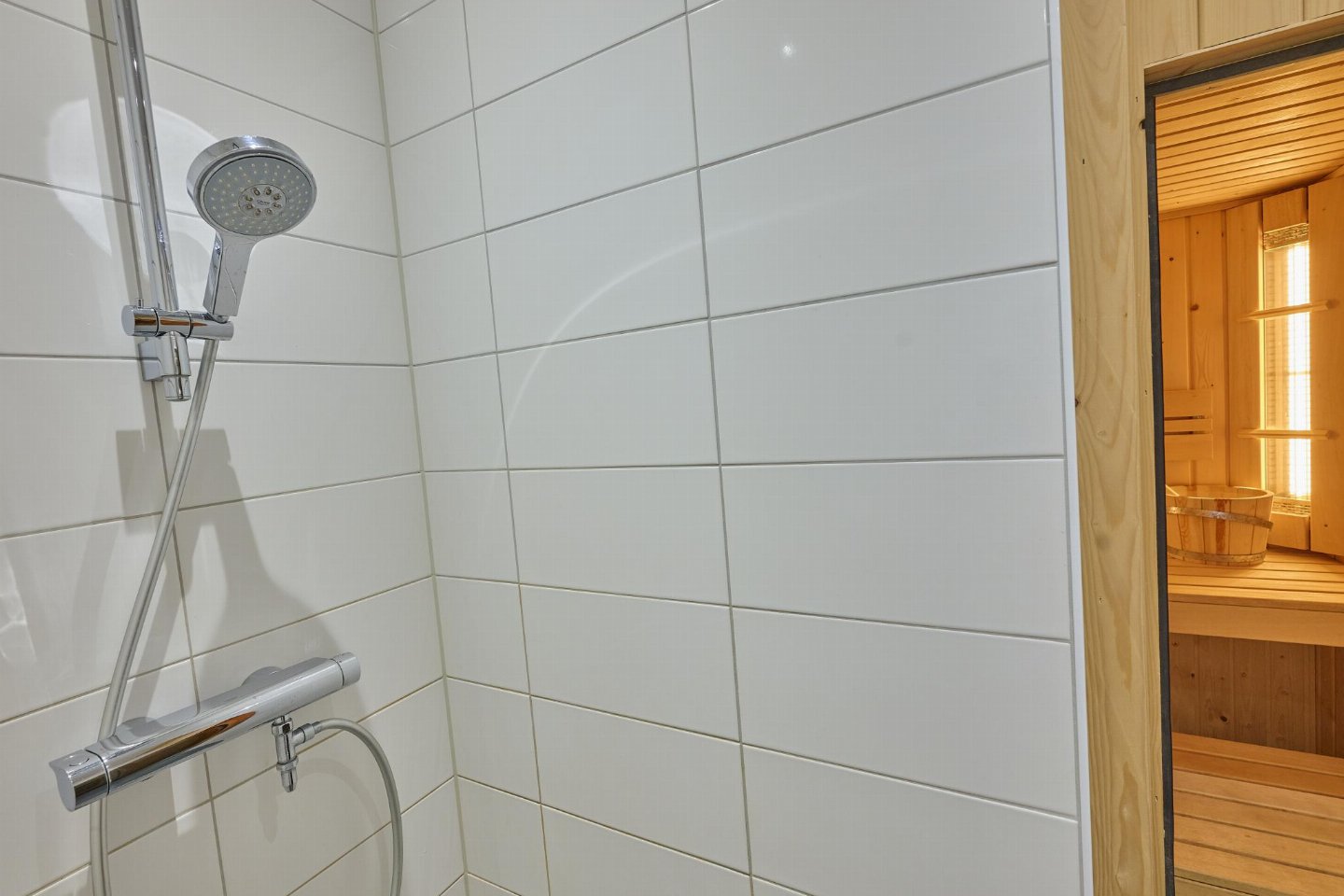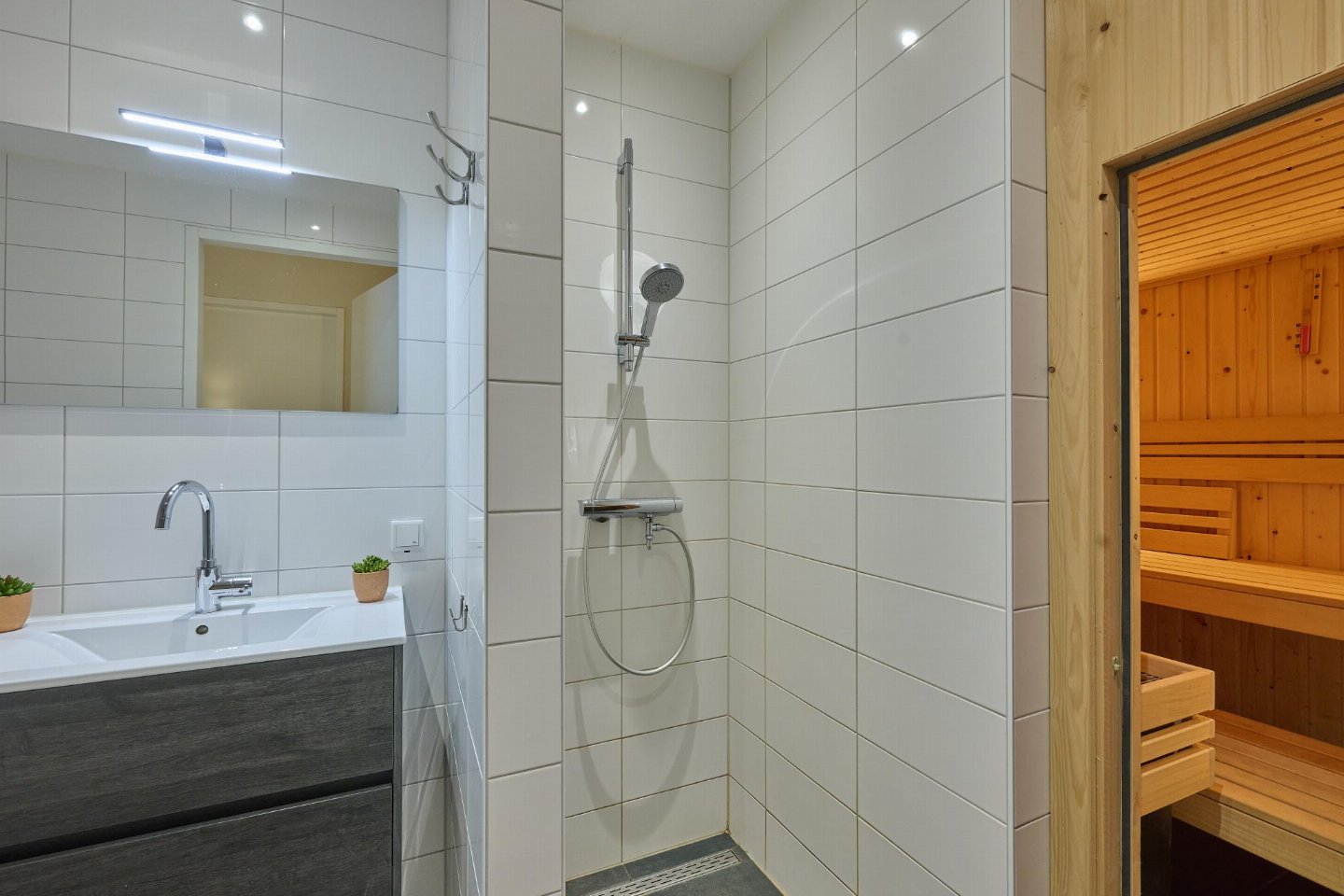 Begane grond: open keuken met waterkoker, fornuis(4 kookplaten), koffiezetapparaat(nespresso cups), oven, magnetron, afwasmachine, koelkast( vriesvak) , woon/eetkamer met TV, eettafel, zithoek , slaapkamer met 2x 1-pers. bed(90 x 210 cm), TV , slaapkamer met 2x 1-pers. bed(90 x 210 cm), TV , badkamer met ligbad, douche, wastafel, haardroger , toilet met wc , sauna(privé)