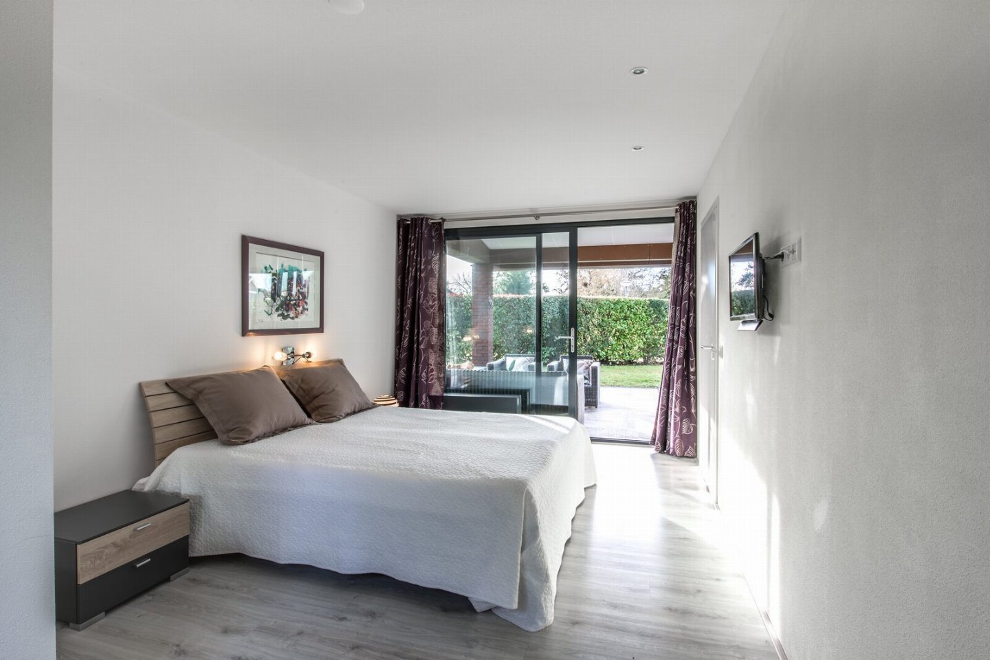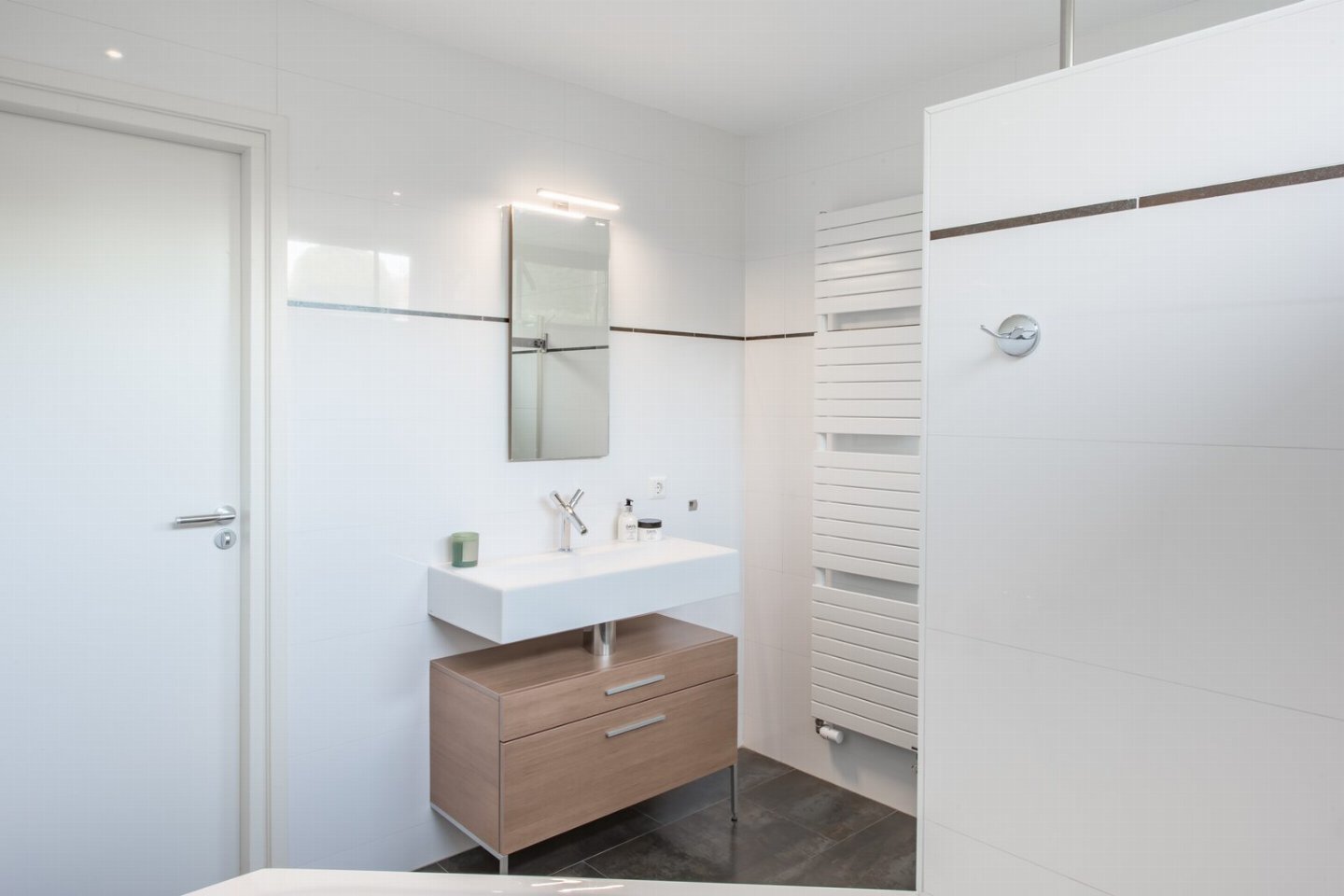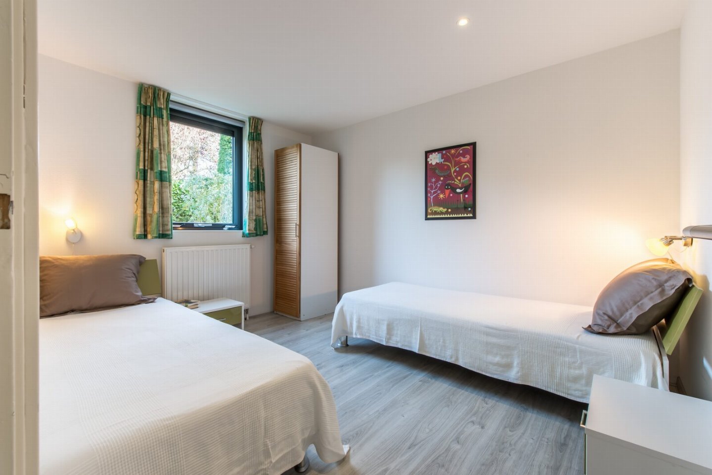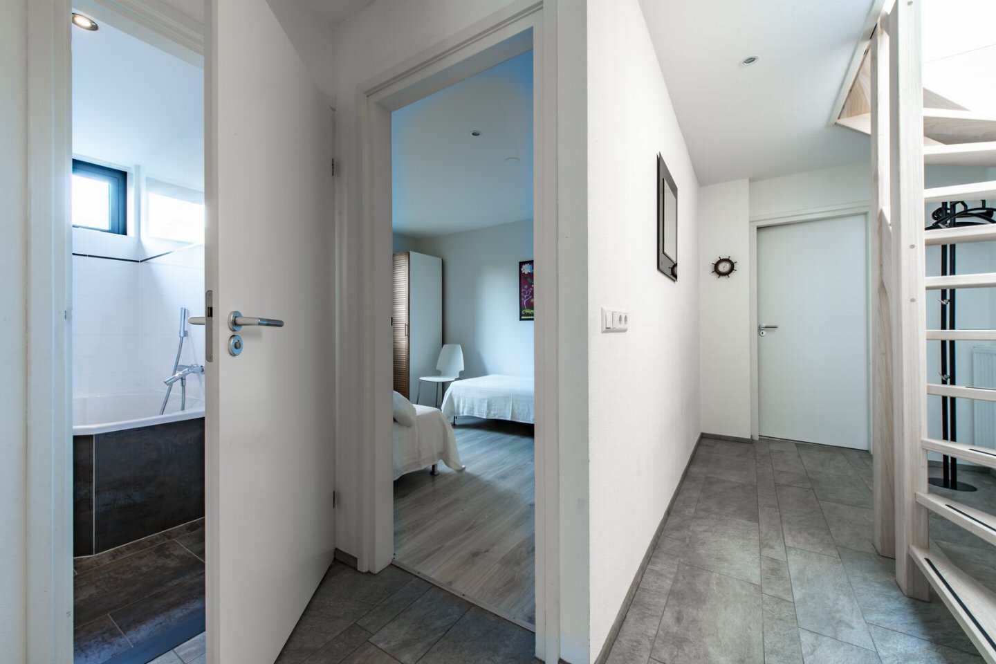 Op de begane grond bevinden zich twee slaapkamers, waarvan één slaapkamer met een tweepersoonsbed en een flatscreen tv en één slaapkamer met 2 éénpersoonsbedden. Daarnaast is er een badkamer met een ruime douche, bad en wastafel. In de hal bij de entree vindt u het toilet en de trap naar de eerste verdieping.