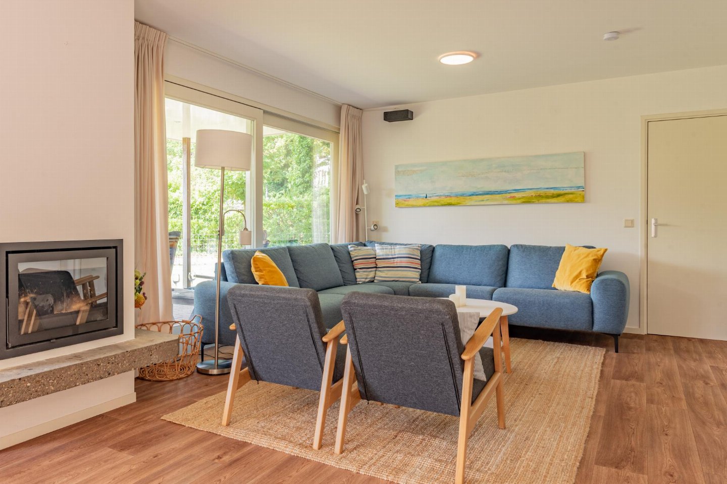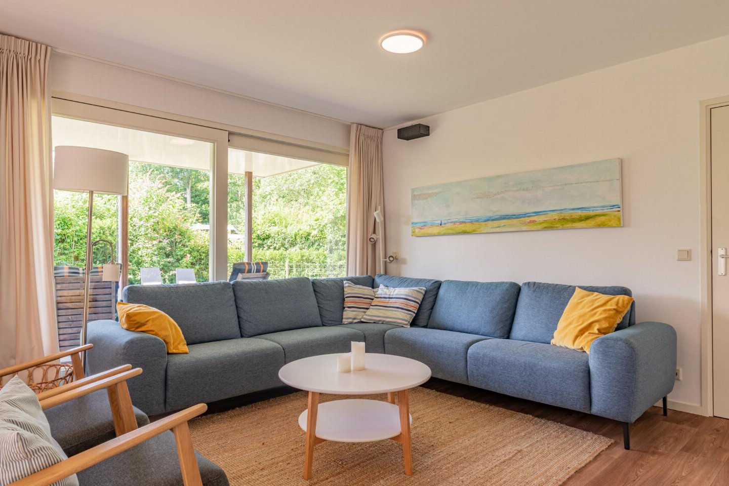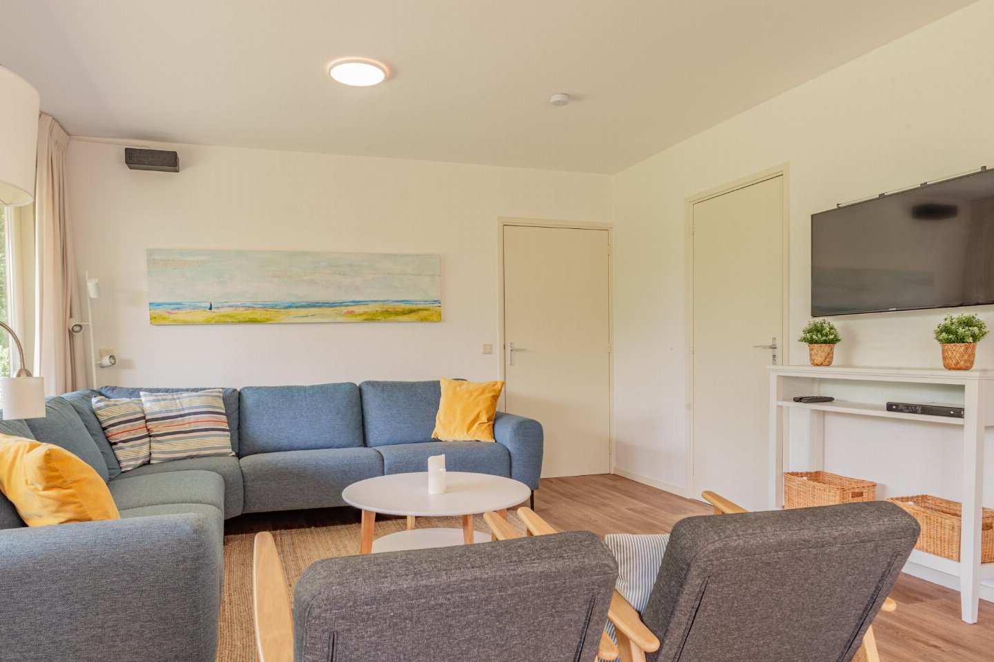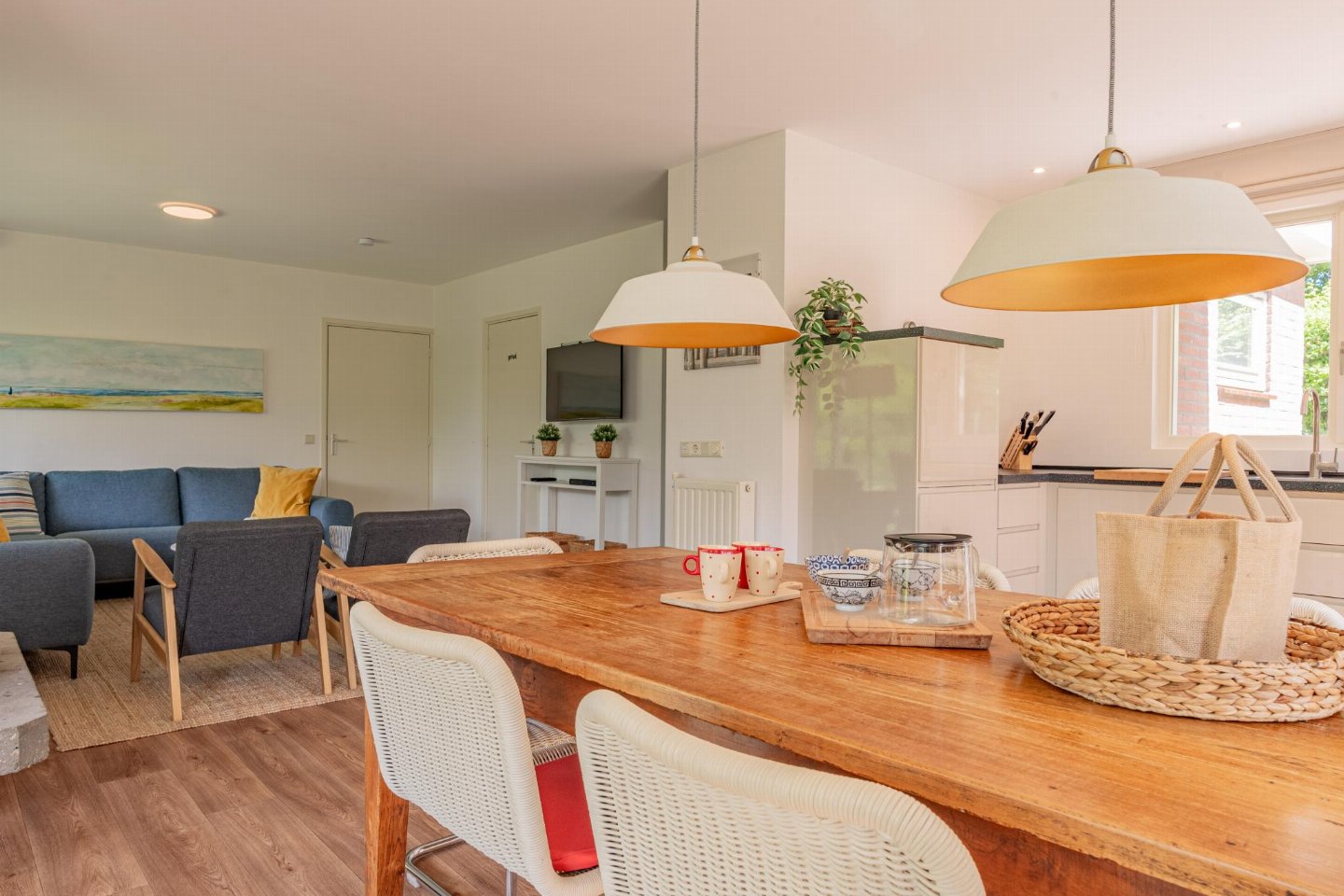Vrijstaande 6-persoons bungalow aan de voet van de duinen bij het Banjaardstrand. Een lichte, comfortabele woning met een warme woonkamer en houtkachel, verbonden met een open keuken. De bungalow beschikt over drie slaapkamers, waarvan één met een ensuite badkamer, plus een tweede badkamer en een apart toilet. Buiten geniet je van een overdekt terras en een ruime, groene tuin met veel privacy