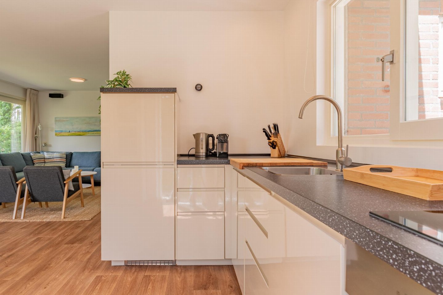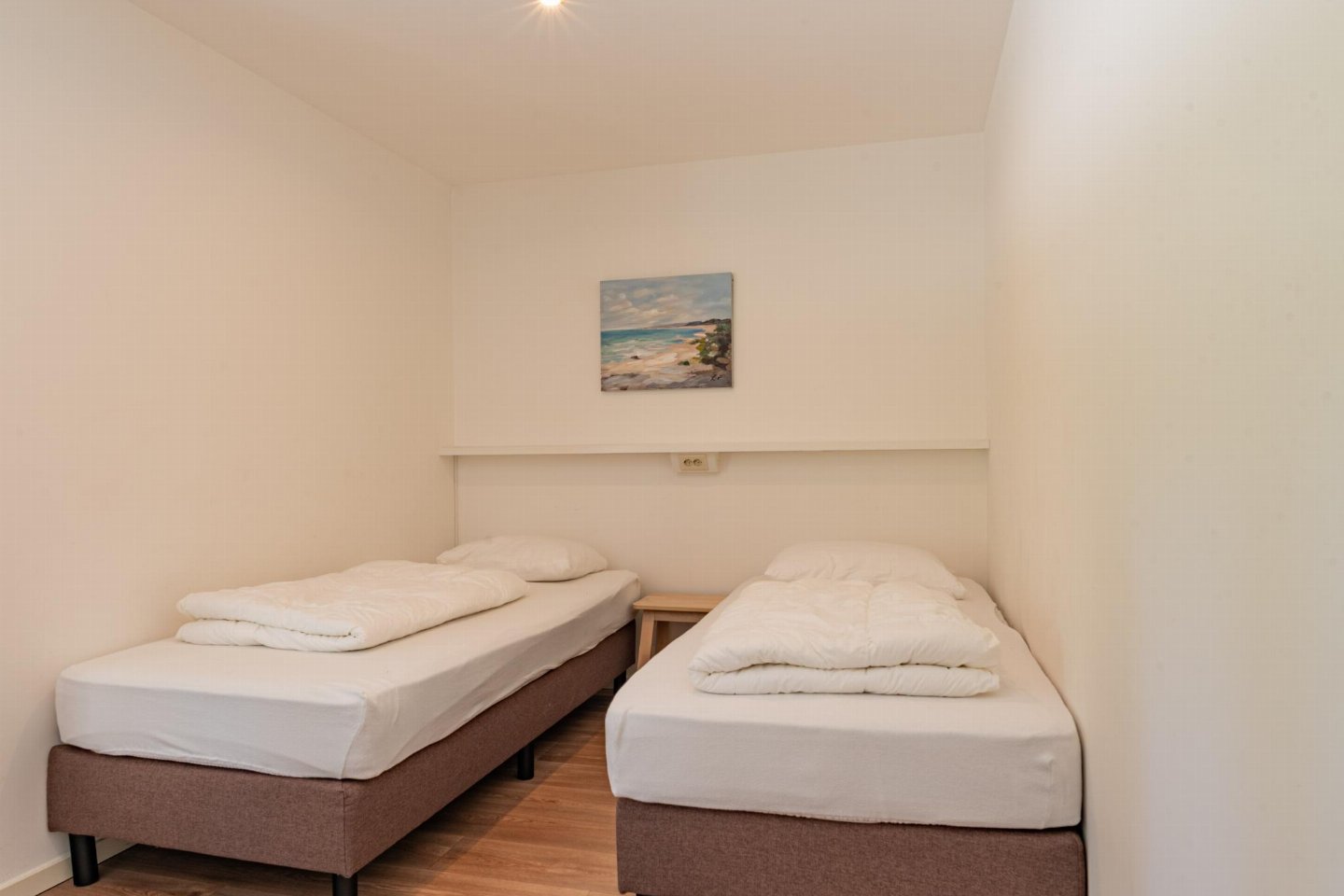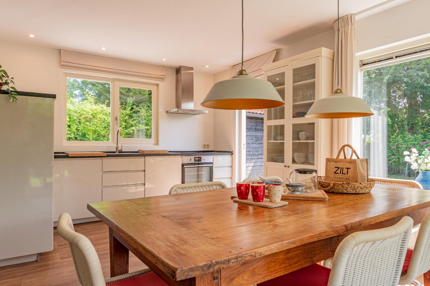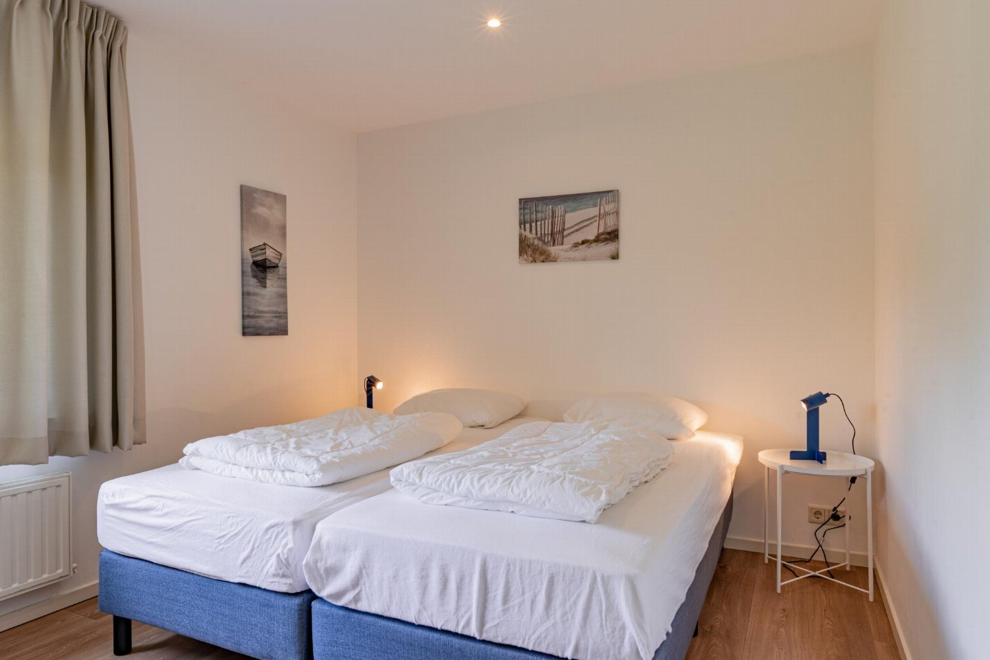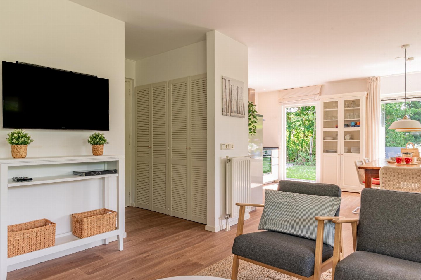 Vrijstaande 6-persoons bungalow aan de voet van de duinen bij het Banjaardstrand. Een lichte, comfortabele woning met een warme woonkamer en houtkachel, verbonden met een open keuken. De bungalow beschikt over drie slaapkamers, waarvan één met een ensuite badkamer, plus een tweede badkamer en een apart toilet. Buiten geniet je van een overdekt terras en een ruime, groene tuin met veel privacy