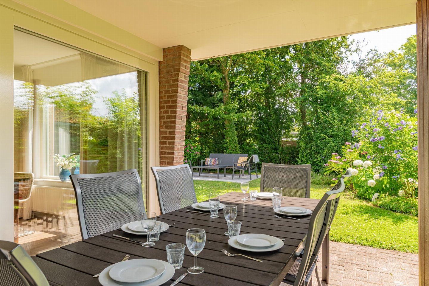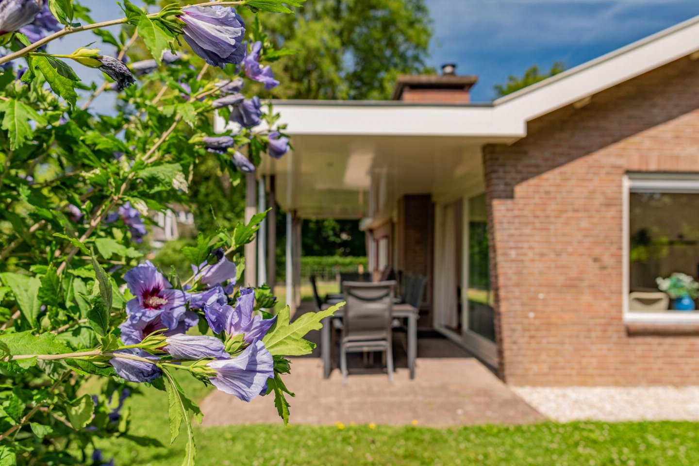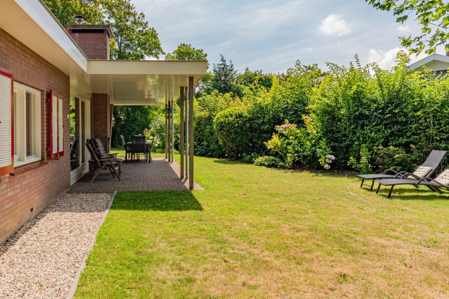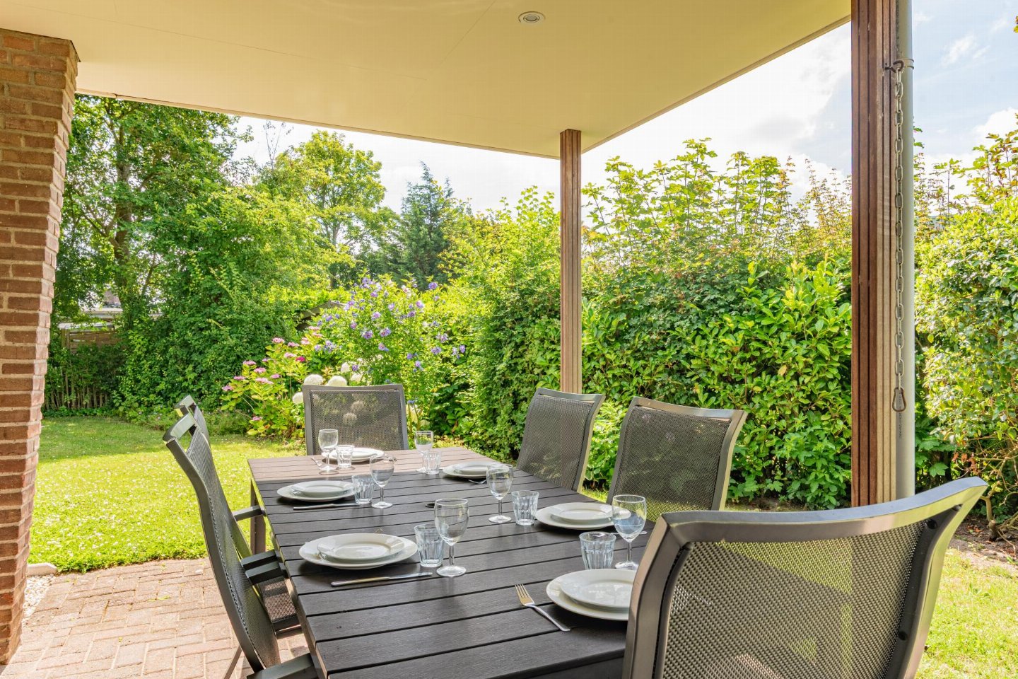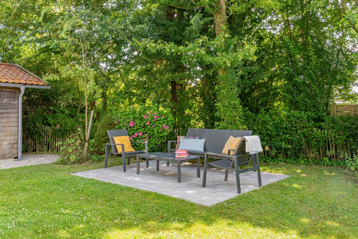 Vrijstaande 6-persoons bungalow aan de voet van de duinen bij het Banjaardstrand. Een lichte, comfortabele woning met een warme woonkamer en houtkachel, verbonden met een open keuken. De bungalow beschikt over drie slaapkamers, waarvan één met een ensuite badkamer, plus een tweede badkamer en een apart toilet. Buiten geniet je van een overdekt terras en een ruime, groene tuin met veel privacy