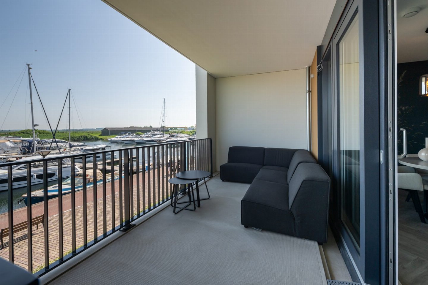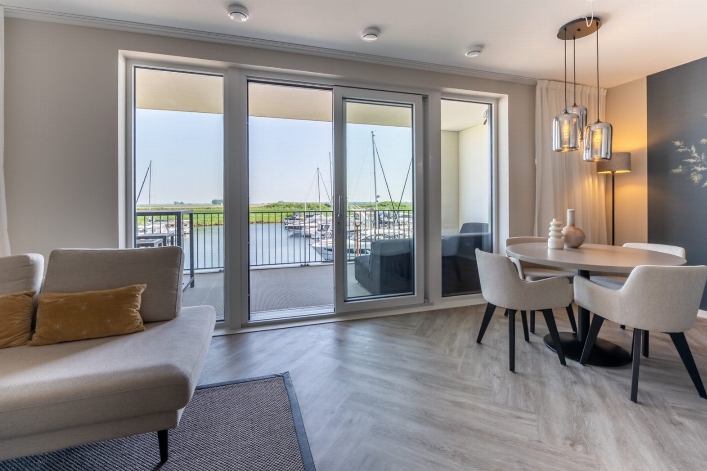 De sfeervol ingerichte woonkamer is voorzien van een comfortabele zithoek en een Smart TV met buitenlandpakket. Vanuit de woonkamer heeft u toegang tot het ruime terras op het zuiden met comfortabele loungeset en gezellige bartafel. Hier kunt u tot in de late uren genieten van het prachtige uitzicht op de levendige jachthaven en het Veerse Meer. De ruime luxe ingerichte keuken is voorzien van comfort inbouwapparatuur, o.a. een inductiekookplaat, een koelkast met vriesvak en een Nespresso koffiemachine.