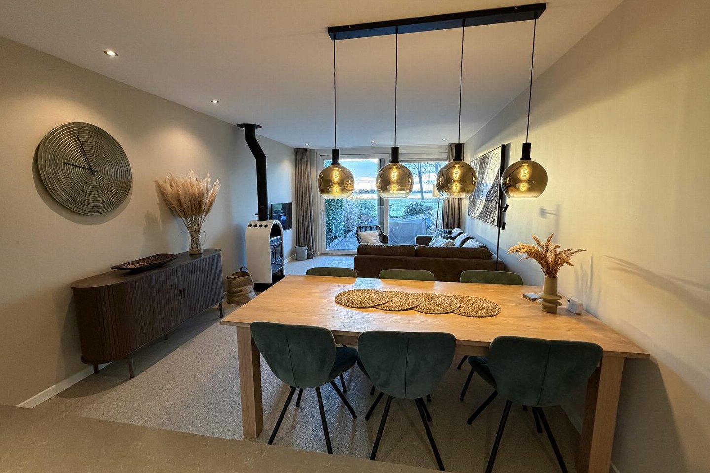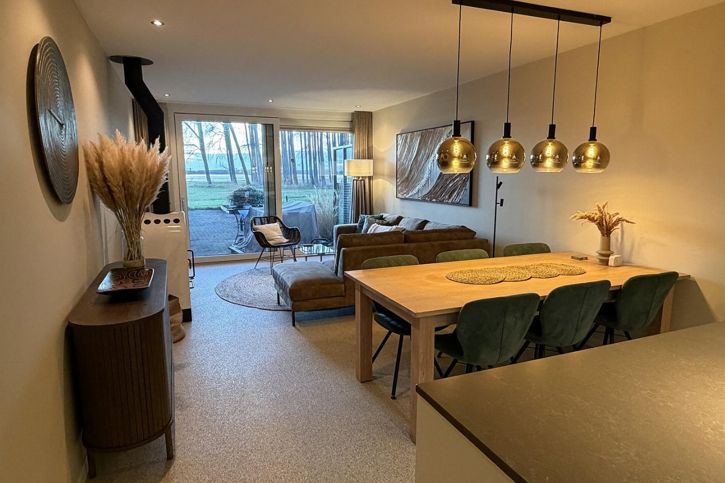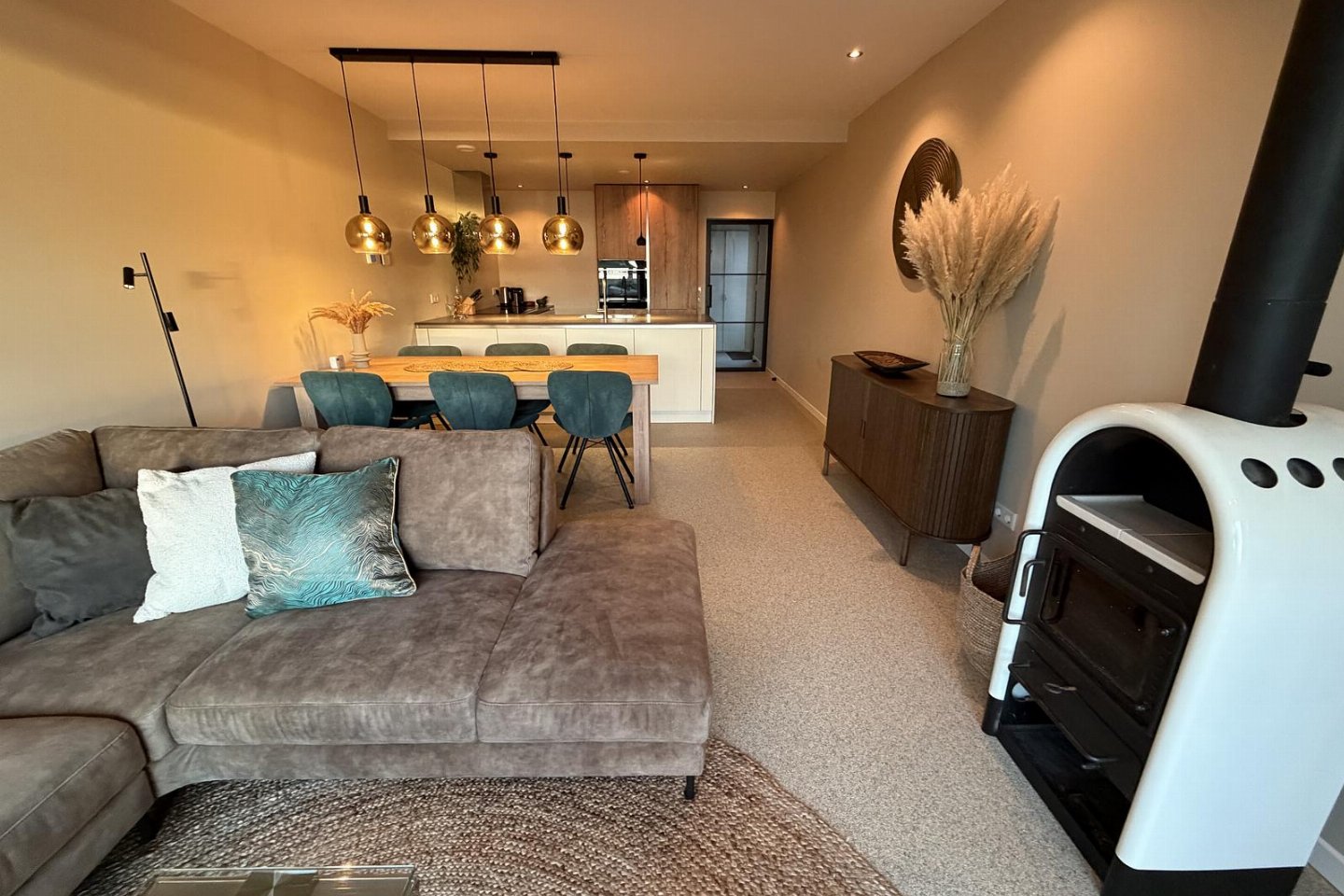 Vanuit de woonkamer en luxe open keuken heeft u een panoramisch uitzicht over het meer. De woonkamer is voorzien van een flatscreen en een sfeervolle houtkachel. De moderne open keuken is voorzien van alle comfort en heeft o.a. een grote inductiekookplaat, een vaatwasser, een grote koel-vriescombinatie, een oven en een Nespresso koffiemachine.