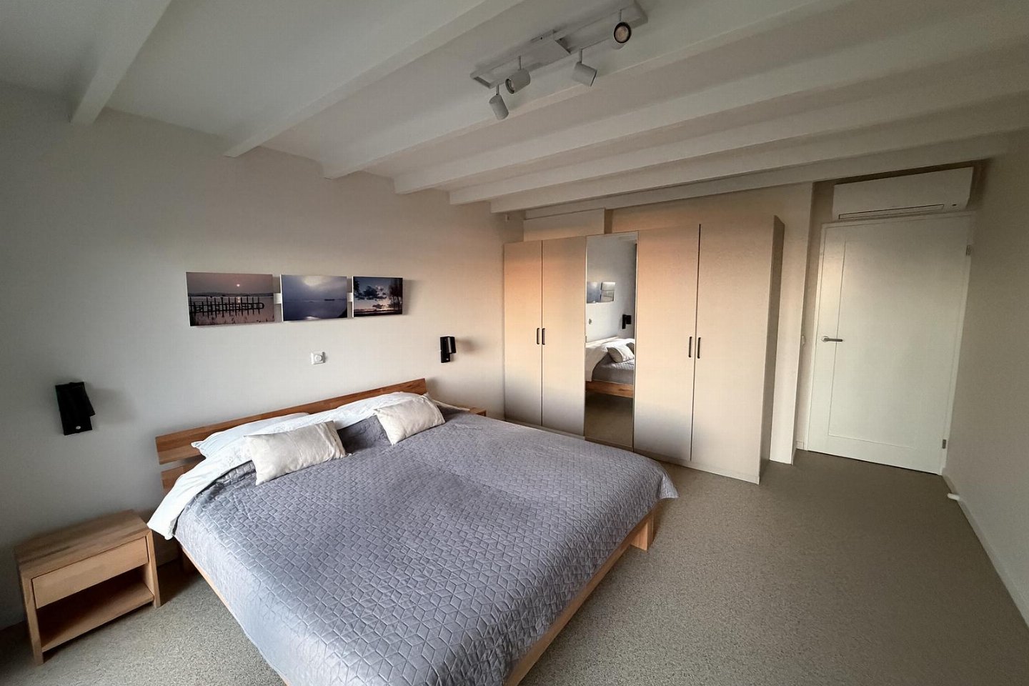 Op de eerste verdieping is een ruime slaapkamer voorzien van een tweepersoonsbed, voldoende bergruimte en directe toegang tot een prachtig dakterras. Hier kunt u genieten van een schitterend uitzicht onder het genot van een heerlijk kopje koffie. 's Avonds is dit de perfecte plek om te genieten van een prachtige zonsondergang met zicht op Veere. Op deze verdieping vindt u ook de luxe badkamer, uitgerust met een dubbele wastafel en een inloopdouche. De wasmachine bevindt zich eveneens in deze ruimte, netjes weggewerkt in een kast met schuifdeur.