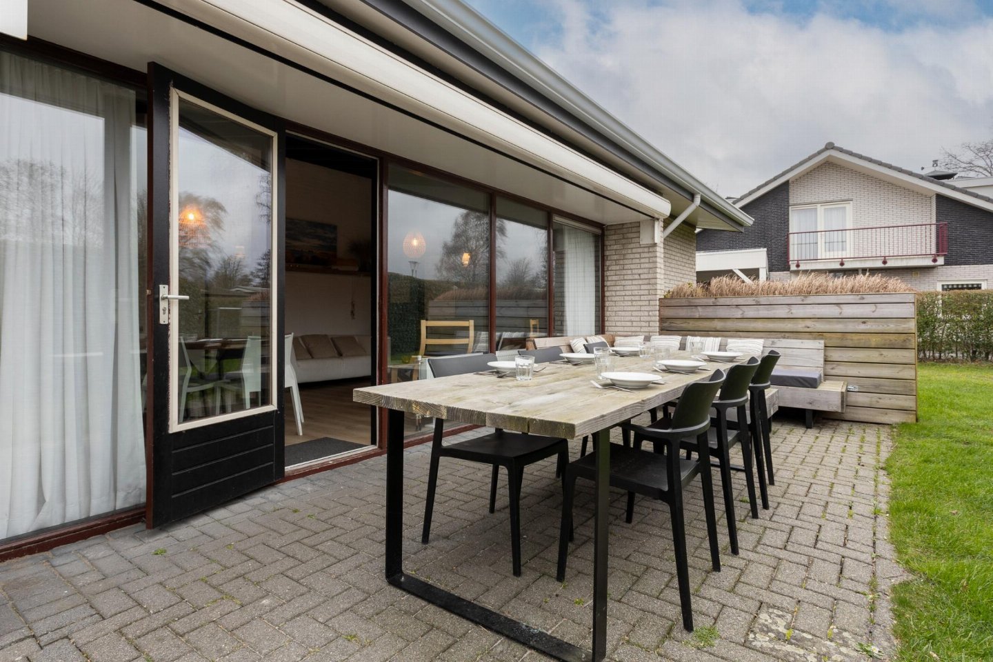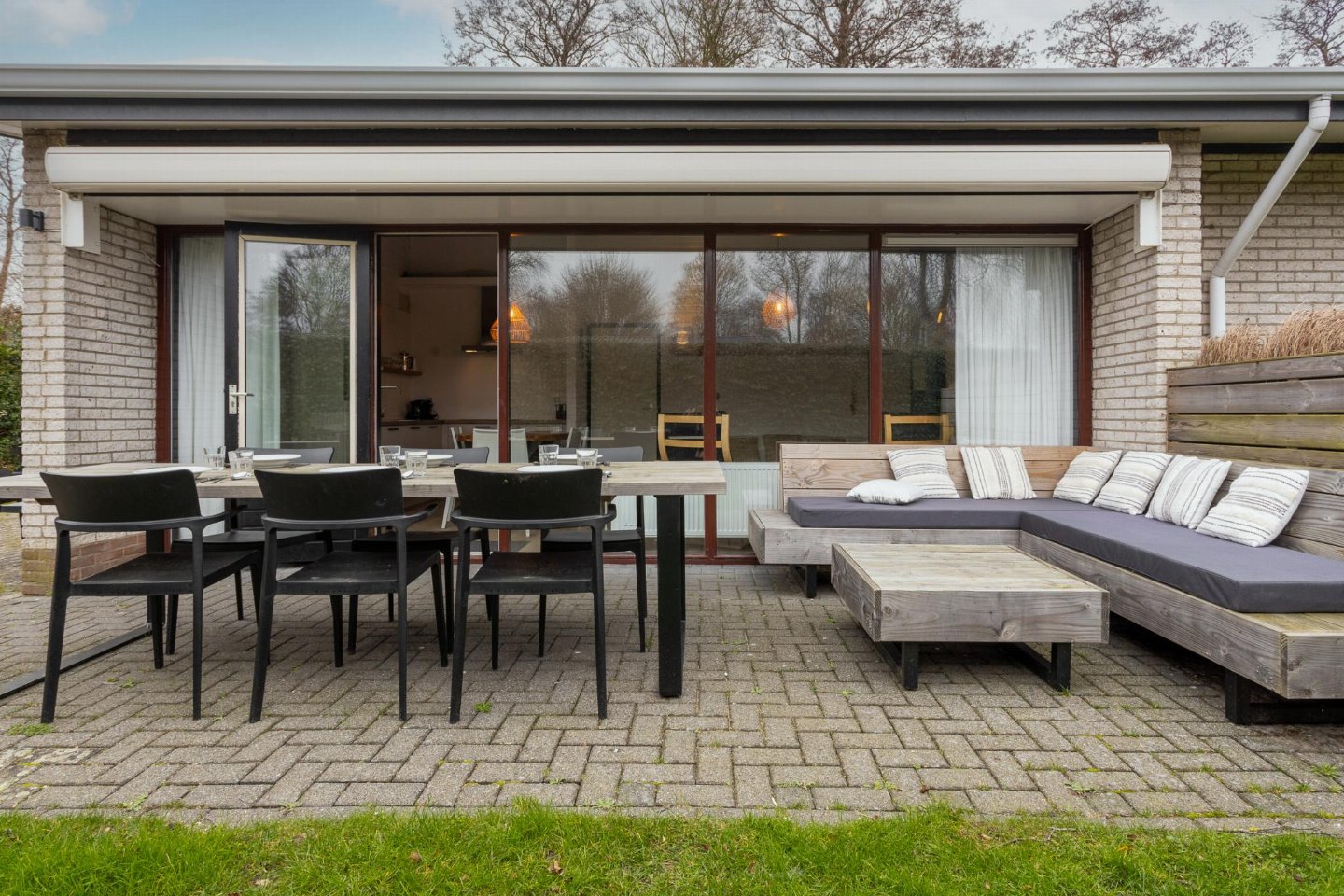 Begane grond: woonkamer, open keuken met kookplaat, magnetron, afwasmachine, koelkast , slaapkamer met 2-pers. bed , slaapkamer met 2-pers. bed , slaapkamer met 2-pers. bed , slaapkamer met 1-pers. bed, stapelbed , badkamer met wasbak, douche, wc