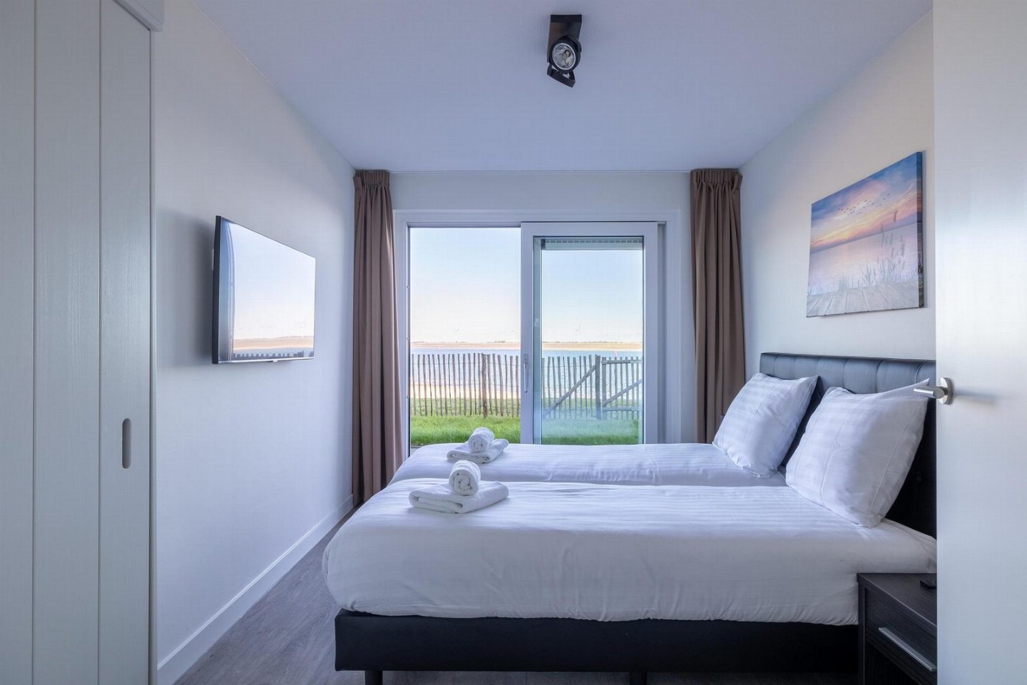 Beide slaapkamers liggen aan de achterzijde, met adembenemend uitzicht op de Oosterschelde. Stap direct vanuit je kamer de tuin in en wandel zo naar het strand. Elke kamer is voorzien van een tweepersoonsbed (160x200cm), nachtkastjes, sfeervolle bedverlichting en een ruime kledingkast.