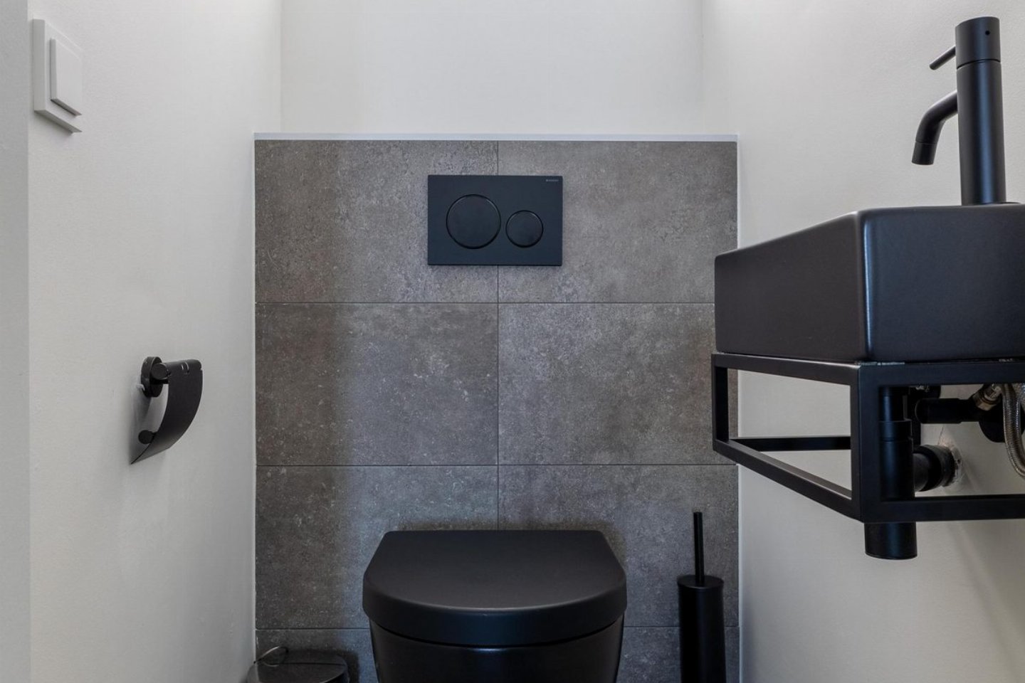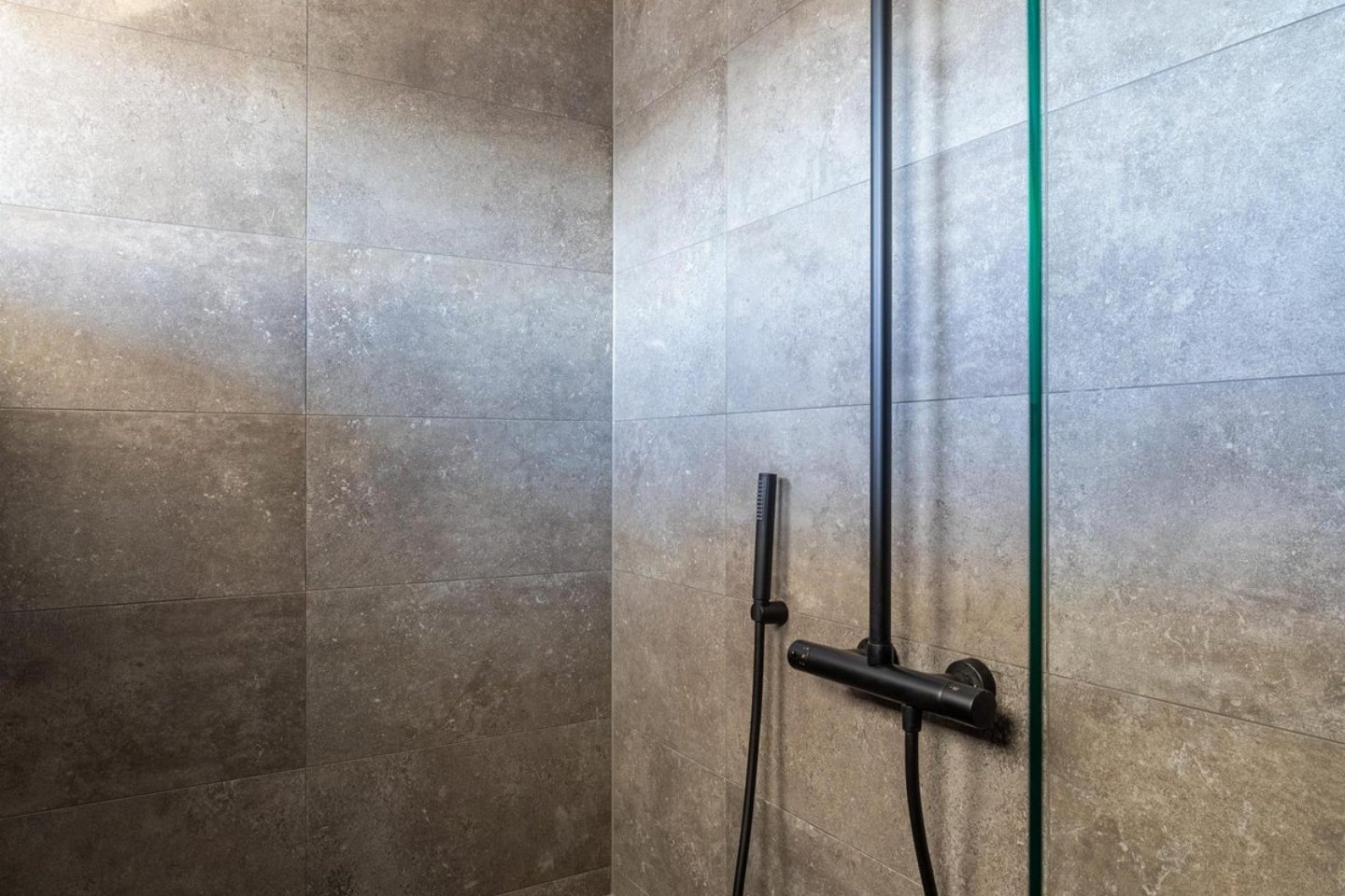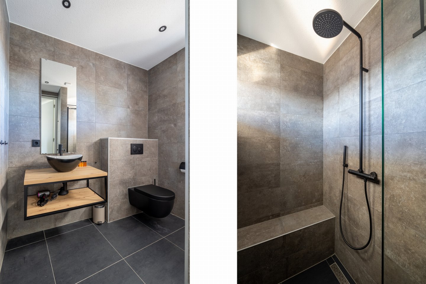 De badkamer biedt luxe en comfort met een heerlijke douche (inclusief zitmogelijkheid), een wastafel met spiegel en wat extra opbergruimte. Er is ook een tweede toilet. Het andere toilet met fonteintje bevindt zich naast de badkamer.
